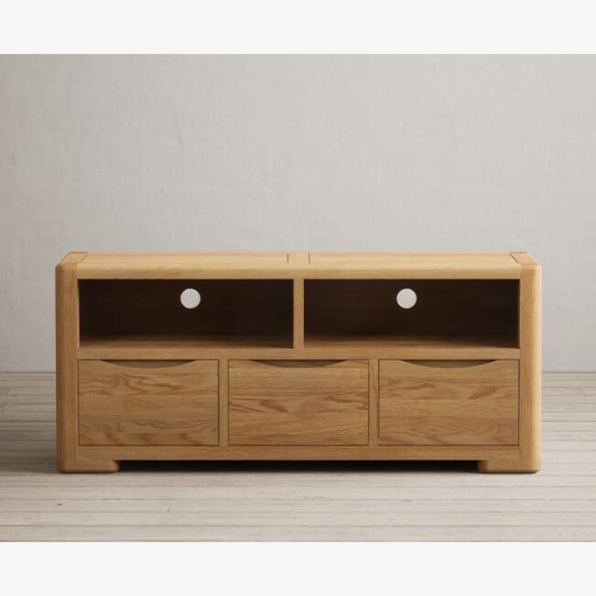 The Harper Solid Oak Large TV Cabinet features a natural finish and smooth edges for a modern look, complete with a Dovetail drawer with a recessed handle and cable management hole.