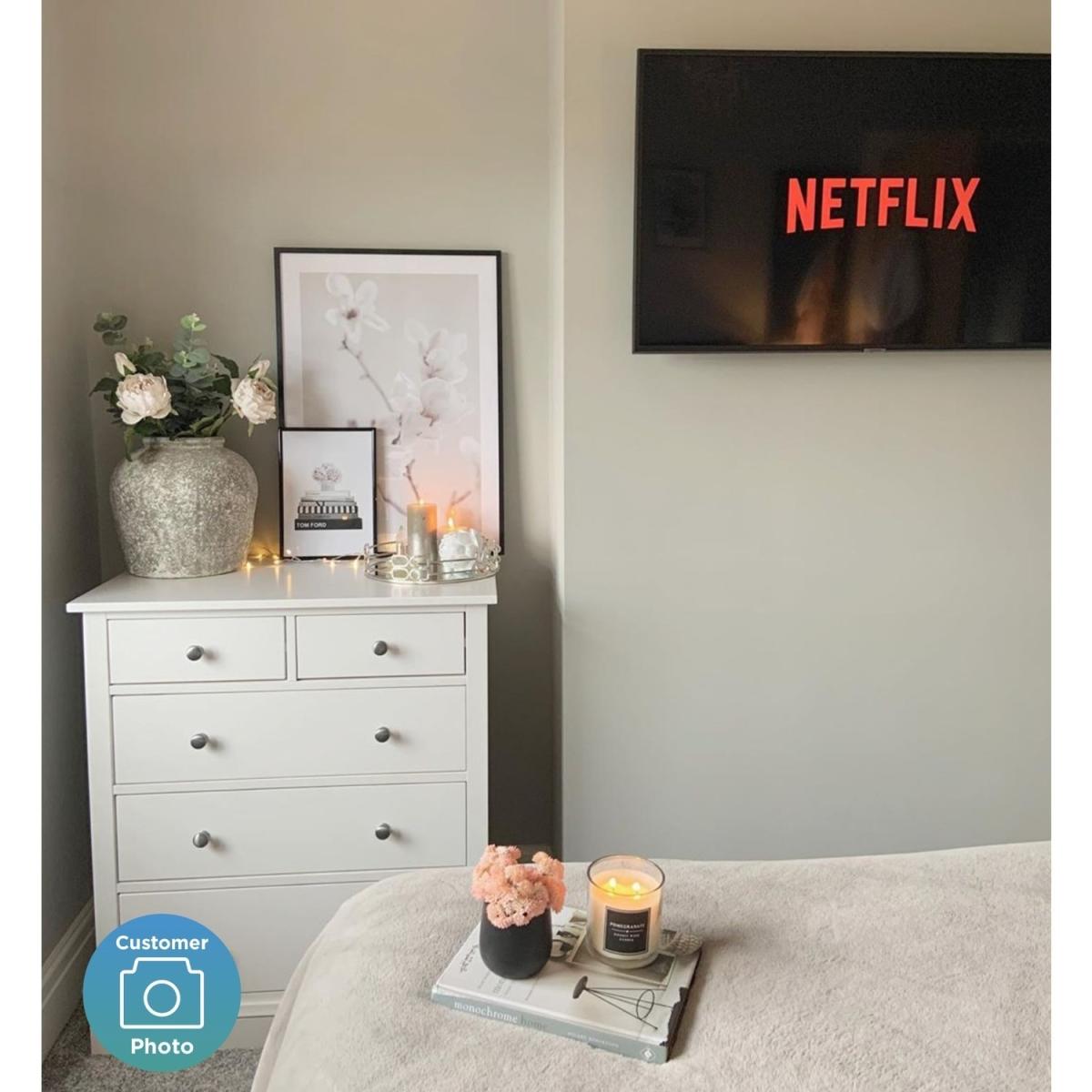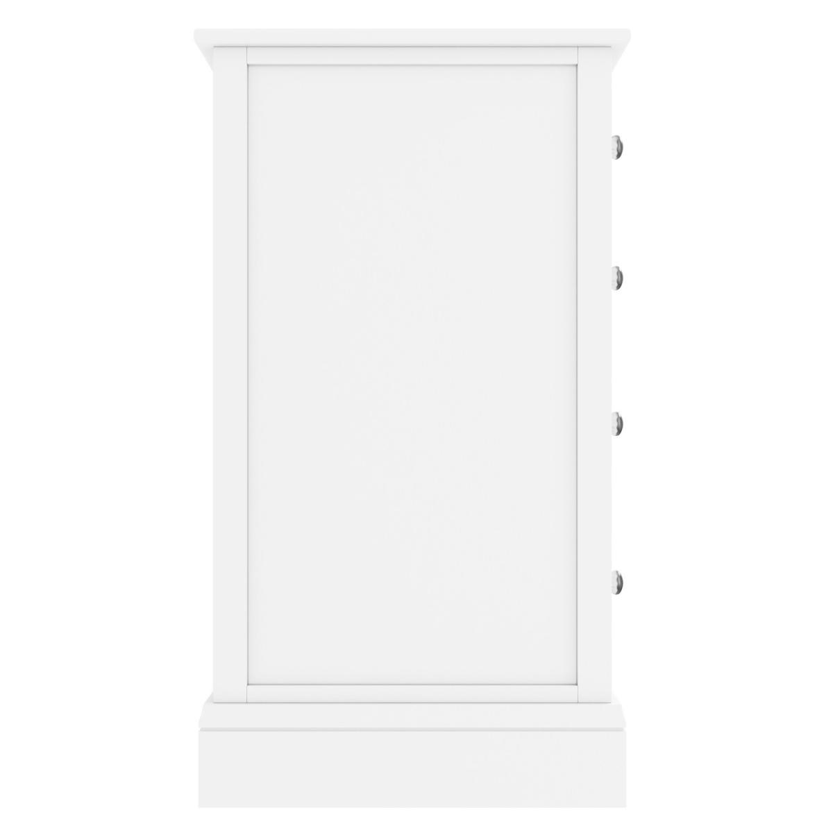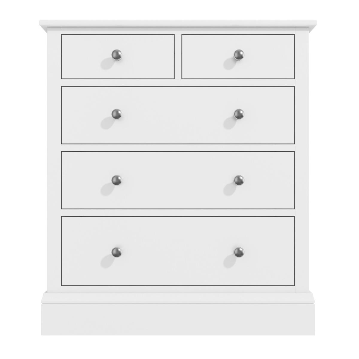 The Harper range has an understated design that will compliment both modern and traditional interior décor schemes. Its characterised by clean edges and simple lines, finished in pure white which brings a sense of light and space to the bedroom. This five drawer chest is durable and visually appealing with its clean and classic aesthetic. It's been crafted from solid wood with a fresh white painted and lacquered finish. Housing three full width drawers and two smaller drawers there's plenty of space to store and organise folded items. The drawers have durable wooden runners and have been finished beautifully with simple knob handles in shiny chrome. The surface top comes in handy for a bedroom TV or dresser space to display perfume bottles and trinkets.