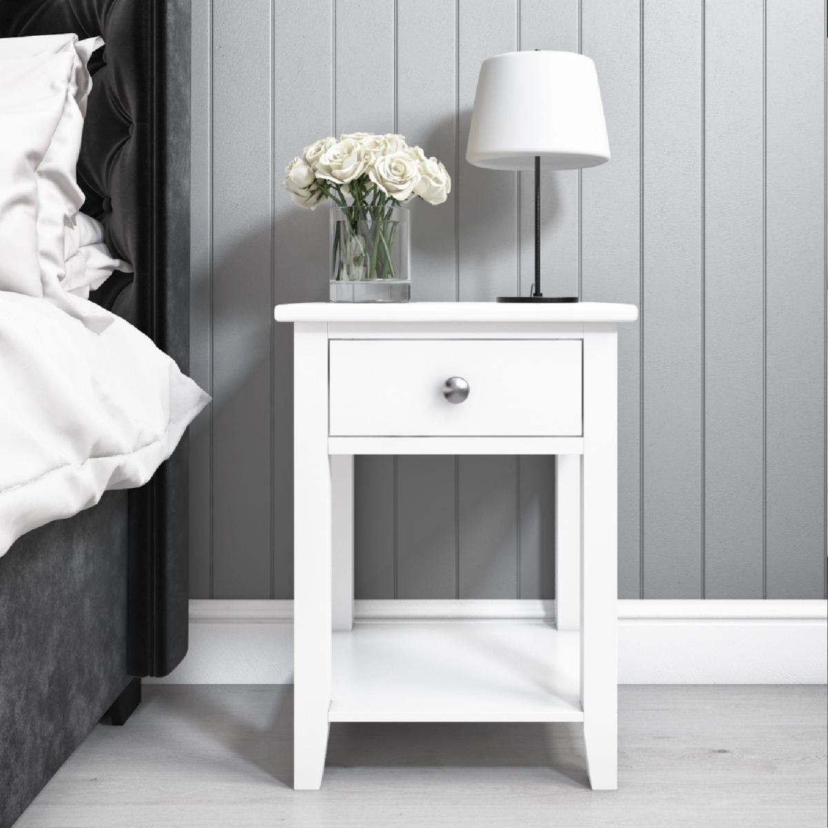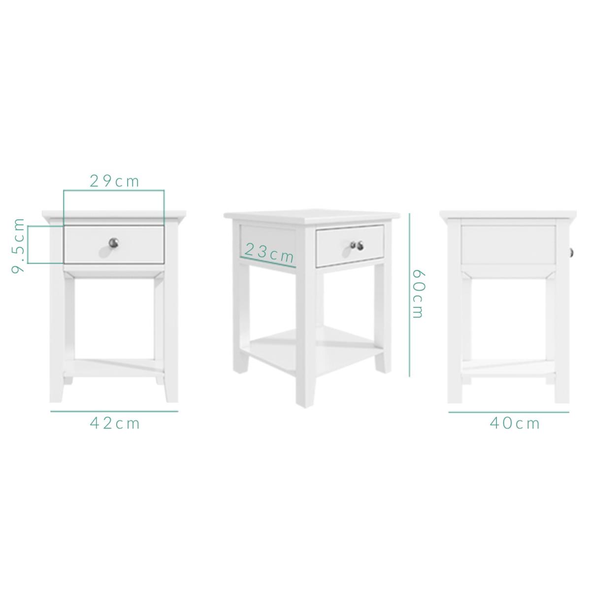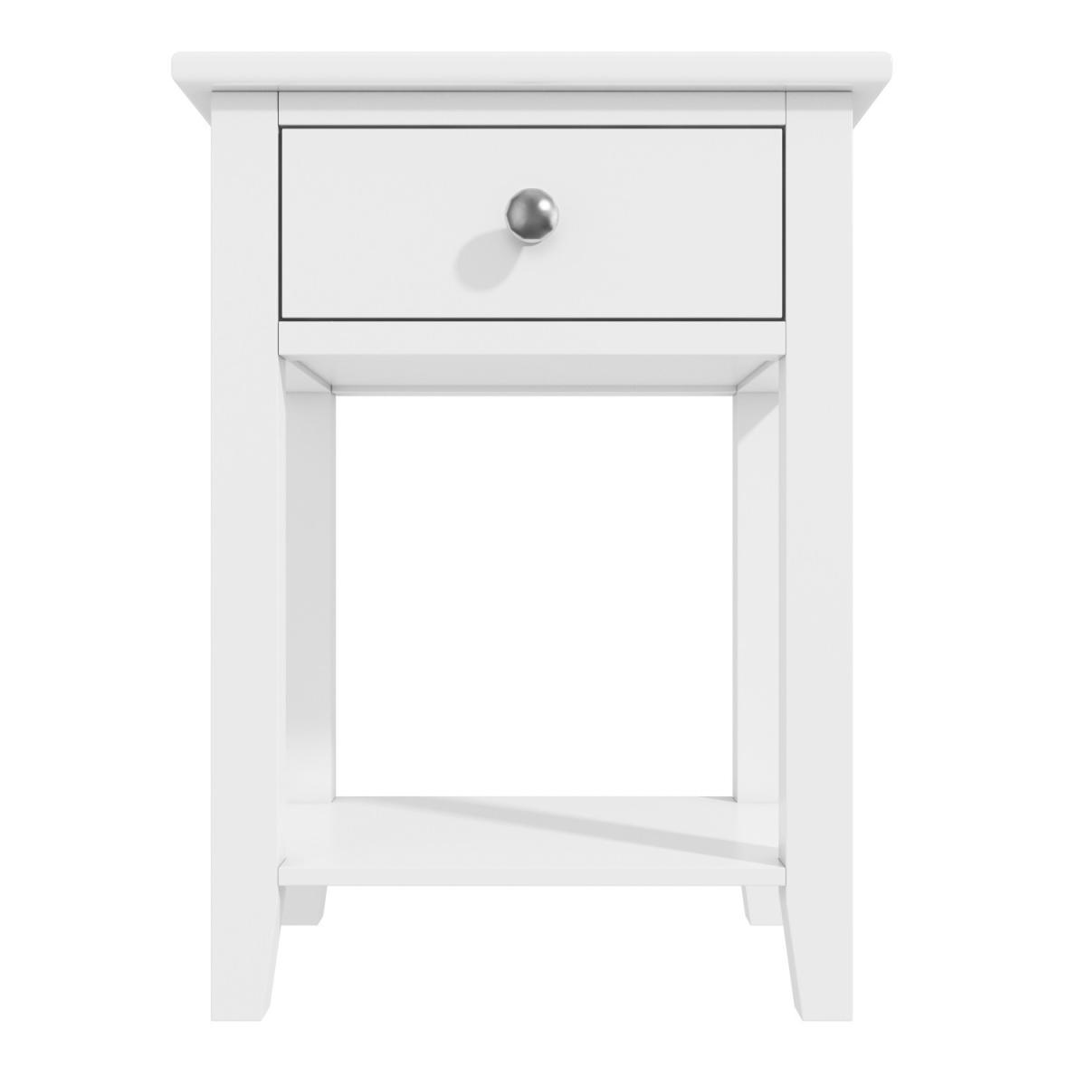 Features we love It's an exclusive design so you won't find it anywhere else!Understated design that will complement both modern and traditional interior décor. A fresh white finish adds a sense of light to your space. Crafted from solid wood it's highly durable. Plenty of storage for bedside essentials with a drawer and open shelving space Assembly required All about me. The Harper range has an understated design that will compliment both modern and traditional interior décor schemes. Its characterised by clean edges and simple lines finished in pure white which brings a sense of light and space to the bedroom. This neat bedside table is durable and visually appealing with its clean and classic aesthetic. It's been crafted from solid wood with a fresh white painted and lacquered finish. It houses a single drawer and an open shelving space giving ample storage for bedtime essentials. The drawer has durable wooden runners and has been finished beautifully with a simple knob handle in shiny chrome. Need to know. Dimensions. H60 x W42 x D40 cm Drawer dimensions. H9.5 x W29 x D23 cm Material. Solid wood Finish. Painted white Hardware. Shiny chrome Drawers. 1. Assembly required.