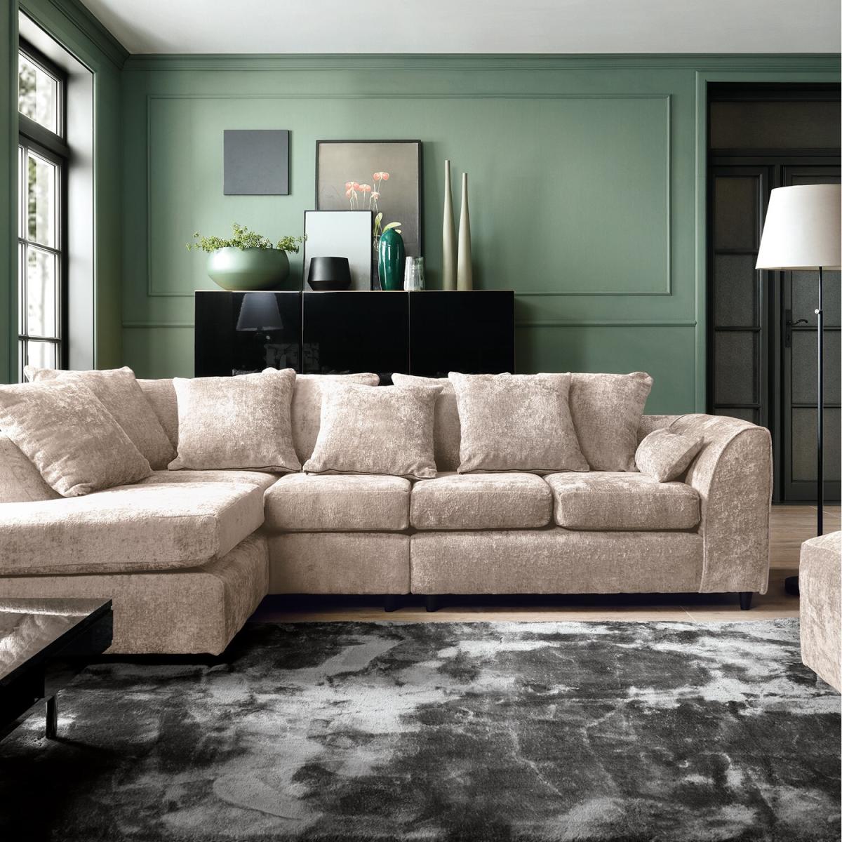 Upholstered in a sumptuous crushed chenille - a fuzzy cotton yarn of fabric that has pile protruding around the weave creating a caterpillar look. This luxuriously comfortable sofa features foam-filled seats, whilst the corner chaise section is the perfect place to put your feet up. Complete with eight cosy fibre-filled scatter cushions, this stunning medium size corner sofa would be a great addition to any modern home. Bring a touch of glamour to your home with the Harriet collection. All sections in the modular Harriet sofa series can be used freestanding or put together into exactly the combination you need.