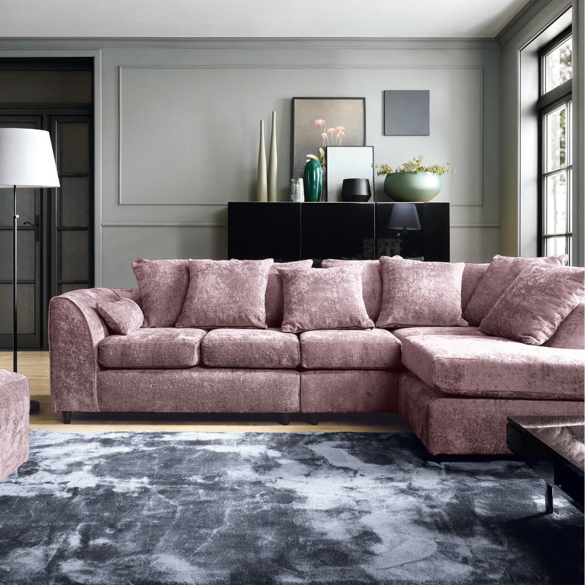 Upholstered in a sumptuous crushed chenille - a fuzzy cotton yarn of fabric that has a pile protruding around the weave creating a caterpillar look. This luxuriously comfortable sofa features foam-filled seats, whilst the corner chaise section is the perfect place to put your feet up. Complete with eight cosy fibre-filled scatter cushions, this stunning medium-sized corner sofa would be a great addition to any modern home. Bring a touch of glamour to your home with the Harriet collection. All sections in the modular Harriet sofa series can be used freestanding or put together into exactly the combination you need.