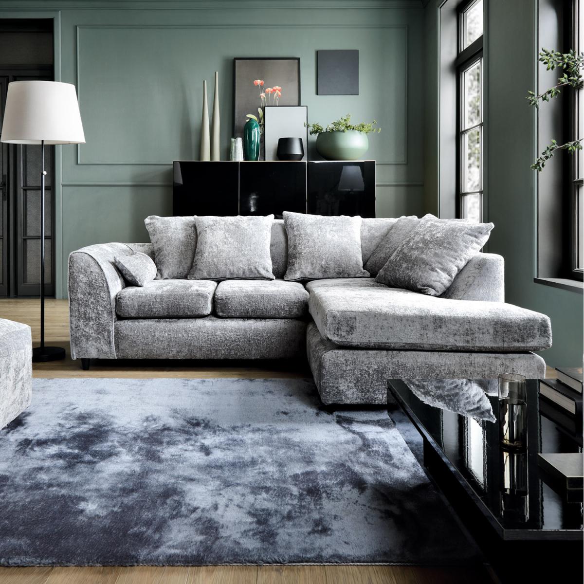 Upholstered in a sumptuous crushed chenille - a fuzzy cotton yarn of fabric that has a pile protruding around the weave creating a caterpillar look. This luxuriously comfortable sofa features foam-filled seats, whilst the corner chaise section is the perfect place to put your feet up. Complete with seven cosy fibre-filled scatter cushions, this stunning compact corner sofa would be a great addition to any modern home. Bring a touch of glamour to your home with the Harriet collection. All sections in the modular Harriet sofa series can be used freestanding or put together into exactly the combination you need.