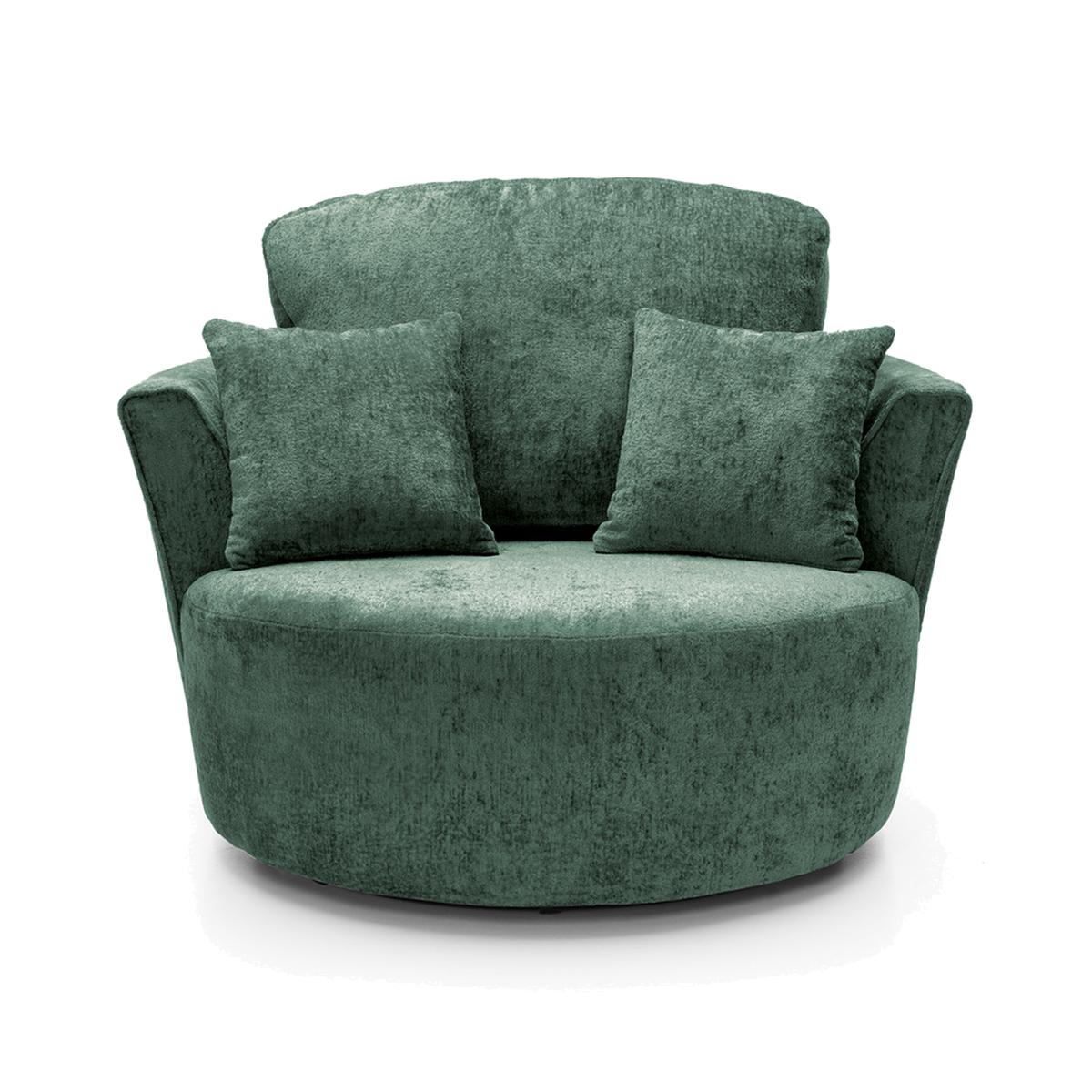 Swivel in style with this stunning 360 swivel chair. Generous for one and a very cosy for two, this might just be your new favourite seat in the house. A thick seat cushion, tall flared back and a couple of toss pillows rested on a half-moon pared back doubling as an armrest will leave you with nothing to complain about. You could be watching the telly one moment and swivel around to join the family conversation the very next moment. A stylish, comfortable and versatile chair, always at your service.