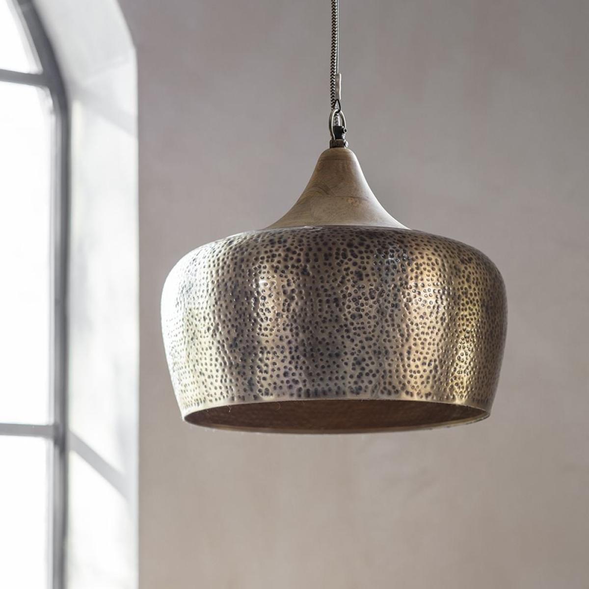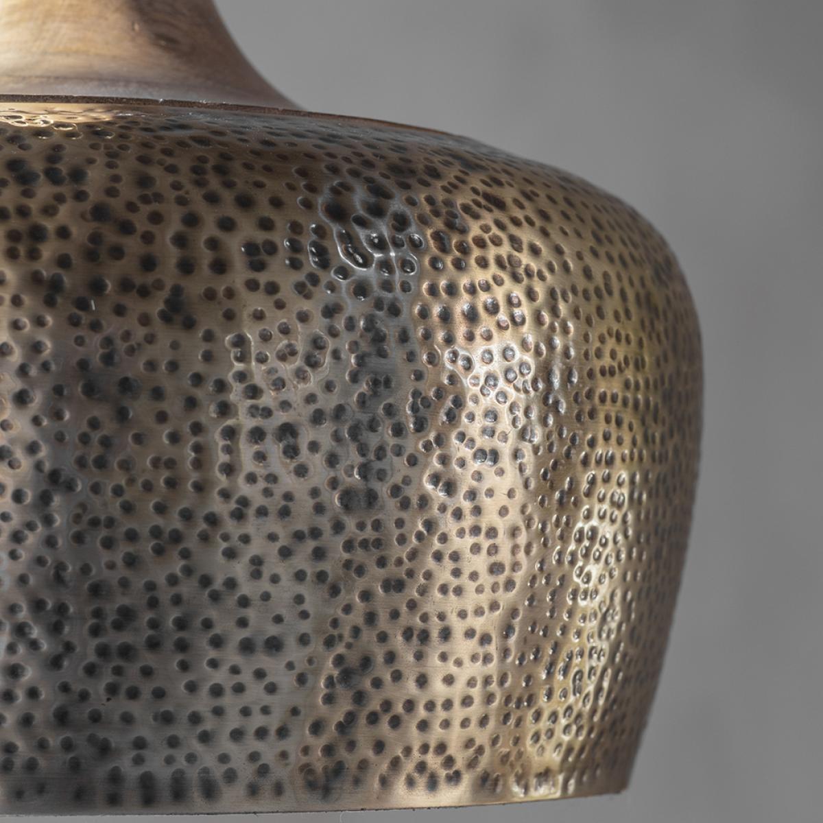 Our Harriet Pendant Light is a stunning hand-crafted hammered pendant light made from iron with a spectacular dimpled effect. The soft brass colour creates instant impact in any room with any style, from classic to contemporary, industrial to art deco. This metal pendant light is expertly hand crafted from iron with a hammered dimpled effect for a beaten and authentic rustic look. Hang above the dining table for a relaxed glow while eating with family or friends or above a kitchen island or breakfast bar for task lighting when cooking and preparing food. The pendant also has a turned wood detail to the top for a natural, relaxed look. The soft brass colour is in keeping with the ongoing trend for metallics, complementing all interior styles and decors. Perfect for adding a statement focal point to your scheme, the Harriet Pendant Light is sure to create instant impact. Matching Harriet Table Lamp is also available.