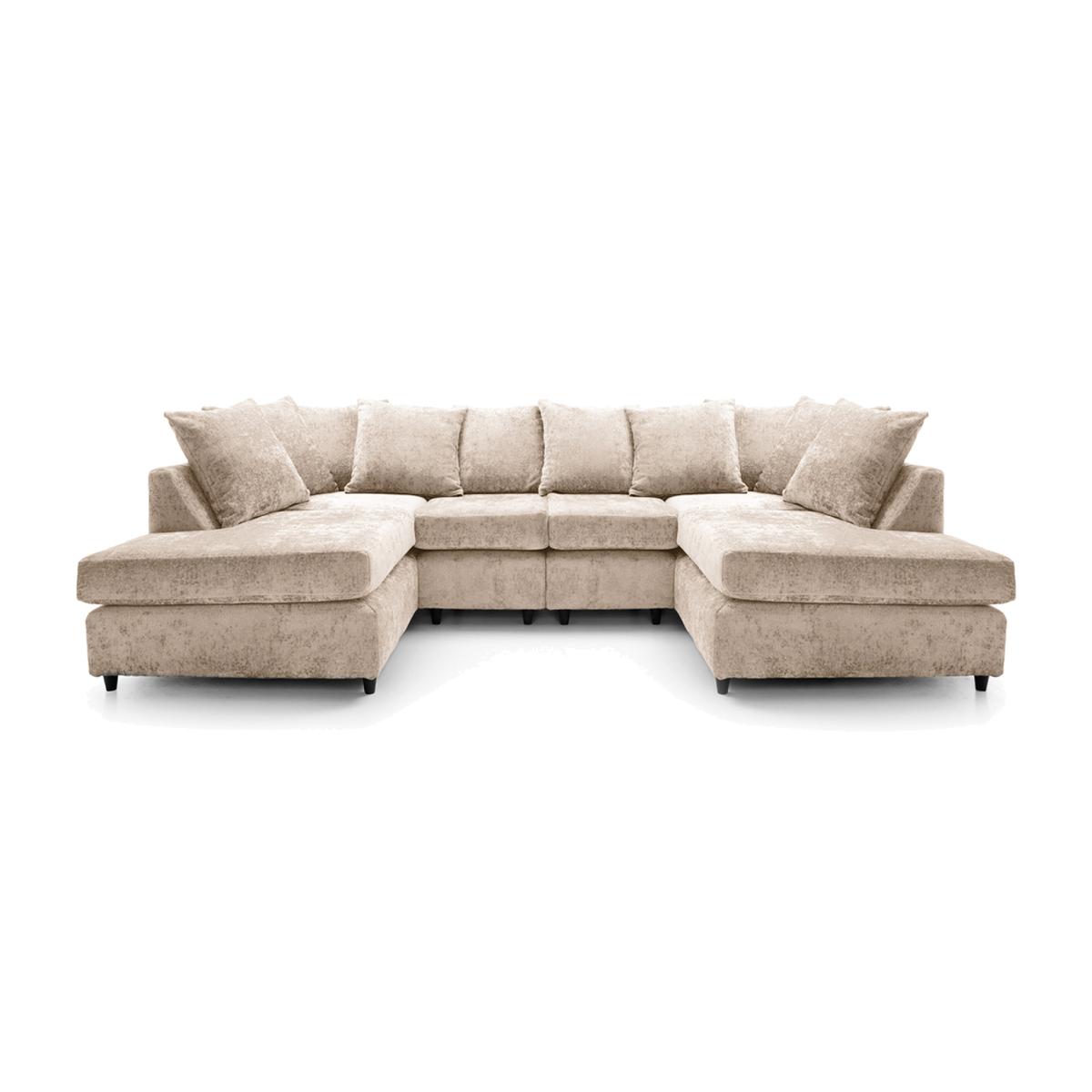 Upholstered in a sumptuous crushed chenille - a fuzzy cotton yarn of fabric that has pile protruding around the weave creating a caterpillar look. This luxuriously comfortable sofa features foam-filled seats, whilst the corner chaise section is the perfect place to put your feet up. Complete with ten cosy fibre-filled scatter cushions, this stunning big U-shaped corner sofa would be a great addition to any modern home. Bring a touch of glamour to your living room with the Harriet collection. All sections in the modular Harriet sofa series can be used freestanding or put together into exactly the combination you need.