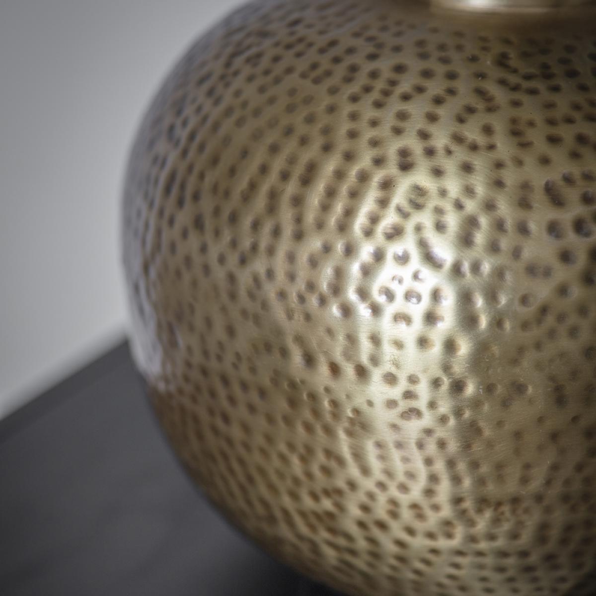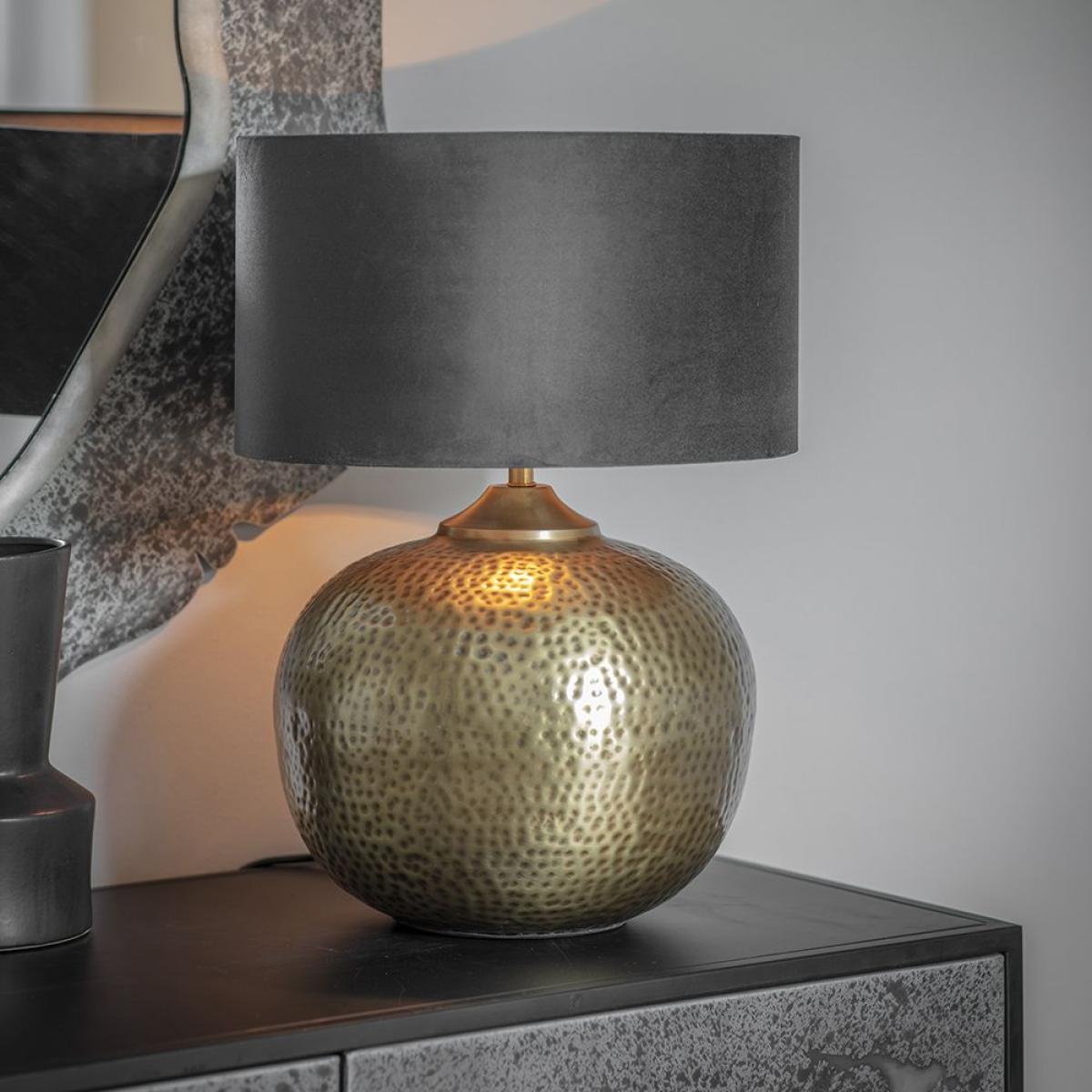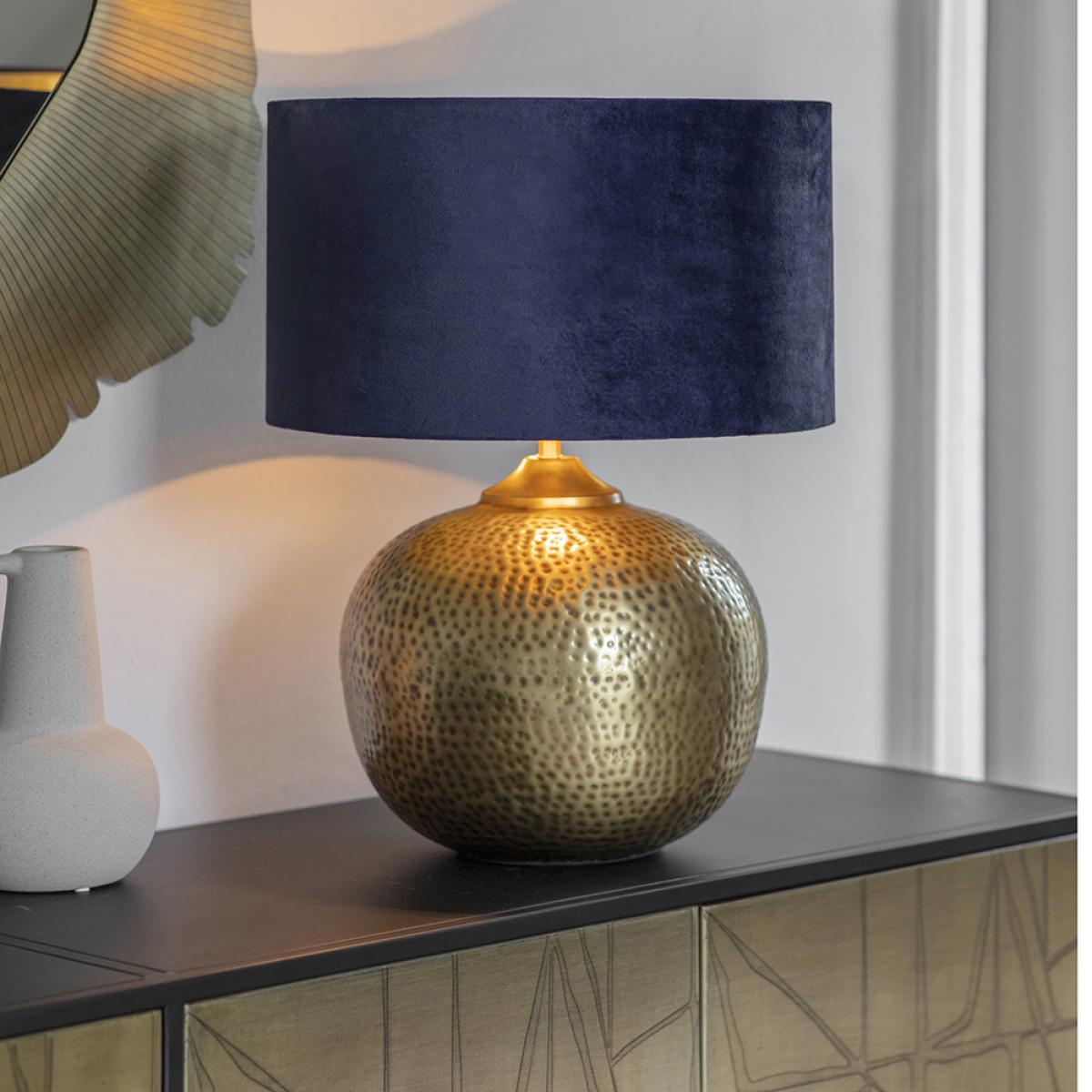 Our Harriet Table Lamp is a stunning hand-crafted hammered table light made from iron with an eye-catching dimpled effect. The warm brass finish is a real statement piece, adding texture to your space. A practical and distinctive design, this table lamp can be used to add the wow factor to your sideboard or side table. Expertly hand crafted from iron with a hammered and dimpled effect for a beaten and authentic rustic look, the Harriet Table Lamp looks stunning paired with a wooden sideboard to create a contrasting feel. A rich blue velvety shade meanwhile is perfect for enhancing the luxurious finish. The soft brass colour is in keeping with the ongoing trend for metallics, complementing all interior styles and decors. Ideal for adding a statement focal point to your scheme, the Harriet Table Lamp is sure to create instant impact. Matching Harriet Pendant Light is also available. Lampshade is for illustration purposes only and is not included.