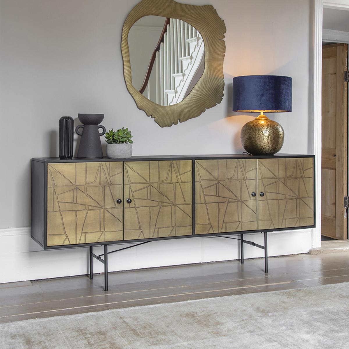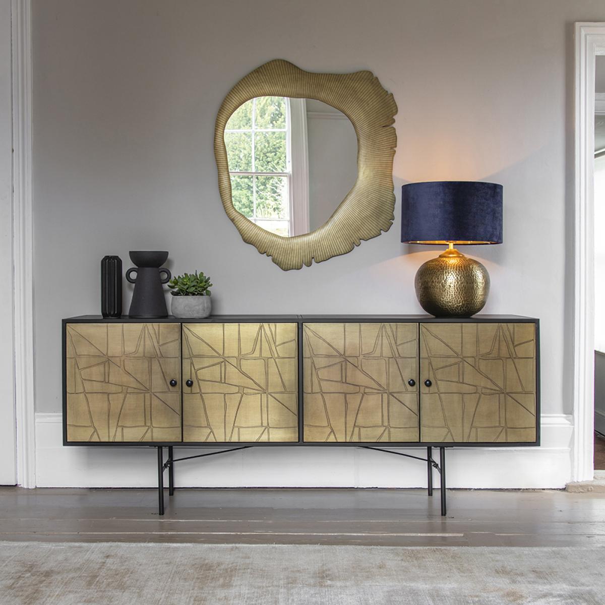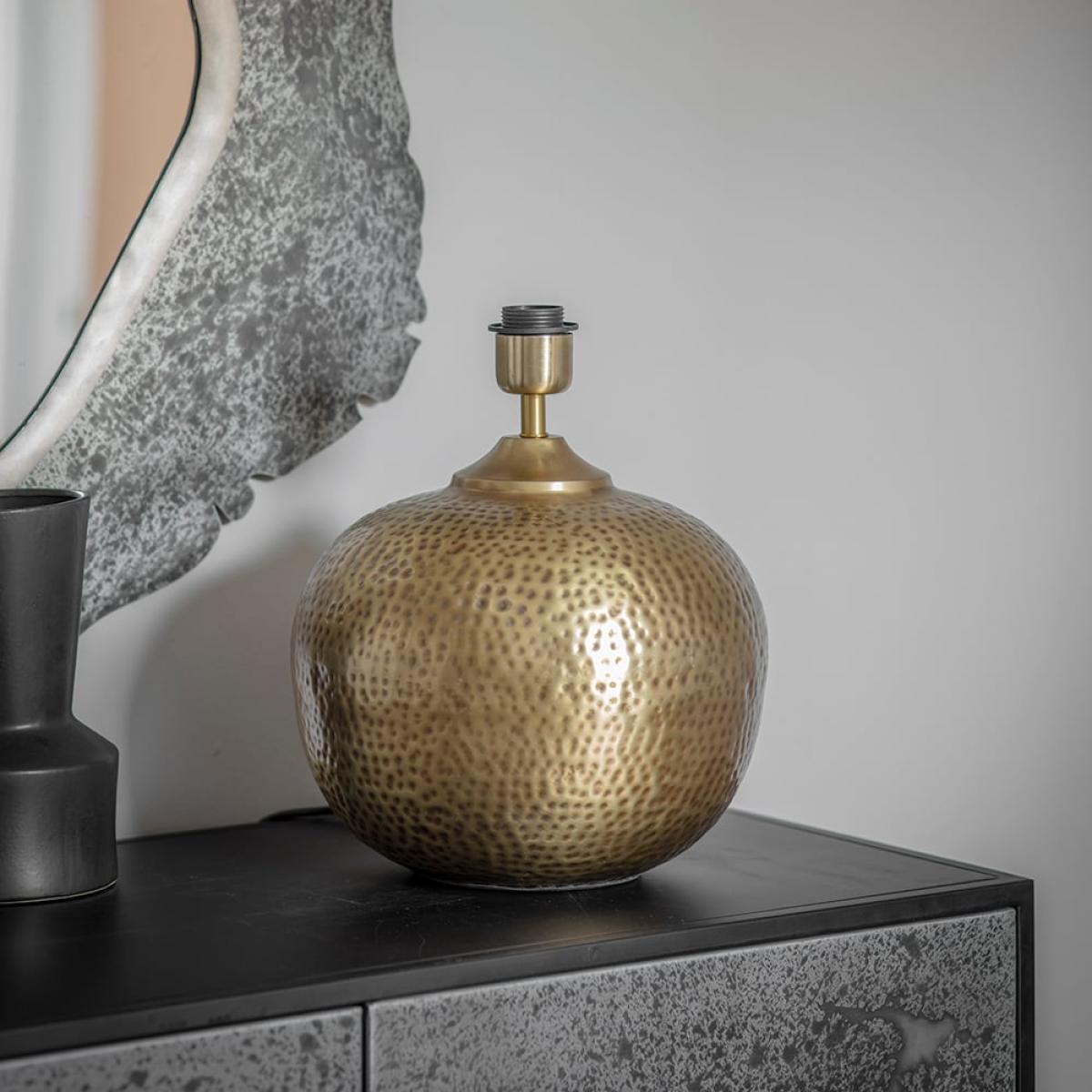 Our Harriet Table Lamp is a stunning hand-crafted hammered table light made from iron with an eye-catching dimpled effect. The warm brass finish is a real statement piece, adding texture to your space. A practical and distinctive design, this table lamp can be used to add the wow factor to your sideboard or side table. Expertly hand crafted from iron with a hammered and dimpled effect for a beaten and authentic rustic look, the Harriet Table Lamp looks stunning paired with a wooden sideboard to create a contrasting feel. A rich blue velvety shade meanwhile is perfect for enhancing the luxurious finish. The soft brass colour is in keeping with the ongoing trend for metallics, complementing all interior styles and decors. Ideal for adding a statement focal point to your scheme, the Harriet Table Lamp is sure to create instant impact. Matching Harriet Pendant Light is also available. Lampshade is for illustration purposes only and is not included.