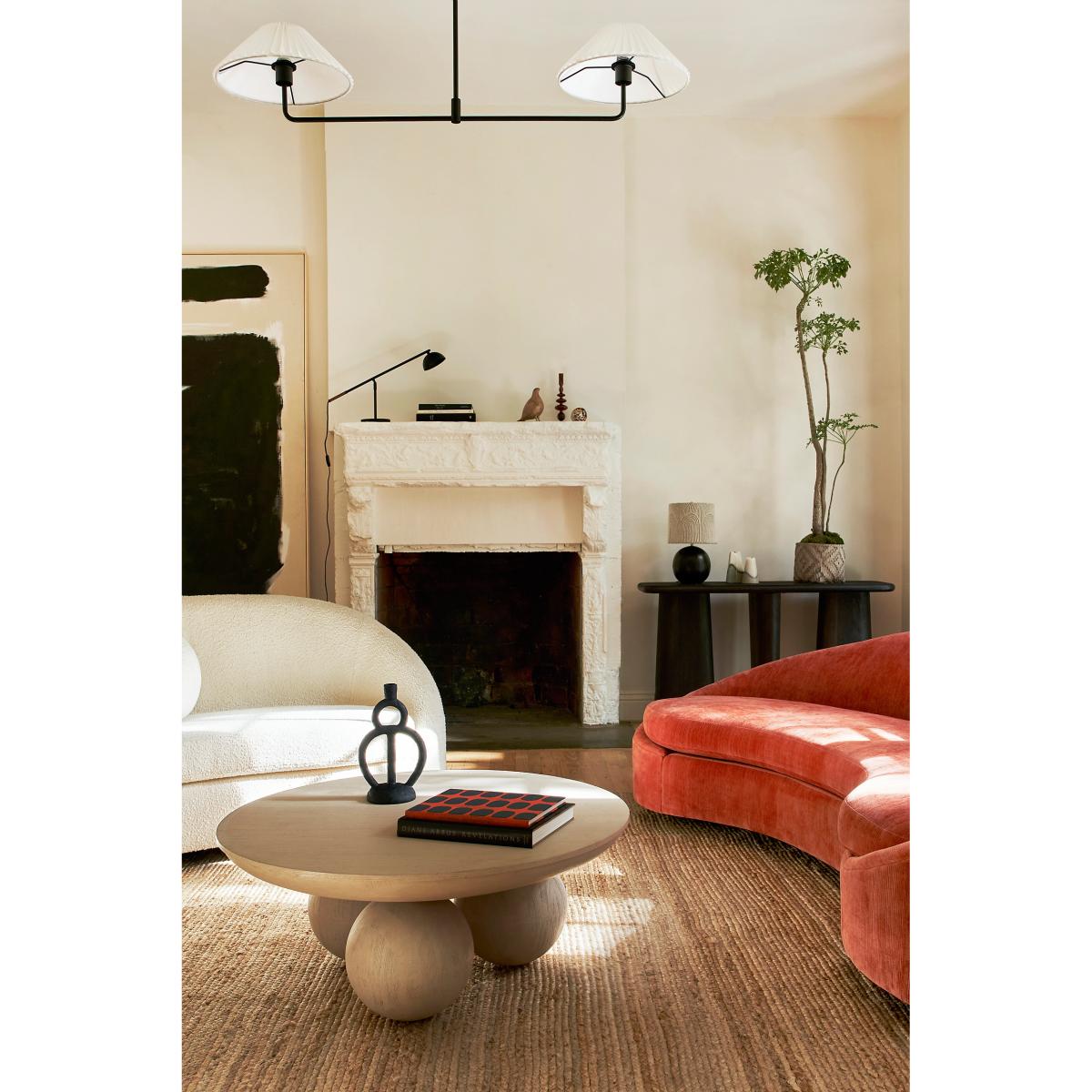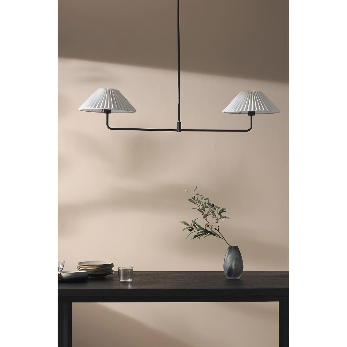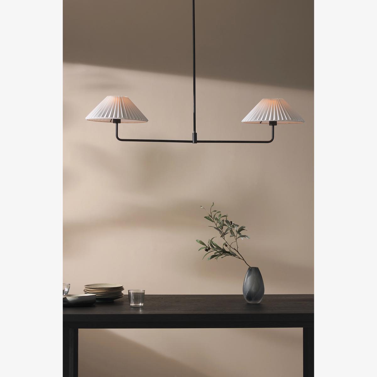 With pleated paper shades, this unique chandelier is both visually intriguing and elegant. *This item is CE listed, meaning it has been tested and approved to meet the government-regulated safety standards for the UK. Use with electrical outlets of 230v or lower, as anything higher can cause fire or injury. If you're purchasing this item for use outside of the United Kingdom, employ the adapter and voltage converter suited for your country* * Steel frame; pleated paper shades * Hardwired; professional installation recommended * Can be installed with a dimmer * Includes mounting plate and pole kit * Two light sockets * 100 watt max * We recommend using type A / E12 bulbs * CE listed * Imported