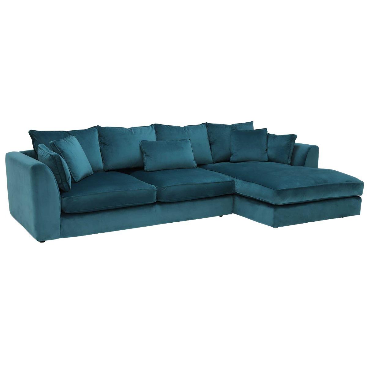 The striking Harrington Large Right Hand Facing Chaise Sofa in Fibre Interiors is a fantastic addition to a home looking for something a little different. Upholstered in a bold Lumino Teal, and featuring a contemporary shape with elegantly tapered arms and a cushion back for an informal feel, it is sure to make a statement. Offering a spacious seating area for everyday lounging, this gorgeous Harrington corner sofa will really make the most of your living room.  The Harrington range features a contemporary design with a luxury velvet finish and elegant tapered arms. Deep seated feather and fibre filled cushions add sumptuous comfort.