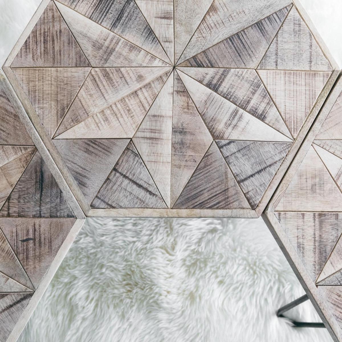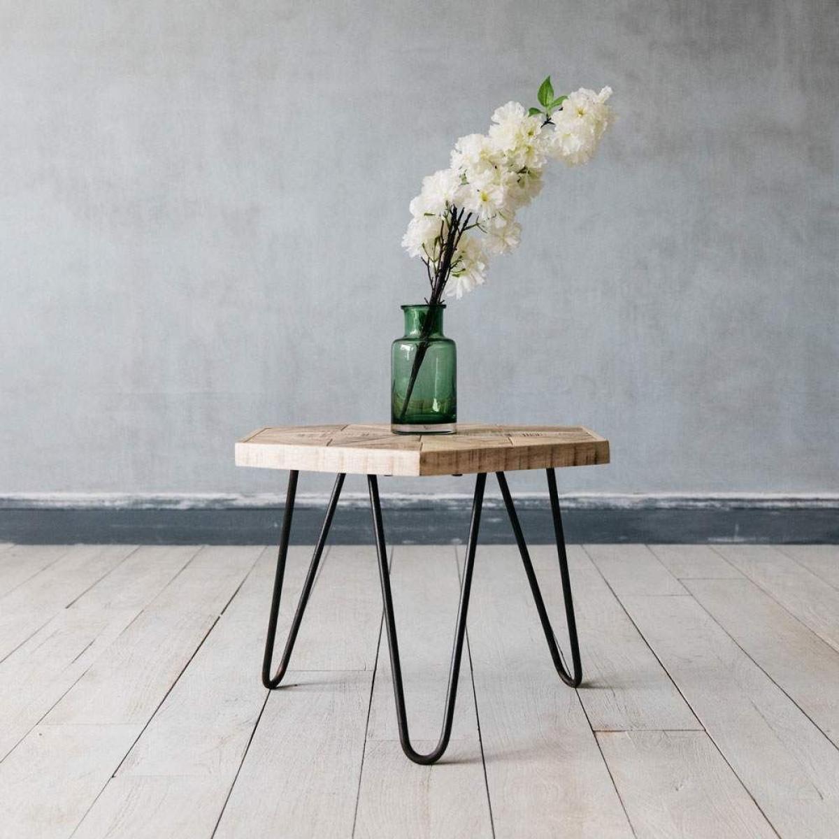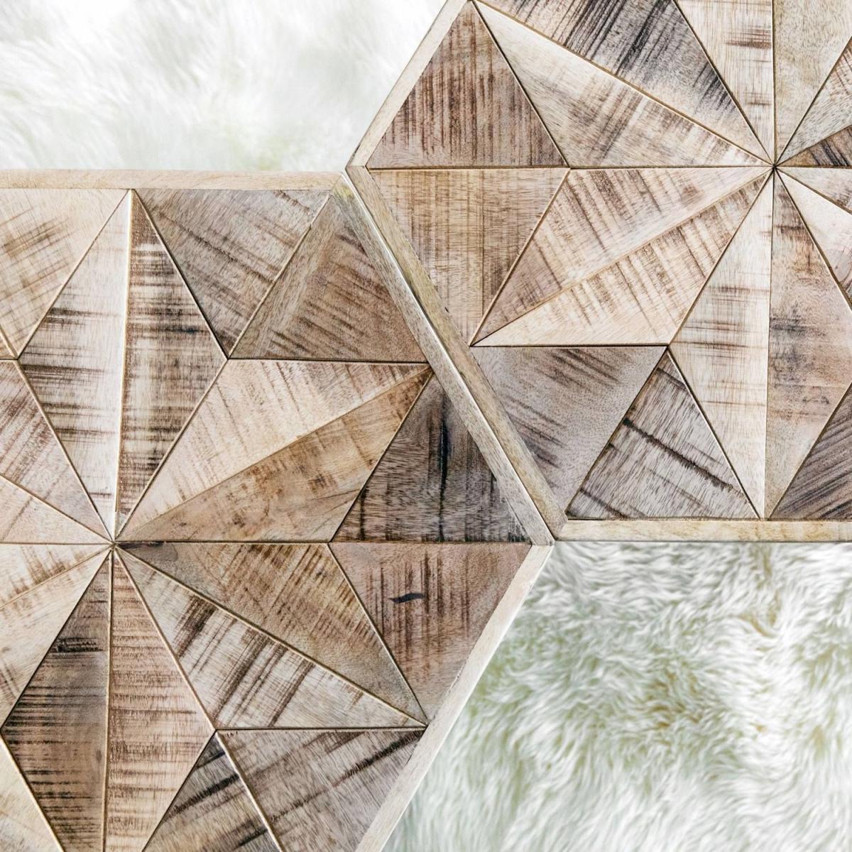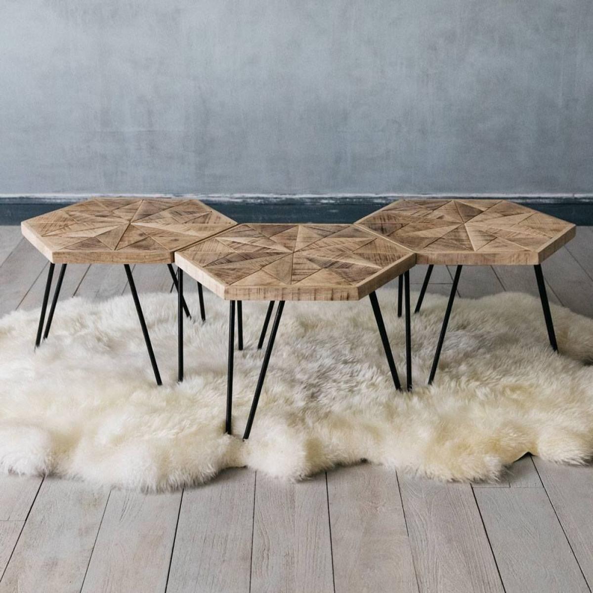 Our Harris hexagon table is a handsome table top exuding classic mid-century style. Its geometric table top features a distinctive parquet chevron pattern handcrafted from rustic, eco-friendly mango wood. Complete with beaten black iron hairpin legs, join two or three tables together to create a statement centrepiece for your sitting room.