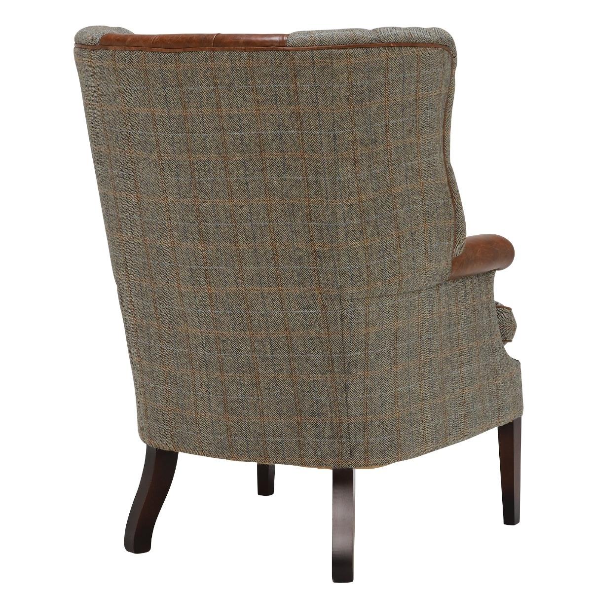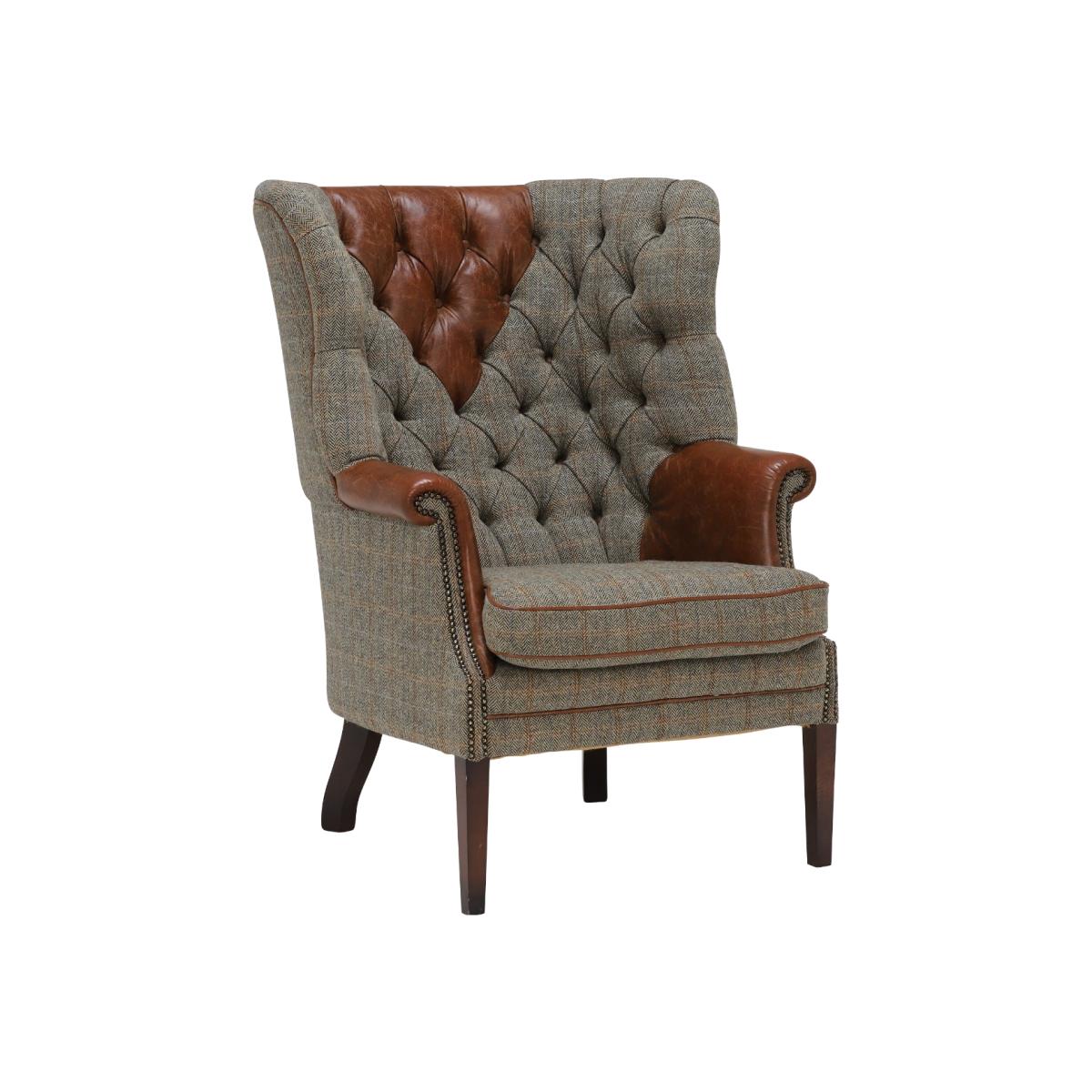 Design. The Harris Tweed Mackenzie Chair has a classic wing back design which is sure to add charm to any space. Crafted from genuine Harris Tweed and quality produced hide to create a contrasting look, this piece has been expertly manufactured in the UK using traditional methods. Comprising a high webbed back and feather filled seat cushions, you’ll. Sink intocomfort with ease. Scrolled arms with hand studded features offer a classy detail that adds to the charm of the M. Ackenzie. Its statement deep button back emphasizes the. English. Heritage crafted into this piece and. Will add plenty of character to your living room. Image shows Bracken Herringbone tweed fabric, Bromptan Tan hide, and polished hardwood legs.