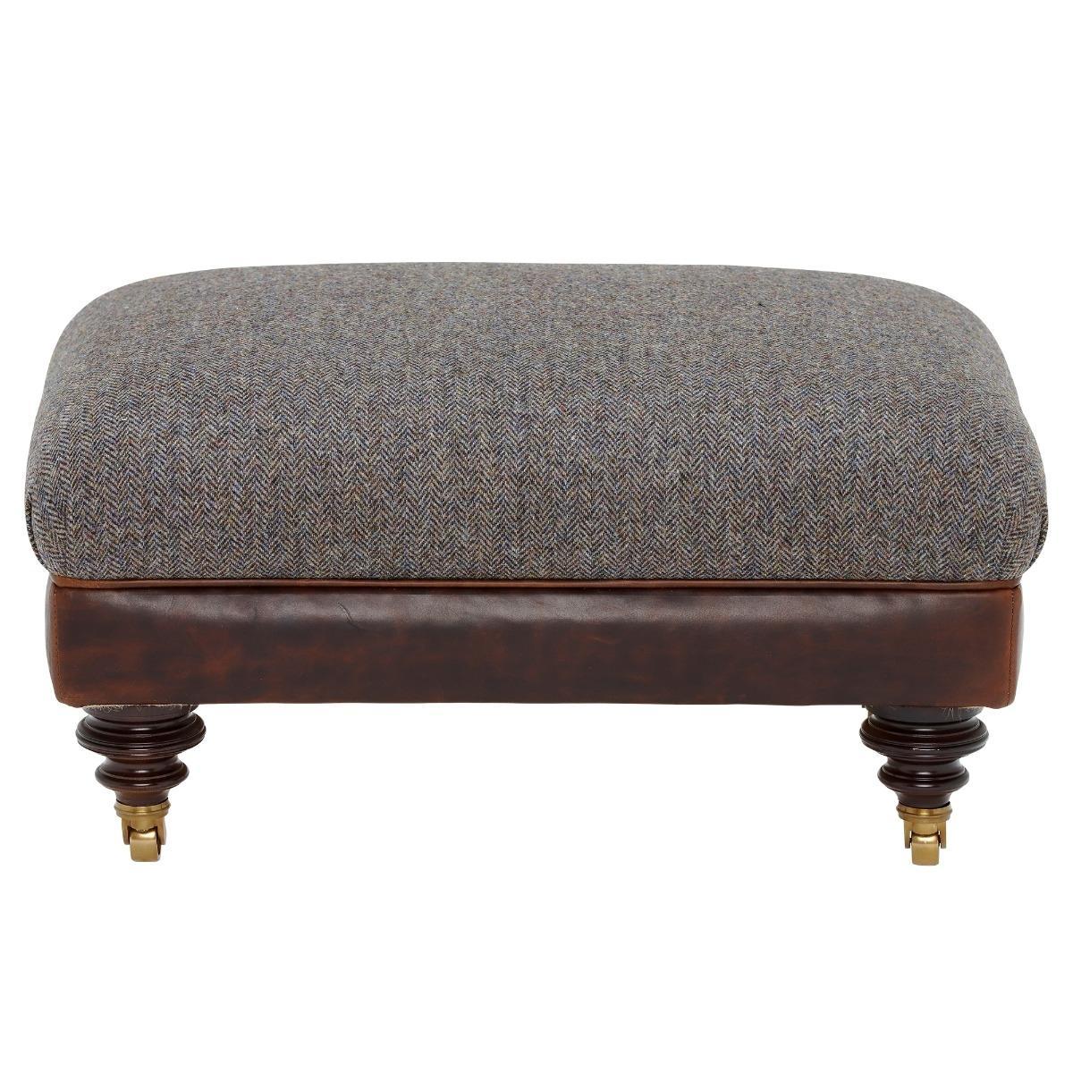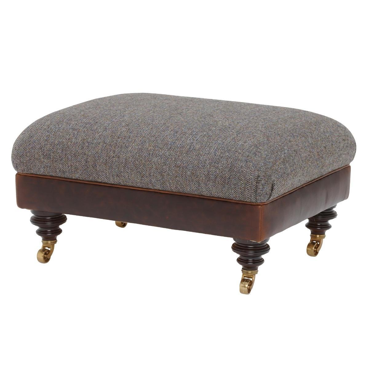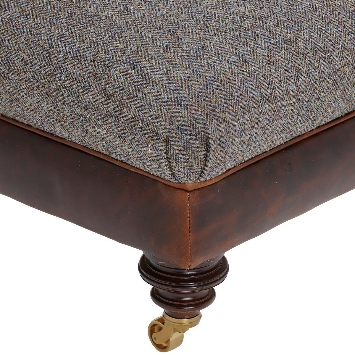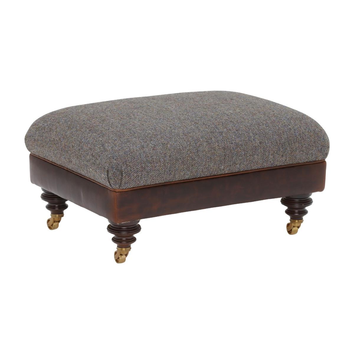 Design. A tweed and hide covered rectangular stool with polished and turned hardwood legs with antique brass castors. Combining Tetrads signature expert craftsmanship with the hard wearing and prestigious Harris Tweed creates a collection which exudes quality and style whilst also typifying just what makes Britain great - that wonderful sense of heritage, quality and tradition. Shown in Basalt Herringbone Harris Tweed and Old Bard Dark Brown hide, choice of colours available.
