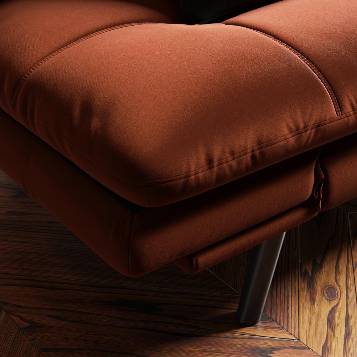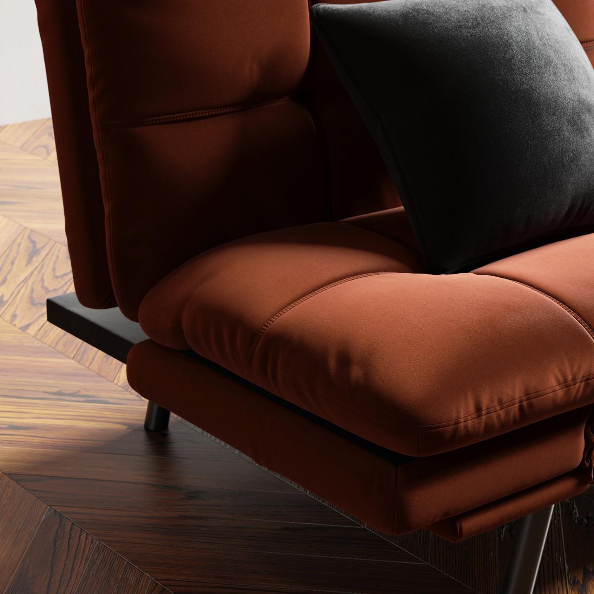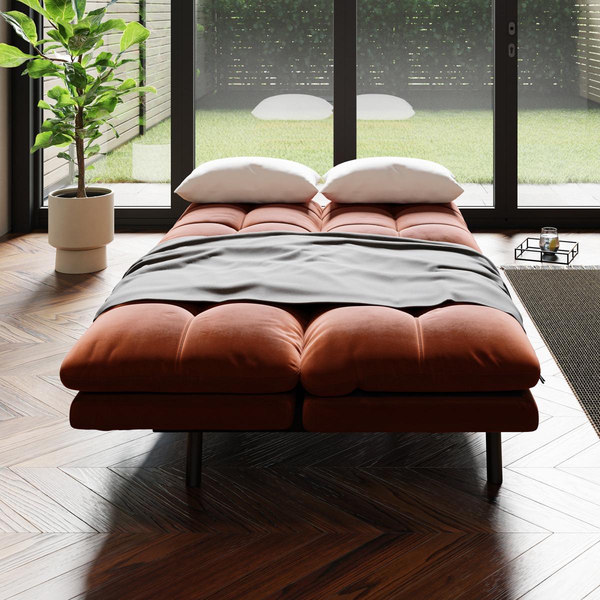 The Harrison quilted velvet clic clac is a lovely option for adding both colour and texture to a modern or eclectic interior. Its bold orange-umber shade can act as a statement piece or colour pop within neutral schemes, especially when paired with complementary earth tones or warm woods. Its velvet finish lends a touch of luxe without feeling overly formal, making it versatile for casual family spaces, guest rooms, or open-plan living areas. Practical styling tips include layering with patterned cushions or throws for added visual interest, and it works particularly well with minimalist or contemporary aesthetics thanks to its sleek quilted design. Its dual functionality as a sofa and bed makes it ideal for versatile spaces, and its inviting look encourages relaxation and easy hosting.
