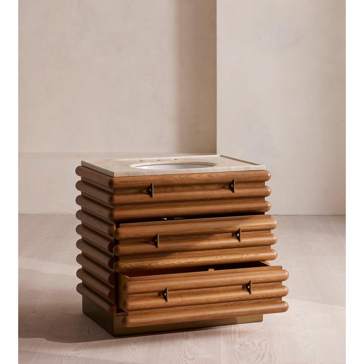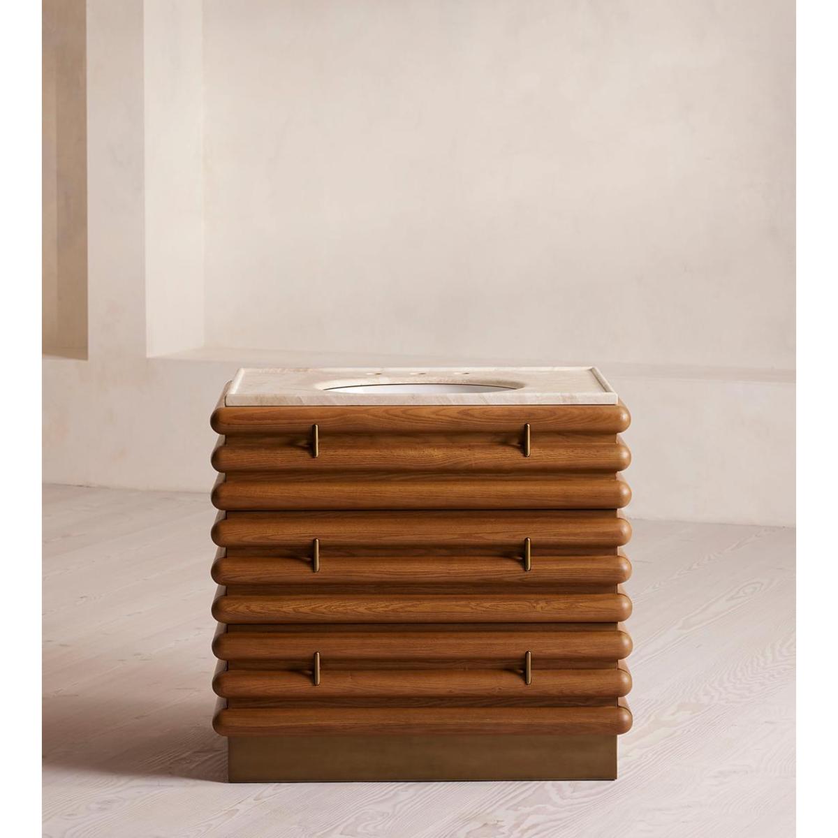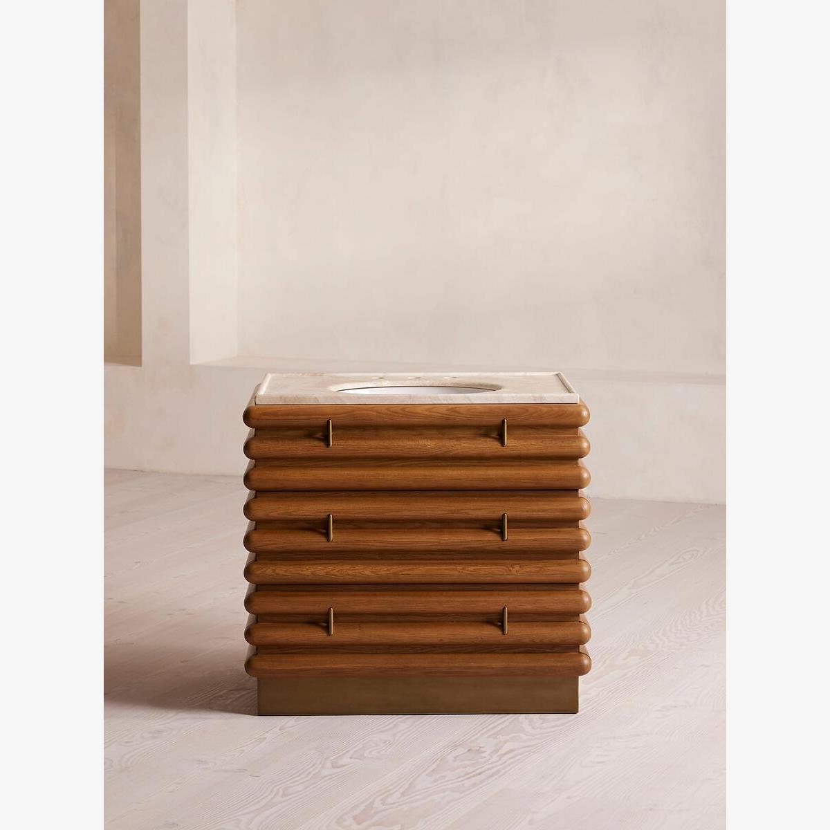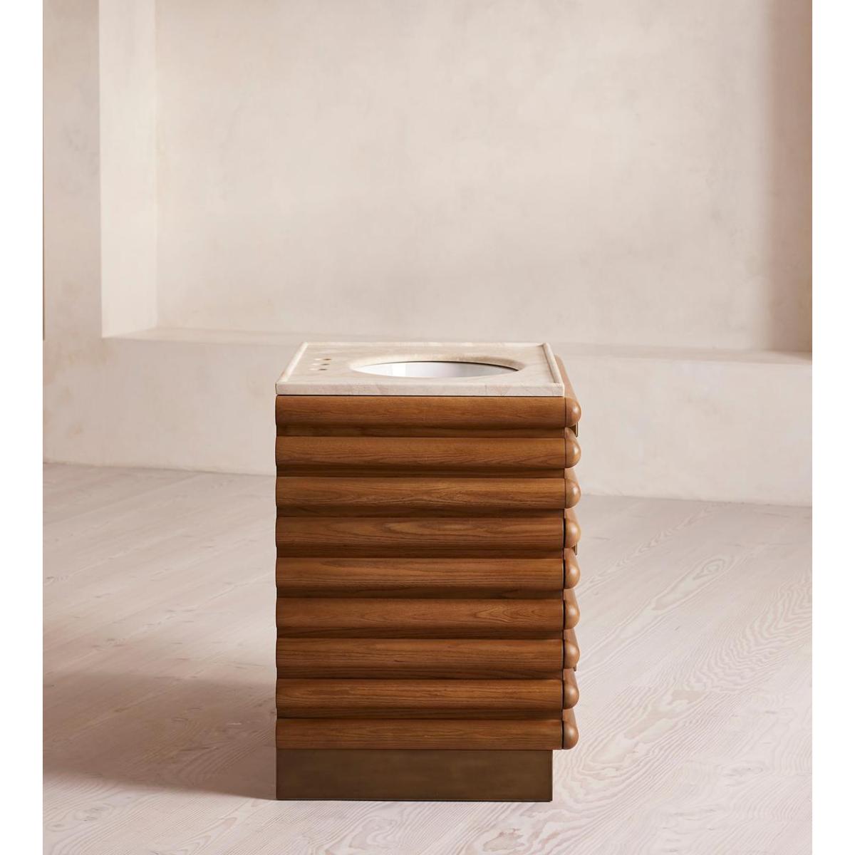 I love this vanity unit for its striking combination of natural warmth and sophisticated marble detail. It works particularly well in modern or minimalist bathrooms where its clean lines can shine, but it also adds a touch of personality to more eclectic interiors. The wooden slatted design offers texture and visual interest, making it a focal point against neutral colour palettes. Practical styling tips include pairing it with sleek brass or matte black fixtures to elevate its look, and adding antique or textured accessories on the surface to create a layered, inviting feel. It's a versatile piece that can seamlessly integrate into both contemporary and timeless interiors, offering both style and function in an elegant package.