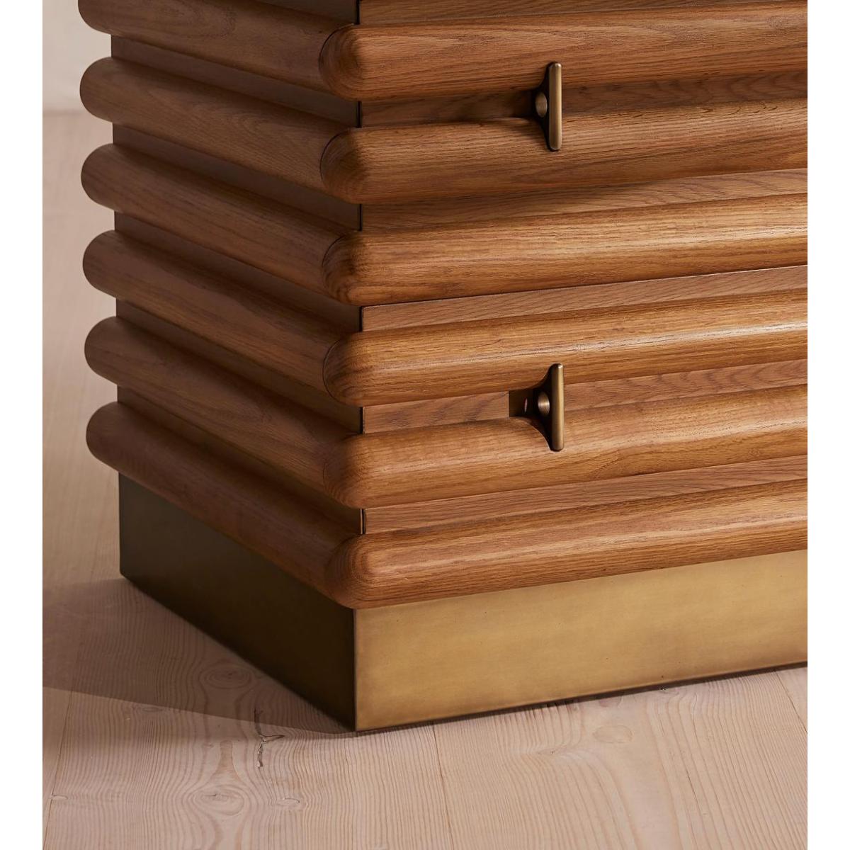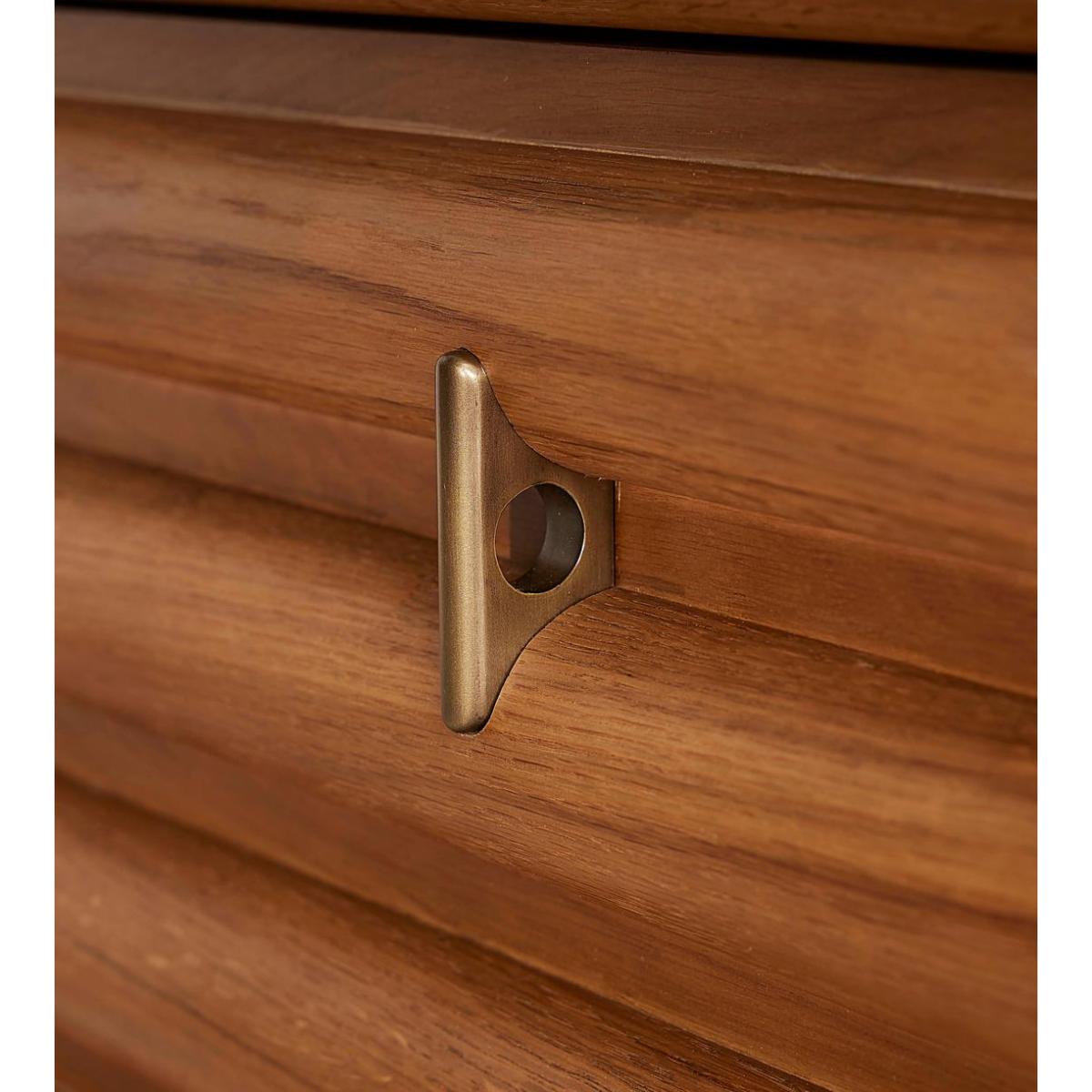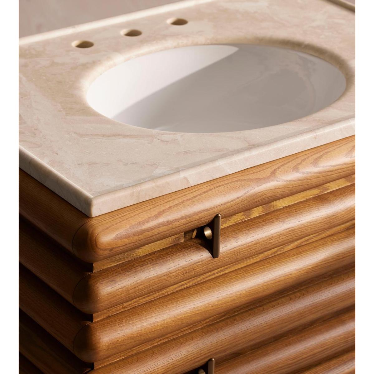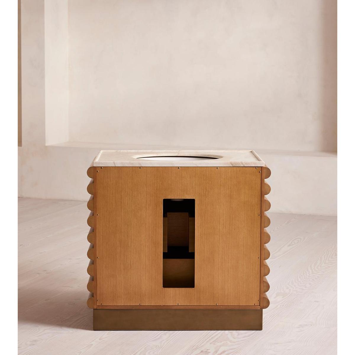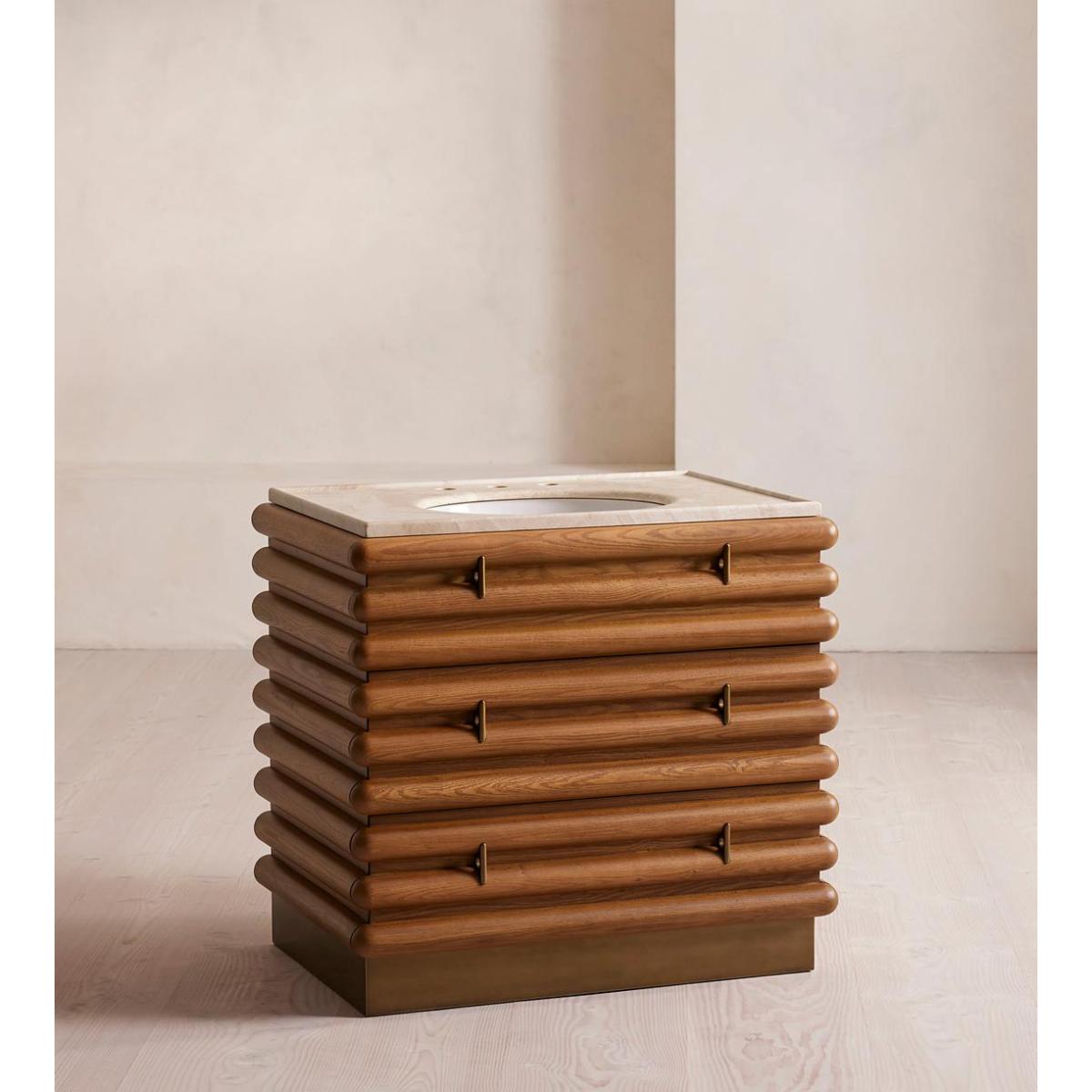 I love this vanity unit for its striking combination of natural warmth and sophisticated marble detail. It works particularly well in modern or minimalist bathrooms where its clean lines can shine, but it also adds a touch of personality to more eclectic interiors. The wooden slatted design offers texture and visual interest, making it a focal point against neutral colour palettes. Practical styling tips include pairing it with sleek brass or matte black fixtures to elevate its look, and adding antique or textured accessories on the surface to create a layered, inviting feel. It's a versatile piece that can seamlessly integrate into both contemporary and timeless interiors, offering both style and function in an elegant package.