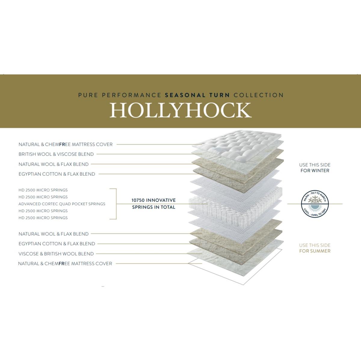 Please note, The headboard is not included with the divan set purchase. The base or frame pictured in the image may not be representative of the speciific base you require. Please contact us for more information, if needed. With layers of blended British wool and viscose, home-grown flax and crisp cooling Egyptian cotton. The Hollyhock has 10750 innovative springs; including 100% recyclable advanced Cortec Quad pocket springs and dual layers of pressure relieving HD 2500 micro springs. With an in-house woven FR chemical free mattress cover and three rows of side stitching, this Seasonal Turn mattress has a warming wool winter side and cooling cotton summer side. Cortec Quad pocket springs, HD 2500 micro springs, British wool and viscose blend, natural wool and flax blend, Egyptian cotton and flax blend. All Harrison Spinks mattresses can be partnered with either our deep bases, shallow bases or our design led slim bases. Each base is manufactured with wood from FSC certified forests, the bases are available with nine different leg options in a range of colours and styles. We have a range of over 50 different luxurious fabrics and colour options to ensure your headboard and base is tailored to your own individual style.  Please Note: As this mattress has two sides for the winter and summer, it is recommended that you turn the mattress seasonally to ensure the longevity of the mattress.  Mattress Depth: 29cm Measurements: ( W x L) Small Single -  75cm x 190cm  Single -  90cm x 190cm Small Double -  120cm x 190cm  Double - 135cm x 190cm  King -  150cm x 200cm Super King - 180cm x 200cm All screens vary in colour reproduction and whilst every effort has been made to display the colour as accurately as possible it is for guidance only.
