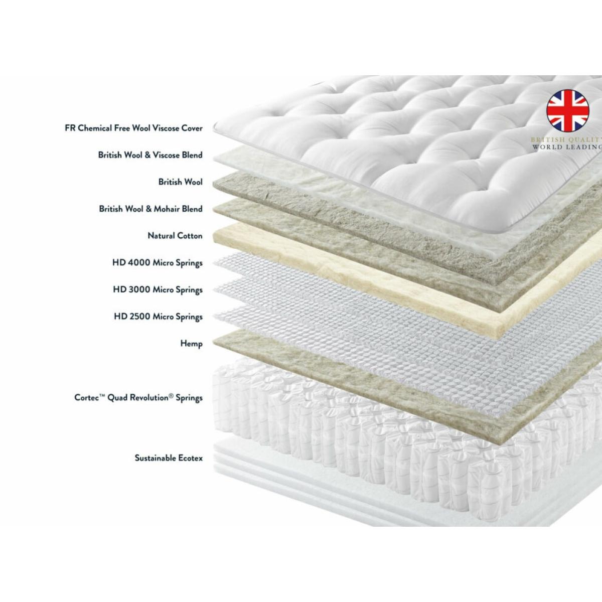 Introducing the Iona 10500 Mattress from Harrison Spinks. With layers of blended British wool and viscose, crisp cooling cotton, British wool, a British wool and mohair blend and Sustainable Ecotex. The Iona features 10500 Cortec™ Quad Revolution® Springs and 3 separate layers of HD Micro Springs. With an in-house woven FR chemical free mattress cover and three rows of side stitching, this mattress is turn free for your convenience. Choose from three levels of support; gentle, medium or firm. Features: Choose your mattress tension rating - Gentle, Medium or Firm. Cortec™ Quad Revolution® Springs - Offers zoned support, adjusting to your body’s movements. HD 4000 Micro Springs - Provides additional targeted support and pressure relief. HD 3000 Micro Springs - Provides additional targeted support and pressure relief. HD 2500 Micro Springs - Provides additional targeted support and pressure relief. British Wool & Viscose Blend, British Wool, British Wool & Mohair Blend, Natural Cotton, Sustainable Ecotex. FR Chemical Free Wool Viscose Cover. Turn-Free Convenience Handcrafted Side Stitching Available Sizes: 75cm Small Single 90cm Single 120cm Small Double 135cm Double 150cm King (also available as a Zip & Link mattress) 180cm Super King (also available as a Zip & Link mattress)