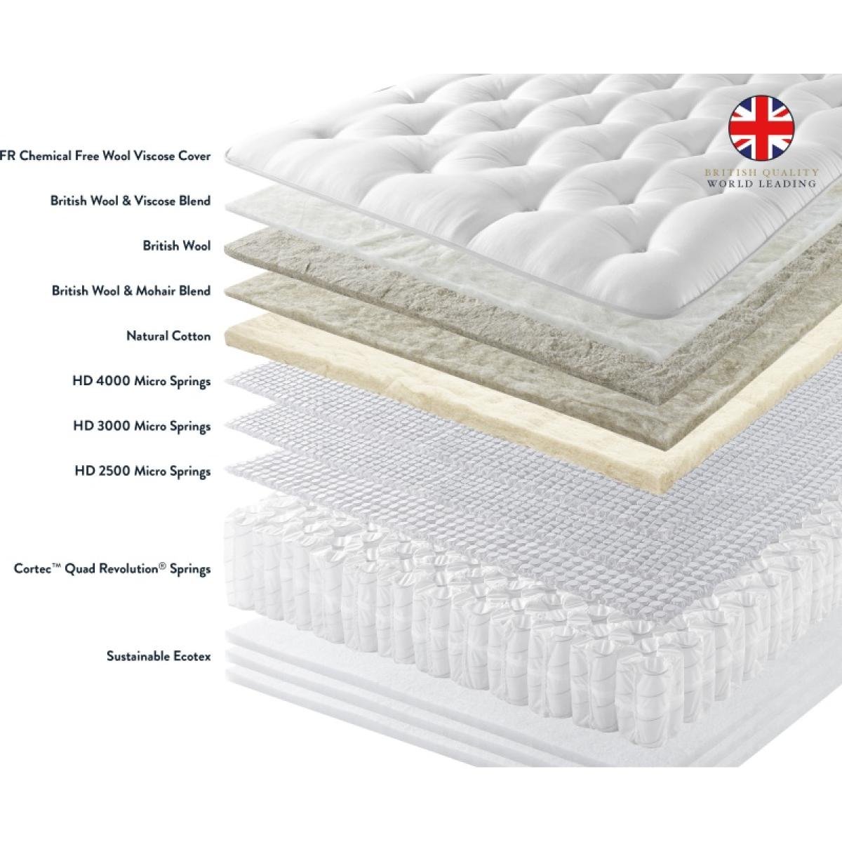 Please note, The headboard is not included with the divan set purchase. The base or frame pictured in the image may not be representative of the speciific base you require. Please contact us for more information, if needed. The Harrison Spinks Iona Mattress & Divan Set delivers exceptional comfort and support, combining innovative design with luxury craftsmanship. This mattress is made using the finest natural materials, including soft wool, breathable cotton, and eco-friendly hemp, offering a sleep experience that is both indulgent and sustainable. What sets the Iona mattress apart is its advanced pocket spring technology, which features an intricate system of individual springs designed to adapt to your body’s contours. This ensures targeted support and reduces motion transfer, making it ideal for couples or those who shift positions throughout the night. The accompanying divan base is expertly crafted to provide the perfect foundation for the mattress, and it’s available with a variety of stylish fabric options. The divan also offers practical storage solutions, helping you maintain a neat and tidy bedroom. With a focus on craftsmanship, comfort, and sustainability, the Harrison Spinks Iona Mattress & Divan Set is designed to provide you with a rejuvenating night’s sleep, all while being mindful of the environment. Perfect for those who appreciate both luxury and eco-conscious design, this set promises lasting quality and relaxation. Features: Choose your mattress tension rating - Gentle, Medium or Firm. Cortec™ Quad Revolution® Springs - Offers zoned support, adjusting to your body’s movements. HD 4000 Micro Springs - Provides additional targeted support and pressure relief. HD 3000 Micro Springs - Provides additional targeted support and pressure relief. HD 2500 Micro Springs - Provides additional targeted support and pressure relief. British Wool & Viscose Blend, British Wool, British Wool & Mohair Blend, Natural Cotton, Sustainable Ecotex. FR Chemical Free Wool Viscose Cover. Turn-Free Convenience Handcrafted Side Stitching Available in a range of colours Choose from three levels of support; gentle, medium or firm. Measurements: ( W x L) Small Single - 75cm x 190cm Single - 90cm x 190cm Small Double - 120cm x 190cm Double - 135cm x 190cm King - 150cm x 200cm Super King - 180cm x 200cm All screens vary in colour reproduction and whilst every effort has been made to display the colour as accurately as possible it is for guidance only.