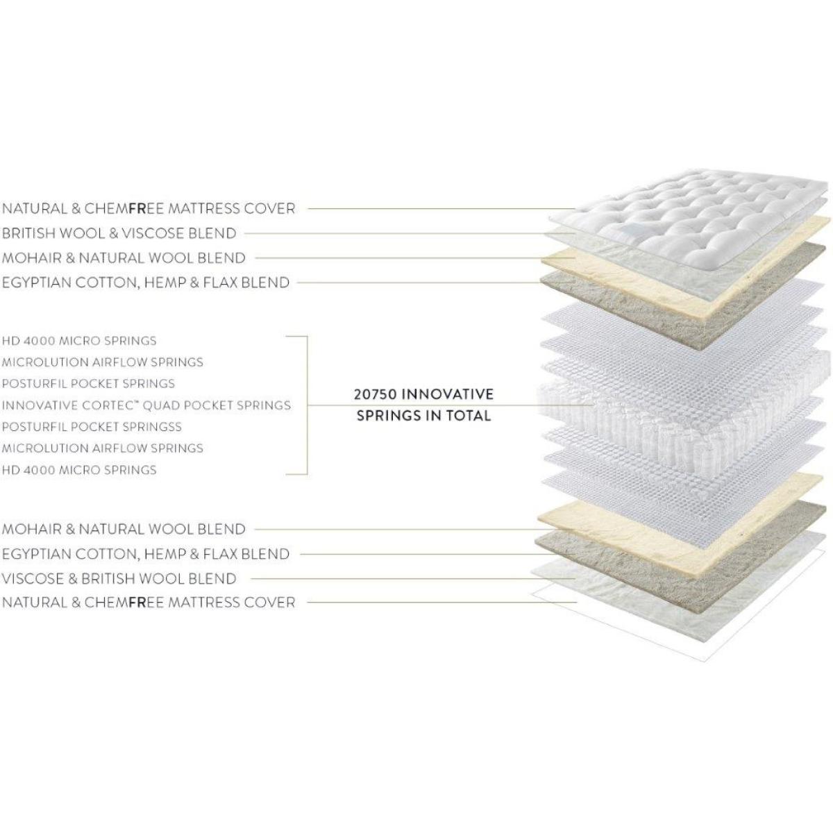 Note -The headboard pictured is not included but is available to purchase separately. With layers of blended British wool and viscose, sumptuous mohair, home-grown hemp and flax and crisp cooling Egyptian cotton. The Lotus has 20750 innovative springs; including 100% recyclable advanced Cortec Quad, pressure relieving HD 4000 Micro, contouring Microlution Airflow and Posturfil pocket springs. With an in-house woven FR chemical treatment free mattress cover and three rows of side stitching. This Seasonal Turn mattress has a warming wool winter side and cooling cotton summer side. Cortec Quad pocket springs, HD 4000 micro springs, Microlution Airflow springs, British wool and viscose blend, mohair and natural wool blend, Egyptian cotton, hemp and flax blend. Please Note: As this mattress has two sides for the winter and summer, it is recommended that you turn the mattress seasonally to ensure the longevity of the mattress. Mattress Depth: 29cm Measurements: (W x L) Small Single - 75cm x 190cm Single - 90cm x 190cm Small Double - 120cm x 190cm Double - 135cm x 190cm King - 150cm x 200cm Super King - 180cm x 200cm All Harrison Spinks mattresses can be partnered with either our deep bases, shallow bases or our design led slim bases. Each base is manufactured with wood from FSC certified forests. Available with our design led slim bases. Choose from nine different leg options in a range of colours and styles, we have a range of over 50 different luxurious fabrics and colour options to ensure your headboard and base is tailored to your own individual style. All screens vary in colour reproduction and whilst every effort has been made to display the colour as accurately as possible it is for guidance only.