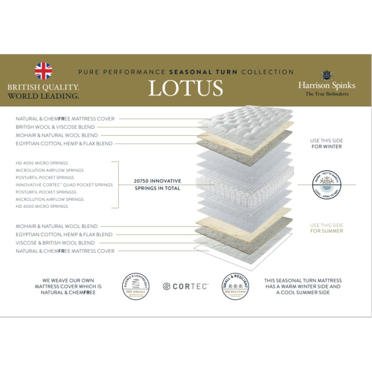 Note -The headboard pictured is not included but is available to purchase separately. With layers of blended British wool and viscose, sumptuous mohair, home-grown hemp and flax and crisp cooling Egyptian cotton. The Lotus has 20750 innovative springs; including 100% recyclable advanced Cortec Quad, pressure relieving HD 4000 Micro, contouring Microlution Airflow and Posturfil pocket springs. With an in-house woven FR chemical treatment free mattress cover and three rows of side stitching. This Seasonal Turn mattress has a warming wool winter side and cooling cotton summer side. Cortec Quad pocket springs, HD 4000 micro springs, Microlution Airflow springs, British wool and viscose blend, mohair and natural wool blend, Egyptian cotton, hemp and flax blend. Please Note: As this mattress has two sides for the winter and summer, it is recommended that you turn the mattress seasonally to ensure the longevity of the mattress. Mattress Depth: 29cm Measurements: (W x L) Small Single - 75cm x 190cm Single - 90cm x 190cm Small Double - 120cm x 190cm Double - 135cm x 190cm King - 150cm x 200cm Super King - 180cm x 200cm All Harrison Spinks mattresses can be partnered with either our deep bases, shallow bases or our design led slim bases. Each base is manufactured with wood from FSC certified forests. Available with our design led slim bases. Choose from nine different leg options in a range of colours and styles, we have a range of over 50 different luxurious fabrics and colour options to ensure your headboard and base is tailored to your own individual style. All screens vary in colour reproduction and whilst every effort has been made to display the colour as accurately as possible it is for guidance only.