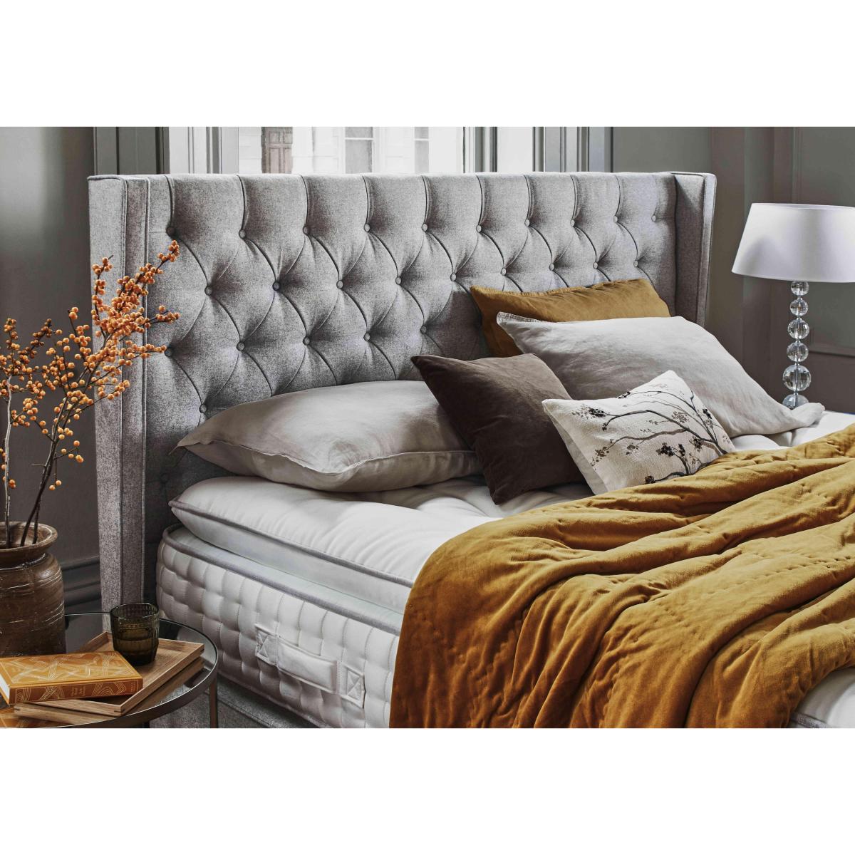 Yorkshire born and bred, Harrison Spinks Yorkshire mattresses and divan sets are exclusive to Furniture Village and handcrafted to order. Every mattress is layered with all-natural fillings that are either produced on Harrison Spinks’ own farm in Yorkshire or sourced locally, a commitment that means every bed is as environmentally-friendly as it is comfortable. High-density pocket springs along with thousands of cushioning micro springs ensure that every mattress promises both personalised support and sumptuous luxury. Sprung firm-edge divan bases are beautifully upholstered in a range of fabrics, and feature optional storage drawer configurations. Harrison Spinks is a family-owned company and has been making wonderful British beds since 1840. Pair your Harrison Spinks divan set with an equally sumptuous headboard. Our exclusive Mulberry floor standing headboard is beautifully upholstered and features buttoning and winged sides. Why you'll love it Luxurious floor standing headboard with classic style details. Traditional elegance, contemporary comfort. Winged sides, sumptuous buttoning and feature pleating. Upholstered from top to floor for a beautifully finished look. In a wide choice of fabrics. Available in all standard bed sizes. Designed to pair with a Harrison Spinks divan set. Hand upholstered and hand finished. Crafted by Harrison Spinks, maker of innovative and sustainable beds. Exclusive to Furniture Village. The Mulberry floor standing headboard is part of our Harrison Spinks collection. What you need to know Compatible with Harrison Spinks Yorkshire divan bases. Clean upholstery weekly using a soft brush or vacuum with the curtain attachment. Professional cleaning advised for oil- and grease-based stains.