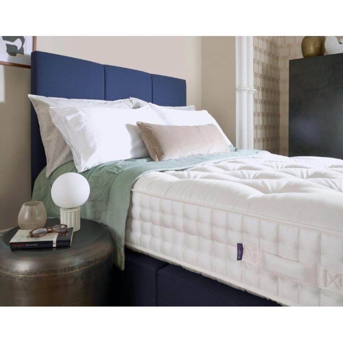 Please note, The headboard is not included with the divan set purchase. The base or frame pictured in the image may not be representative of the speciific base you require. Please contact us for more information, if needed. The Harrison Spinks Onyx Mattress & Divan Set offers a premium blend of innovation, luxury, and sustainability, perfect for those seeking the ultimate sleep experience. Designed with natural, high-quality materials such as breathable cotton, soft wool, and eco-friendly hemp, the Onyx mattress provides a refreshing and comfortable night’s sleep while being kind to the planet. What truly sets the Onyx mattress apart is its advanced pocket spring system, which combines multiple layers of individually wrapped springs for targeted support and a pressure-relieving sleep surface. This innovative design ensures that the mattress adapts to your body’s contours, providing optimal support while minimizing motion transfer, so you can enjoy uninterrupted rest. The accompanying divan base is the perfect match for the mattress, with a sleek design and a range of customizable fabric finishes to suit your bedroom décor. It also offers smart storage solutions to help keep your space organized. Whether you’re seeking a sophisticated sleep system or prioritizing sustainability, the Harrison Spinks Onyx Mattress & Divan Set offers exceptional comfort and lasting quality. Designed with the highest standards of craftsmanship, it guarantees a rejuvenating night’s sleep while maintaining eco-conscious value Choose from three levels of support; gentle, medium or firm. Features: Natural & Chemfree mattress cover British Wool & Viscose blend Wool, Flax & Hemp Blend Egyptian Cotton & Hemp blend HD2500 Springs - High density layer of mirco springs Cortec Revolution Pocket springs Innovative 100% sustainable springs, Made from high tensile wire drawn by Harrison Spinks Available in a range of colours Mattress Depth 26cm. Measurements: ( W x L) Small Single - 75cm x 190cm Single - 90cm x 190cm Small Double - 120cm x 190cm Double - 135cm x 190cm King - 150cm x 200cm Super King - 180cm x 200cm All screens vary in colour reproduction and whilst every effort has been made to display the colour as accurately as possible it is for guidance only.