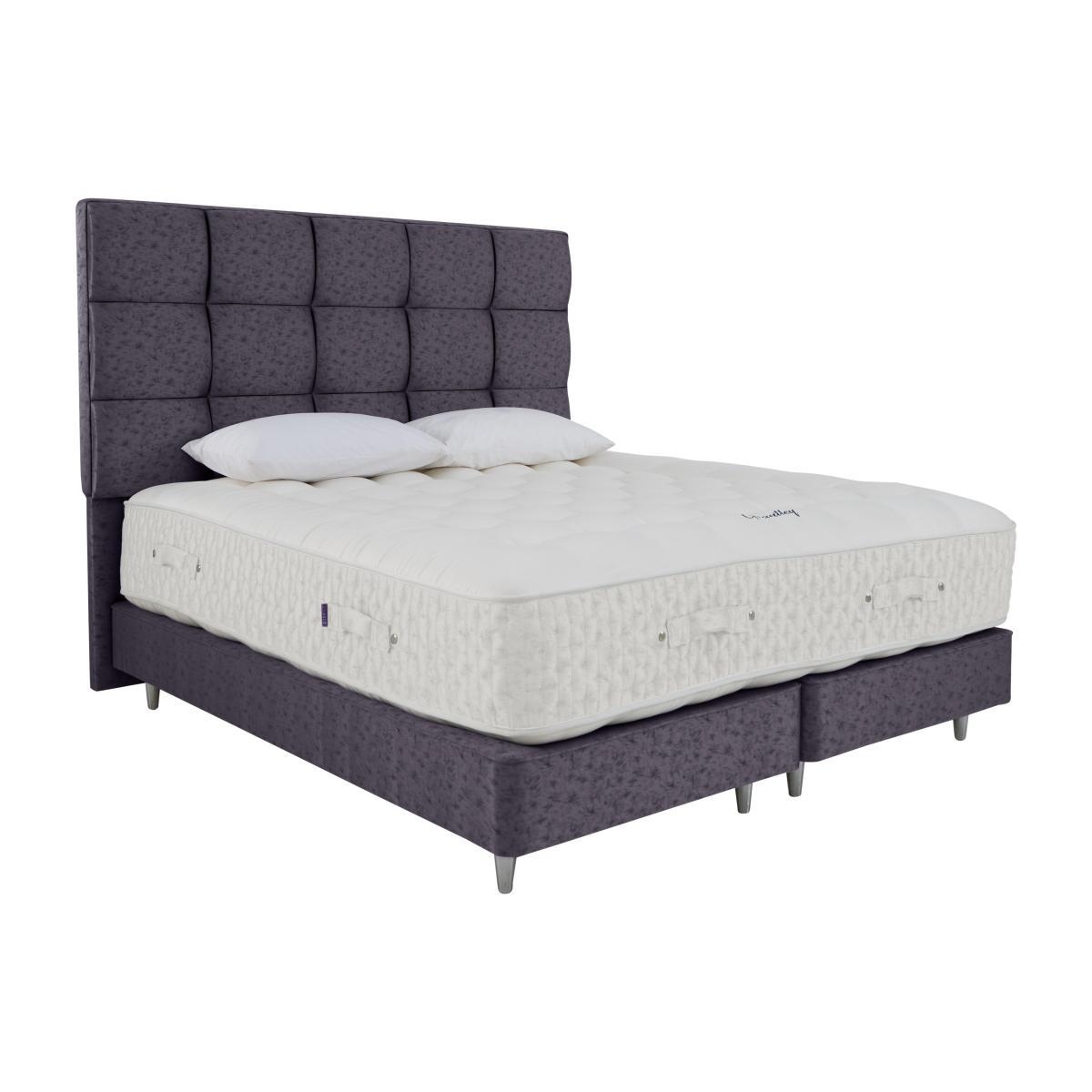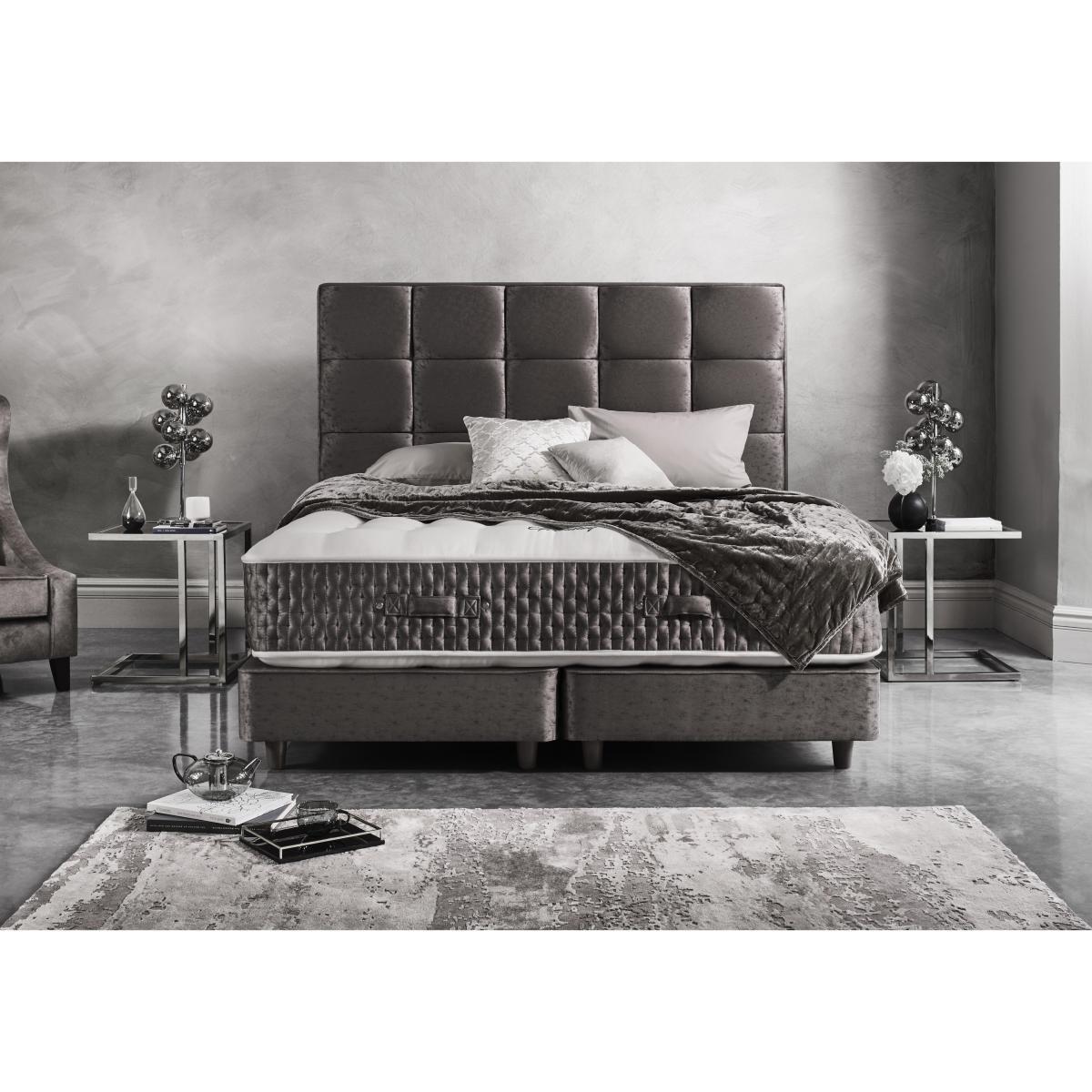 Headboard shown available separately. Get ready for top-of-the-range luxury. This divan set has 40,750 pocket springs in the mattress surrounded by all natural, luxury fillings, with 25,000 springs in the base. Why you’ll love it. Furniture Village’s highest spring count mattress. 40,750 pocket springs. High-end style. Extra deep, tufted and British made. Traditional hand side-stitching, tufting and tape edging. Abundant all-natural fillings include Herdwick wool, mohair, silk, cashmere, kapok, alpaca and angora. Kapok fibres are buoyant, resilient and resistant to water. Alpaca is soft, durable and lanolin-free, which makes it hypoallergenic. Sprung divan in wide choice of fabrics and colours. Handcrafted to order. Exclusive to Furniture Village. What you need to know. Mattress type: Pocket spring. Depth: 36 cm. Firmness: Regular and firmer feel. Split tension available in king and super king sizes. Springs: 40,750 high-density pocket springs in king size. Fillings: Herdwick wool, Egyptian cotton, hemp, flax, mohair, silk, cashmere, kapok, alpaca and angora wool. Mattress cover: 100% wool, chemical-free tick fabric. Six rows of side stitching. Divan base: 29cm deep. Sprung, true edge. 25,000 springs. Sizes: Zip and link super king and king. Super king, king, double, small double, single. Requires turning: Yes. Mattress care: Air for 4 hours before using to remove any odour. Allow at least 4 hours for springs to settle and for mattress to attain its full size. Indentations caused by settlement of fillings or body weight are normal and are not considered defects. If used on a slatted bed frame, slats must be no more than 7 cm apart. Rotate regularly.