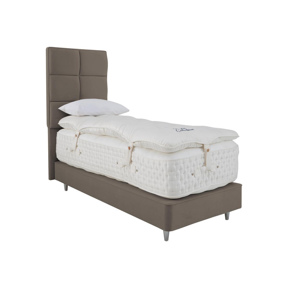 The ultimate in luxury. The mattress has an incredible 40,750 pocket springs plus a sumptuous sprung mattress topper. Even the divan base is sprung. A Furniture Village exclusive. Why you’ll love it. Furniture Village’s highest spring count mattress. 40,750 pocket springs. luxurious mattress topper with an additional 10,000 springs inside. High-end style. Extra deep, tufted and British made. Traditional hand side-stitching, tufting and tape edging. Abundant all-natural fillings include Herdwick wool, mohair, silk, cashmere, kapok, alpaca and angora. Kapok fibres are buoyant, resilient and resistant to water. Alpaca is soft, durable and lanolin-free, which makes it hypoallergenic. Sprung divan in wide choice of fabrics and colours. Handcrafted to order. Exclusive to Furniture Village. What you need to know. Mattress type: Pocket spring. Depth: 36 cm. Firmness: Regular and firmer feel. Split tension available in king and super king sizes. Springs: 40,750 high-density pocket springs in king size. Fillings: Herdwick wool, Egyptian cotton, hemp, flax, mohair, silk and cashmere. Mattress cover: 100% wool, chemical-free tick fabric. Six rows of side stitching. Topper: 10,000 responsive micro-springs with Egyptian cotton, alpaca and Kapok. Divan base: 29cm deep. Sprung, true edge. 25,000 springs. Sizes: Zip and link super king and king. Super king, king, double, small double, single. Requires turning: Yes. Mattress care: Air for 4 hours before using to remove any odour. Allow at least 4 hours for springs to settle and for mattress to attain its full size. Indentations caused by settlement of fillings or body weight are normal and are not considered defects. If used on a slatted bed frame, slats must be no more than 7 cm apart. Rotate regularly.