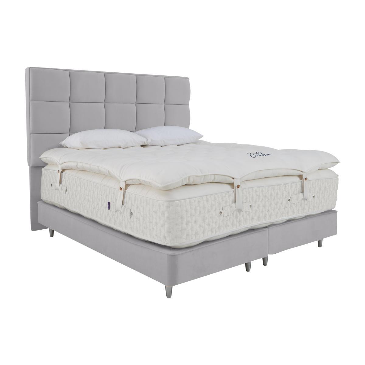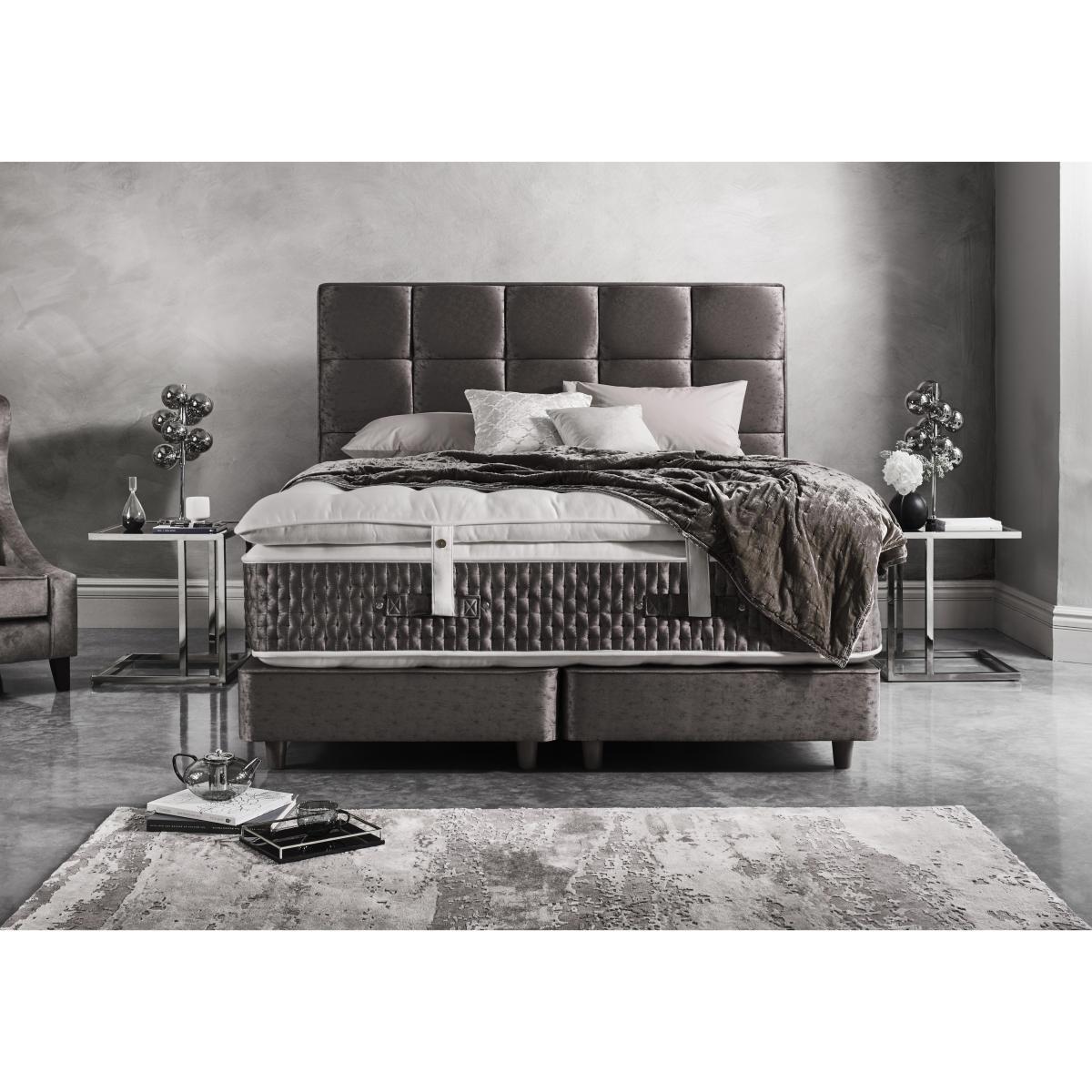 The ultimate in luxury. The mattress has an incredible 40,750 pocket springs plus a sumptuous sprung mattress topper. Even the divan base is sprung. A Furniture Village exclusive. Why you’ll love it. Furniture Village’s highest spring count mattress. 40,750 pocket springs. luxurious mattress topper with an additional 10,000 springs inside. High-end style. Extra deep, tufted and British made. Traditional hand side-stitching, tufting and tape edging. Abundant all-natural fillings include Herdwick wool, mohair, silk, cashmere, kapok, alpaca and angora. Kapok fibres are buoyant, resilient and resistant to water. Alpaca is soft, durable and lanolin-free, which makes it hypoallergenic. Sprung divan in wide choice of fabrics and colours. Handcrafted to order. Exclusive to Furniture Village. What you need to know. Mattress type: Pocket spring. Depth: 36 cm. Firmness: Regular and firmer feel. Split tension available in king and super king sizes. Springs: 40,750 high-density pocket springs in king size. Fillings: Herdwick wool, Egyptian cotton, hemp, flax, mohair, silk and cashmere. Mattress cover: 100% wool, chemical-free tick fabric. Six rows of side stitching. Topper: 10,000 responsive micro-springs with Egyptian cotton, alpaca and Kapok. Divan base: 29cm deep. Sprung, true edge. 25,000 springs. Sizes: Zip and link super king and king. Super king, king, double, small double, single. Requires turning: Yes. Mattress care: Air for 4 hours before using to remove any odour. Allow at least 4 hours for springs to settle and for mattress to attain its full size. Indentations caused by settlement of fillings or body weight are normal and are not considered defects. If used on a slatted bed frame, slats must be no more than 7 cm apart. Rotate regularly.