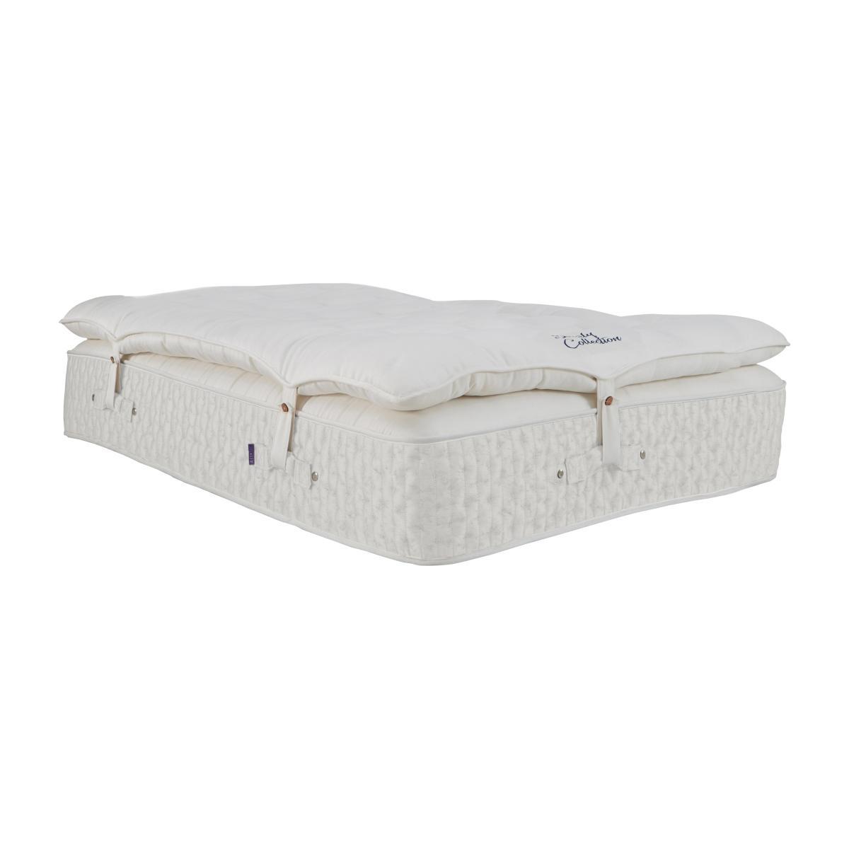 Introducing our highest ever spring count mattress with lavish, luxury fillings and 40,750 pocket springs. The pampering mattress topper has a further 10,000 micro-springs. Why you’ll love it. Furniture Village’s highest spring count mattress. 40,750 pocket springs. Sprung, luxurious mattress topper which includes an additional 10,000 springs. High-end style. Extra deep, tufted and British made. Traditional hand side-stitching, tufting and tape edging. Abundant all-natural fillings include Herdwick wool, mohair, silk, cashmere, kapok, alpaca and angora. Kapok fibres are buoyant, resilient and resistant to water. Alpaca is soft, durable and lanolin-free, which makes it hypoallergenic. Expertly handcrafted to order. Exclusive to Furniture Village. What you need to know. Mattress type: Pocket spring. Depth: 36 cm. Firmness: Regular and firmer feel. Split tension available in king and super king sizes. Springs: 40,750 high-density pocket springs in king size. Fillings: Herdwick wool, Egyptian cotton, hemp, flax, mohair, silk, cashmere, kapok, alpaca and angora wool. Cover: 100% wool, chemical-free tick fabric. Topper: 10,000 responsive micro-springs with Egyptian cotton, alpaca and Kapok. Sizes: Zip and link super king and king. Super king, king, double, small double, single. Requires turning: Yes. Mattress care: Air for 4 hours before using to remove any odour. Allow at least 4 hours for springs to settle and for mattress to attain its full size. Indentations caused by settlement of fillings or body weight are normal and are not considered defects. If used on a slatted bed frame, slats must be no more than 7 cm apart. Rotate regularly.