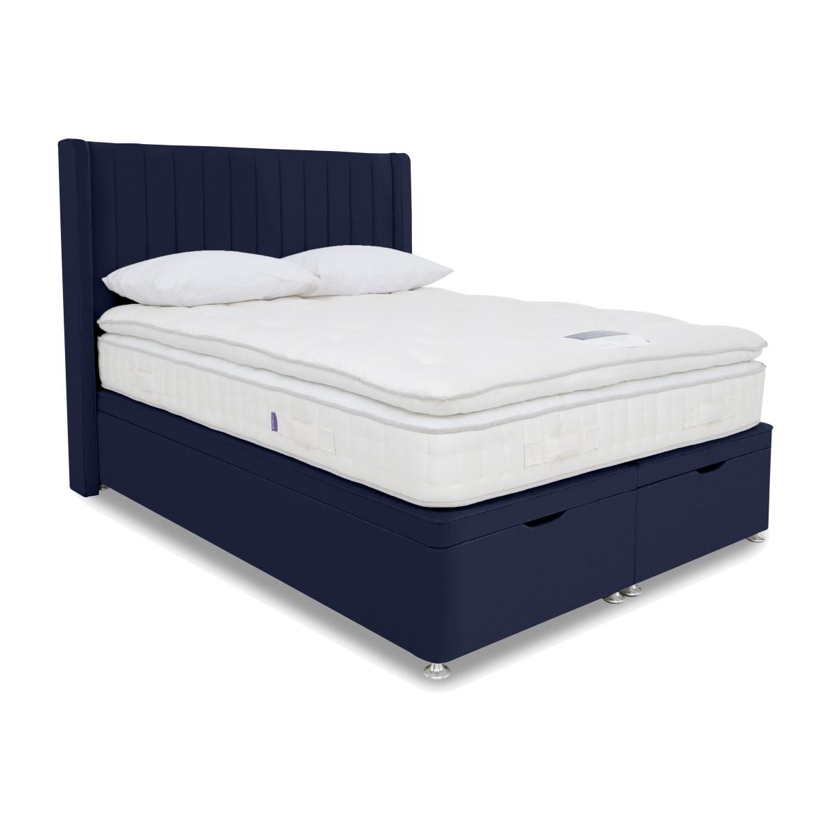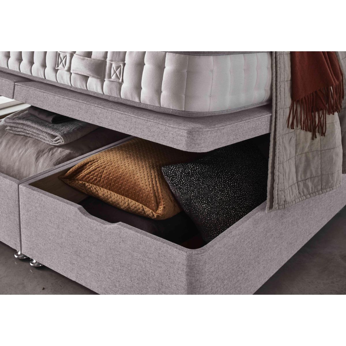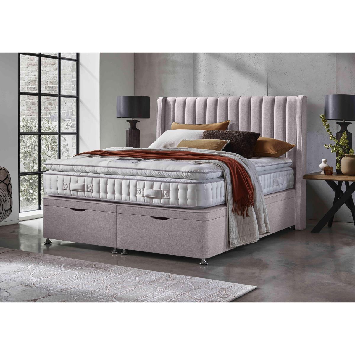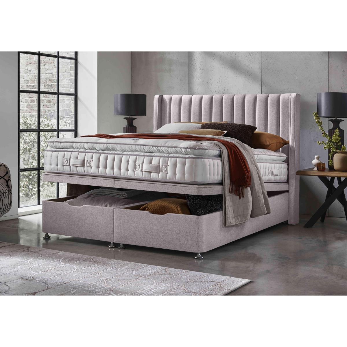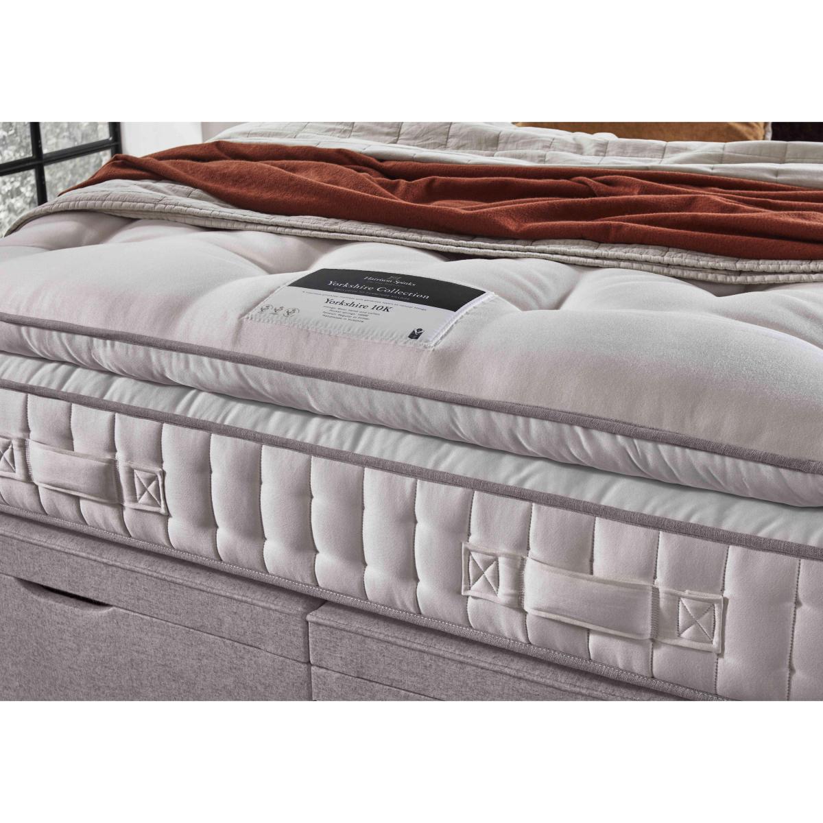 Yorkshire born and bred, Harrison Spinks Yorkshire mattresses and divan sets are exclusive to Furniture Village and handcrafted to order. Every mattress is layered with all-natural fillings that are either produced on Harrison Spinks’ own farm in Yorkshire or sourced locally, a commitment that means every bed is as environmentally-friendly as it is comfortable. High-density pocket springs along with thousands of cushioning micro springs ensure that every mattress promises both personalised support and sumptuous luxury. Sprung firm-edge divan bases are beautifully upholstered in a range of fabrics, and feature optional storage drawer configurations. Harrison Spinks is a family-owned company and has been making wonderful British beds since 1840. In this divan set, we’ve paired a beautiful pillow top mattress with a space-saving ottoman divan base and we think you’ll love what you see. Handcrafted and only at Furniture Village. Why you'll love it This Harrison Spinks ottoman divan set has a sumptuous pillow top mattress. Each handcrafted pocket spring mattress is made to order in Yorkshire. With a unique combination of supportive pocket springs and cushioning micro springs. Filled with springy British wool, hypoallergenic Yorkshire hemp and breathable cotton. Micro spring-filled pillow top provides extra comfort with pressure relief. Finished with traditional tufting and hand side stitching. A more sustainable choice – this mattress is fully recyclable. Made without foam, glue and chemical fire-retardants for a more natural night’s sleep. Choice of firmness – regular and firmer. The pillow top adds a layer of luxurious softness. Sprung base with spacious and convenient ottoman storage. In a wide choice of upholstery fabrics. In double, king and super king sizes. Made in Yorkshire exclusively for Furniture Village. This ottoman divan set is part of the Harrison Spinks Yorkshire 10. K collection. What you need to know Headboard is an optional extra. Mattress type: Pocket spring. Depth: 28 cm. Firmness:Regular and firmer. Springs: 10,000 in king size – 1,000 pocket springs and 9,000 pillow top micro springs. Pillow top: Yes – with wool, cotton and micro springs. Fillings: British wool, Yorkshire hemp, cotton. Cover: Wool blend. Requires turning: No. Base type:Pocket sprung with firm edge support and ottoman storage. Sizes: Single, small double, double, king and super king. Mattress care:Air for 4 hours before using to remove any odour. Allow at least 4 hours for springs to settle and for mattress to attain its full size. Indentations caused by settlement of fillings or body weight are normal and are not considered defects. If used on a slatted bed frame, the space between slats must be no wider than 7.5 cm. Spaces wider than this may cause excess dipping of the mattress and invalidate the guarantee. Always use a mattress protector. Rotate regularly. Divan base care: Clean upholstery weekly using a soft brush or vacuum with the curtain attachment. Professional cleaning advised for oil- and grease-based stains. Some fabrics can show wear on areas of more use or in direct sunlight.