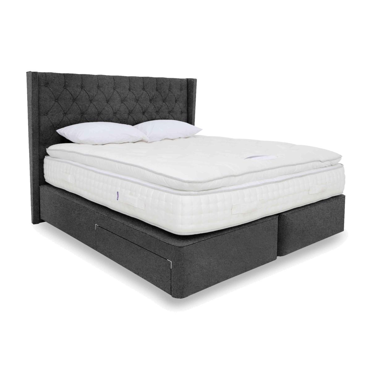 Yorkshire born and bred, Harrison Spinks Yorkshire mattresses and divan sets are exclusive to Furniture Village and handcrafted to order. Every mattress is layered with all-natural fillings that are either produced on Harrison Spinks’ own farm in Yorkshire or sourced locally, a commitment that means every bed is as environmentally-friendly as it is comfortable. High-density pocket springs along with thousands of cushioning micro springs ensure that every mattress promises both personalised support and sumptuous luxury. Sprung firm-edge divan bases are beautifully upholstered in a range of fabrics, and feature optional storage drawer configurations. Harrison Spinks is a family-owned company and has been making wonderful British beds since 1840. We’ve paired this sumptuous Harrison Spinks pillow top mattress with a stylish storage divan base. Select from a wide choice of upholstery fabrics, add drawer or ottoman storage and relax. Why you'll love it The most sumptuous Harrison Spinks pillow top comfort in a divan set. Each handcrafted pocket spring mattress is made to order in Yorkshire. With a unique combination of supportive pocket springs and cushioning micro springs. Filled with springy wool, absorbent hemp, breathable cotton, absorbent flax and Egyptian cotton. Luxurious micro spring-filled pillow top provides extra comfort with pressure relief. Finished with traditional tufting and hand side stitching. A more sustainable choice – this mattress is fully recyclable. Made without foam, glue and chemical fire-retardants for a more natural night’s sleep. Choice of firmness – regular and firmer. The pillow top adds a layer of luxurious softness. Sprung base with optional storage drawers or end-opening ottoman. In a wide choice of upholstery fabrics. In single, small double, double, king and super king sizes. Made in Yorkshire exclusively for Furniture Village. This pillow top divan set is part of the Harrison Spinks Yorkshire 20,000 collection. What you need to know Headboard is an optional extra. Mattress type: Pocket spring. Depth: 33 cm. Firmness:Regular and firmer. Springs: 20,000 in king size – 8,500 pocket springs and 11,500 in the topper. Pillow top: Yes – with wool, cotton, Egyptian cotton and micro springs. Fillings: British wool, Yorkshire hemp, cotton, flax, Egyptian cotton. Cover: Wool blend. Requires turning: No. Base type:Pocket sprung with firm edge support and optional drawer or ottoman storage. Sizes: Single, small double, double, king and super king. Mattress care:Air for 4 hours before using to remove any odour. Allow at least 4 hours for springs to settle and for mattress to attain its full size. Indentations caused by settlement of fillings or body weight are normal and are not considered defects. If used on a slatted bed frame, the space between slats must be no wider than 7.5 cm. Spaces wider than this may cause excess dipping of the mattress and invalidate the guarantee. Always use a mattress protector. Rotate regularly. Divan base care: Clean upholstery weekly using a soft brush or vacuum with the curtain attachment. Professional cleaning advised for oil- and grease-based stains. Some fabrics can show wear on areas of more use or in direct sunlight.