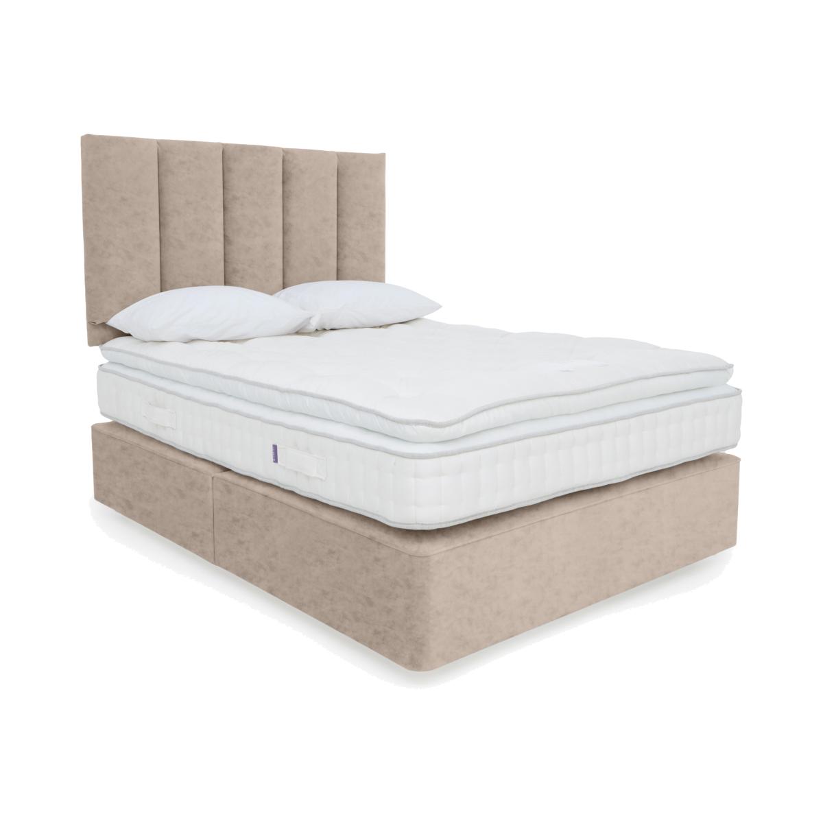 Yorkshire born and bred, Harrison Spinks Yorkshire mattresses and divan sets are exclusive to Furniture Village and handcrafted to order. Every mattress is layered with all-natural fillings that are either produced on Harrison Spinks’ own farm in Yorkshire or sourced locally, a commitment that means every bed is as environmentally-friendly as it is comfortable. High-density pocket springs along with thousands of cushioning micro springs ensure that every mattress promises both personalised support and sumptuous luxury. Sprung firm-edge divan bases are beautifully upholstered in a range of fabrics, and feature optional storage drawer configurations. Harrison Spinks is a family-owned company and has been making wonderful British beds since 1840. Choose the Harrison Spinks 5. K divan set and enjoy a handcrafted all-natural pillow top pocket spring mattress plus a divan base with optional built-in storage. Why you'll love it This pillow top divan set represents true luxury at a great-value price. With a no-turn pillow top mattress with 5,000 pocket springs in king size. The sumptuous pillow top is layered with micro springs. Mattress and pillow top are filled with springy wool and hypoallergenic hemp. All wool is ethically sourced from traceable British farms. Hemp is grown on Harrison Spinks’ own farm. Filled, tufted and side stitched by hand. Made without foam, glue and chemical fire-retardants for a more natural night’s sleep. In a choice of firmness – regular and firmer. Sprung base on castors with optional built-in storage drawers. Offered in a wide choice of upholstery fabrics. Handcrafted in Yorkshire exclusively for Furniture Village. This pillow top divan set is part of the Harrison Spinks Yorkshire 5. K collection. What you need to know Headboard is an optional extra. Mattress type: Pocket spring. Depth: 30 cm. Firmness:Regular and firmer. Springs: 5,000 in king size – 1,000 pocket springs and 4,000 micro springs. Pillow top:Yes. Fillings: British wool, Yorkshire hemp. Cover: Wool and viscose. Requires turning: No. Base type: Pocket sprung with 1000 springs in king size. Optional drawer storage. Sizes: Single, small double, double, king and super king. Mattress care:Air for 4 hours before using to remove any odour. Allow at least 4 hours for springs to settle and for mattress to attain its full size. Indentations caused by settlement of fillings or body weight are normal and are not considered defects. If used on a slatted bed frame, the space between slats must be no wider than 7.5 cm. Spaces wider than this may cause excess dipping of the mattress and invalidate the guarantee. Always use a mattress protector. Rotate regularly. Divan base care: Clean upholstery weekly using a soft brush or vacuum with the curtain attachment. Professional cleaning advised for oil- and grease-based stains. Some fabrics can show wear on areas of more use or in direct sunlight.