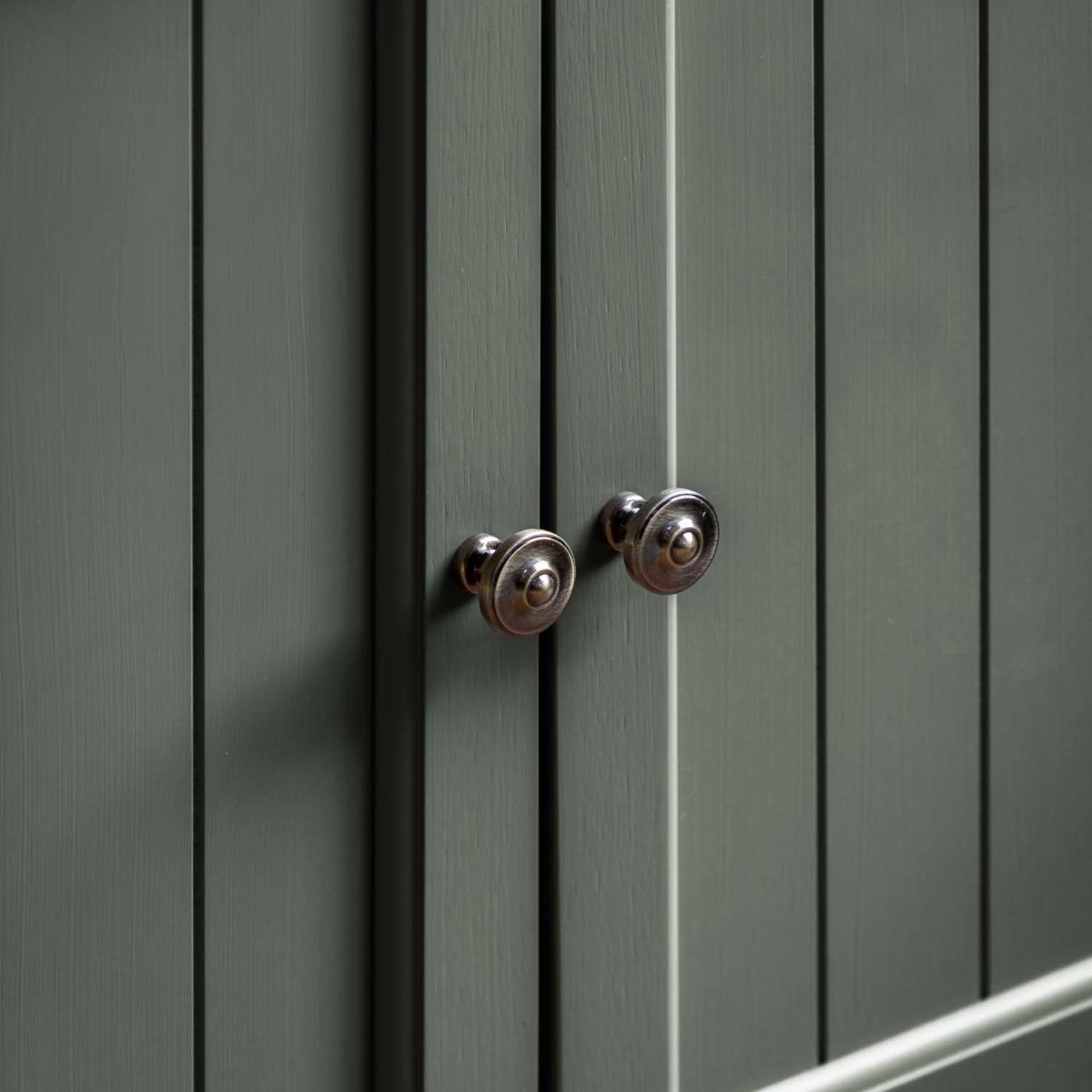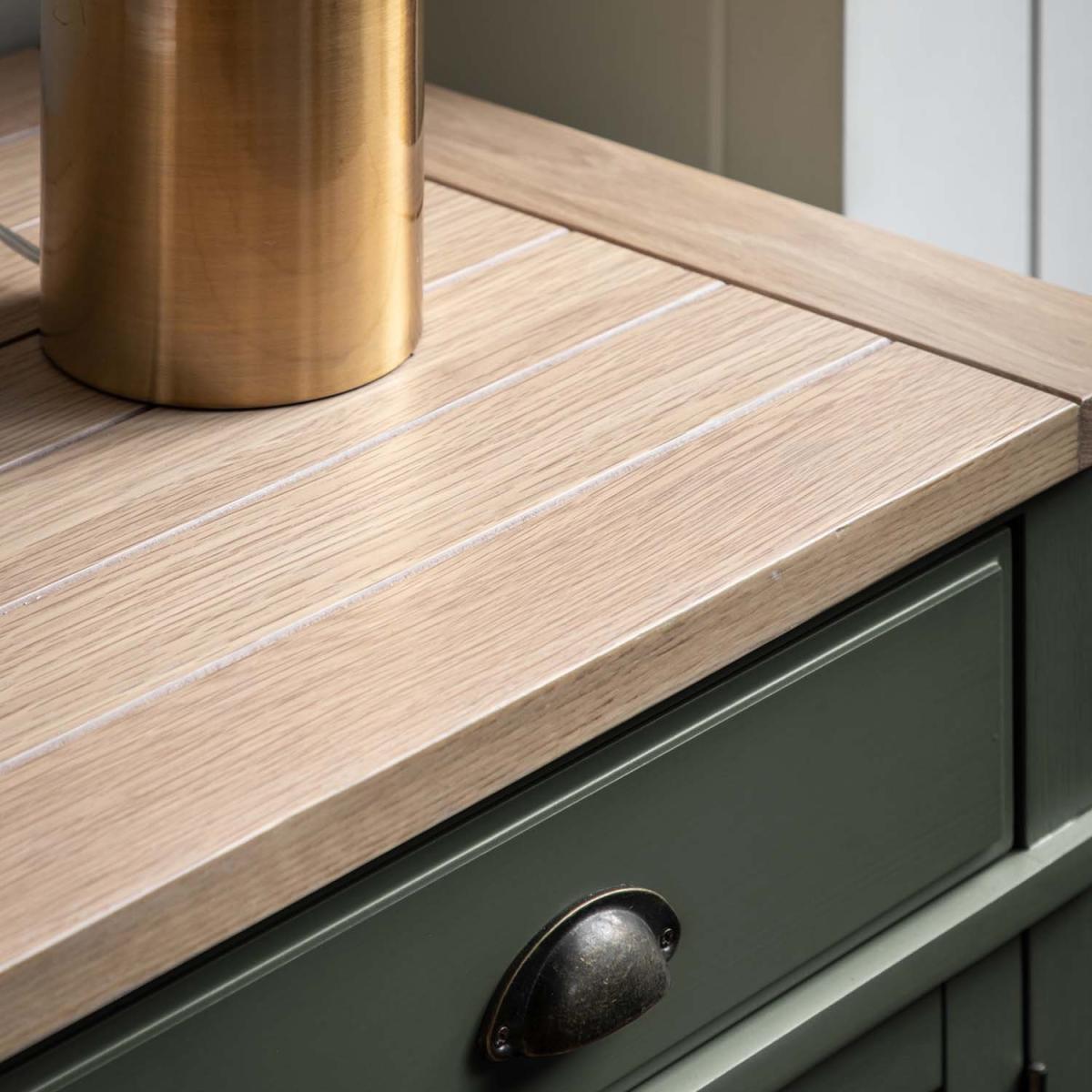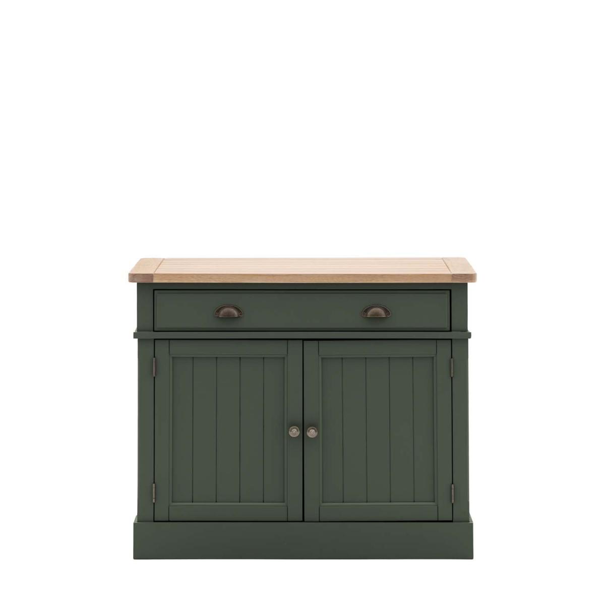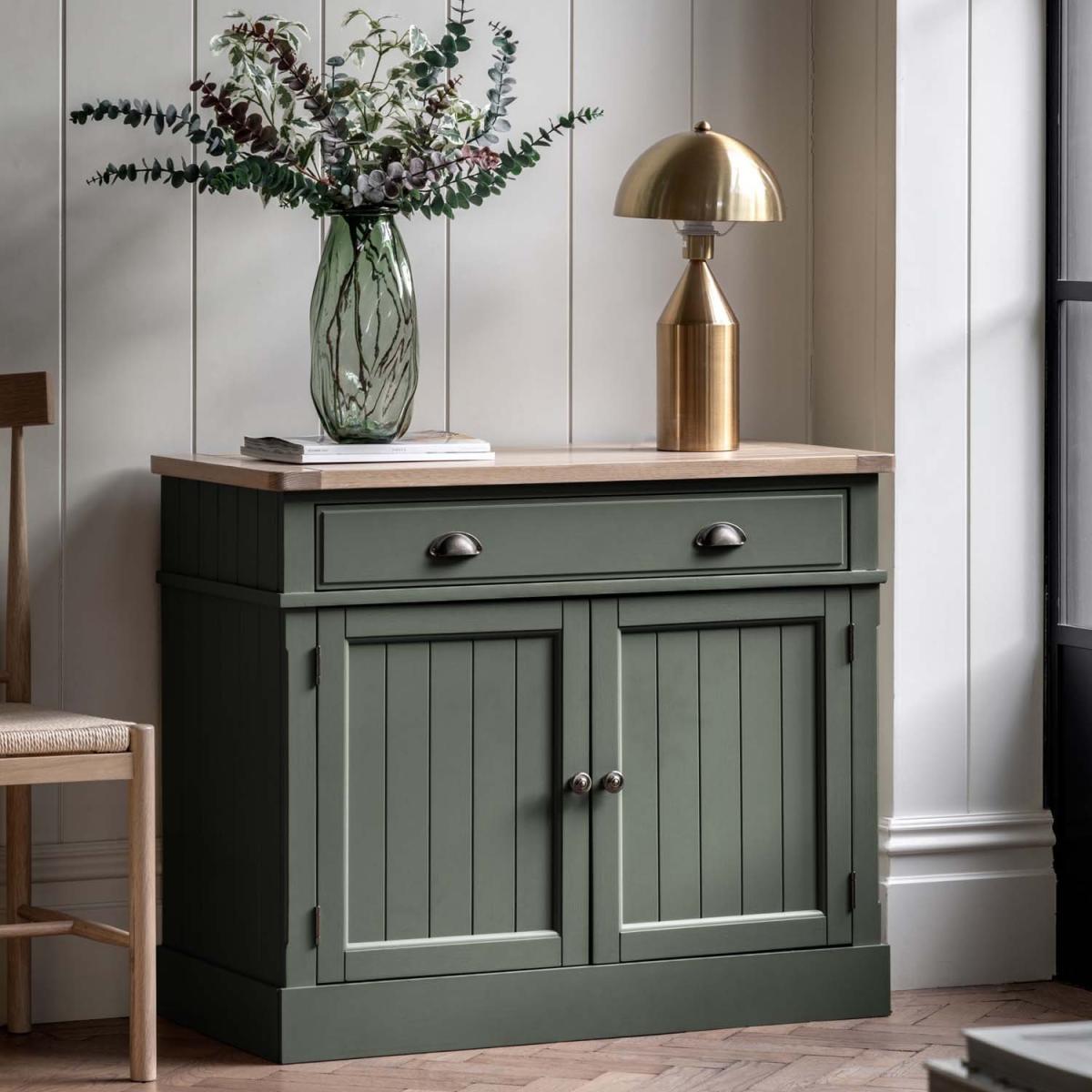 Traditional charm and contemporary style unite for this two door sideboard. Offering practical storage through a single large drawer and adjustable shelves within its cupboards, the sideboard provides plenty of space. The combination of the grooved and planked oak top, a hand painted textured finish base, and grooved doors with smooth metal handles gives the sideboard a modern twist on classic country style.