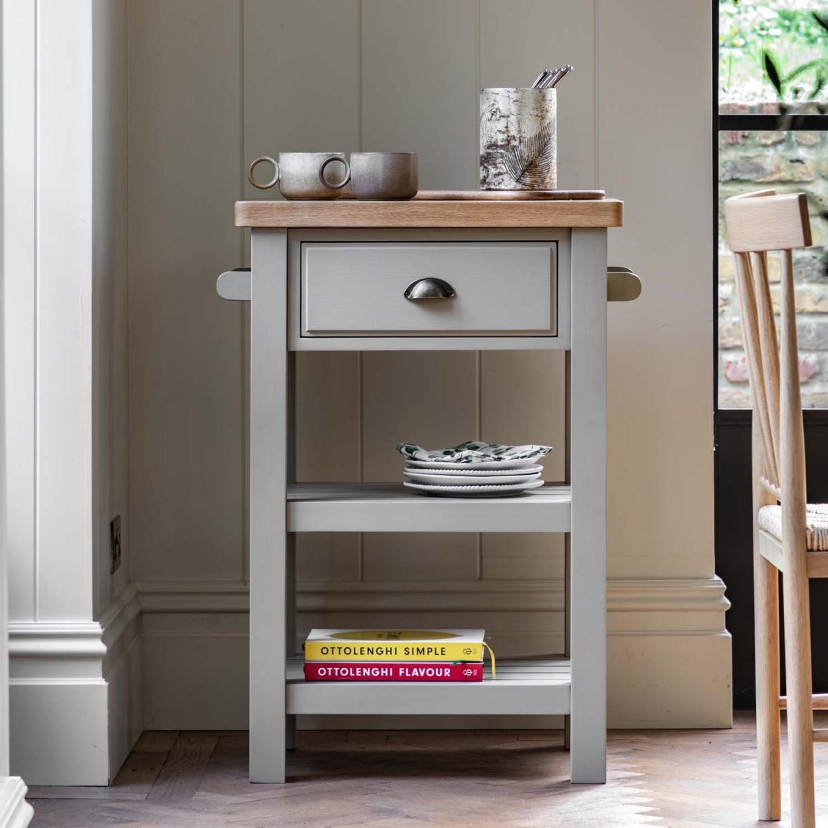 The Harrogate butchers block provides extra workspace and storage to your kitchen. The solid oak worktop is durable enough for daily use, making it a practical addition to any prep space. With two shelves, a drawer for all of your chopping accessories, and a convenient hanging rail ideal for a tea towel, this unit introduces succinct practicality to classic style. A hand painted base and metal drawer handles make an otherwise traditionally styled butchers block a more contemporary choice. Also available in meteor, moss, or clay varieties to suit any kitchen décor.