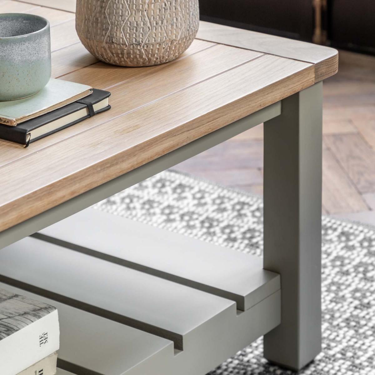This Harrogate coffee table is the quintessential combination of rustic and contemporary design styles. Simplicity at its finest, this coffee table showcases clean lines and matte hand-painted wood. The storage shelf underneath is ideal for storing books or magazines, making the table a practical choice as well as stylish. Strikingly detailed with a grooved planked oak top, the Harrogate collection effortlessly unites farmhouse and modern style. Available in this light 'prairie' shade or a darker version dubbed 'meteor', the neutrality of this coffee table will make for a perfect addition to your living space.