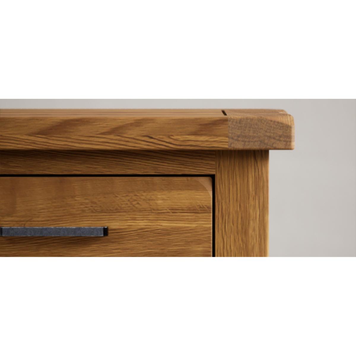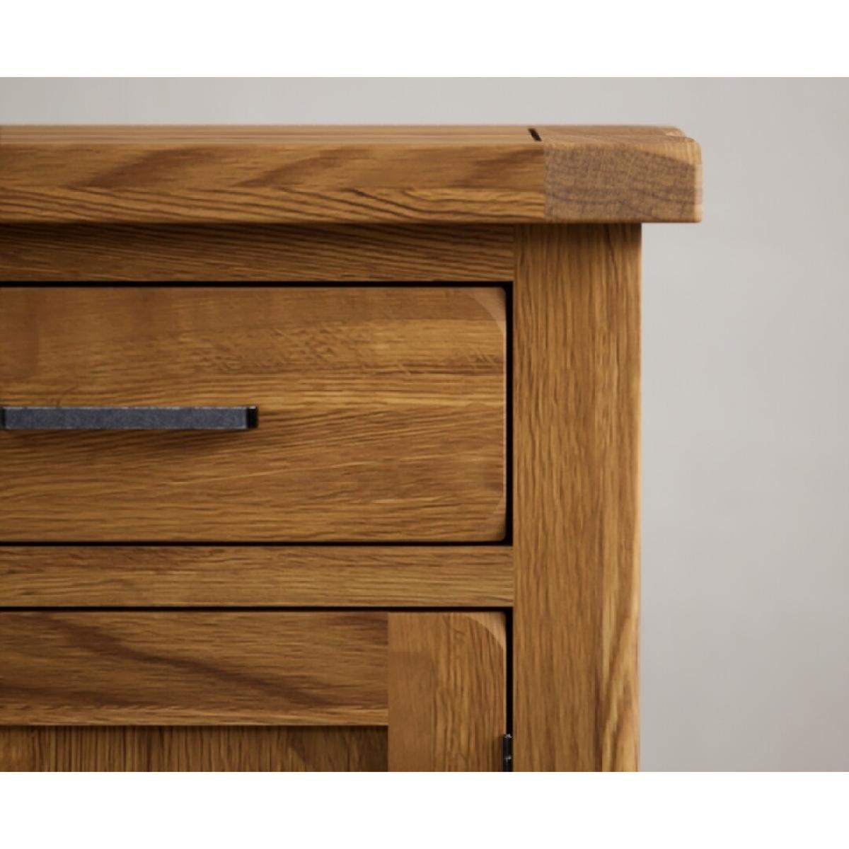 The Harrogate Rustic Solid Oak Small Sideboard is crafted from 100% solid oak with a rustic finish and features dovetail drawers with wooden runners and metal handles.