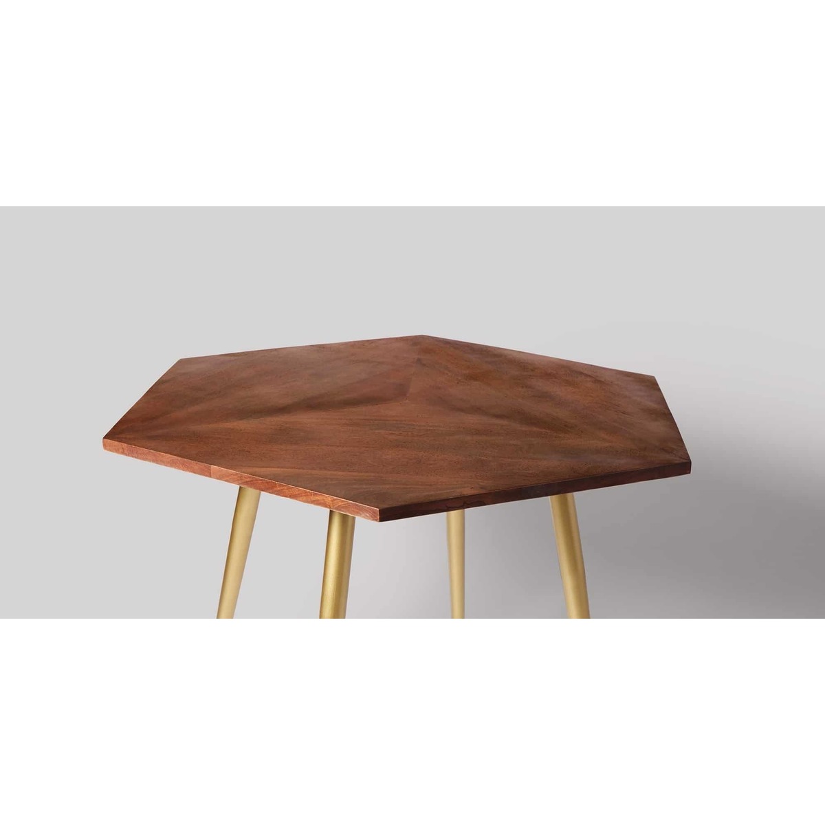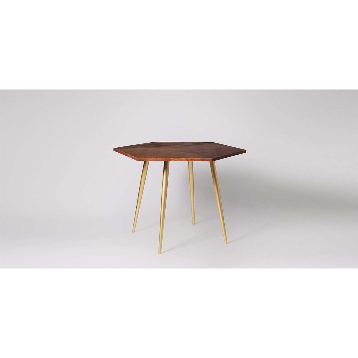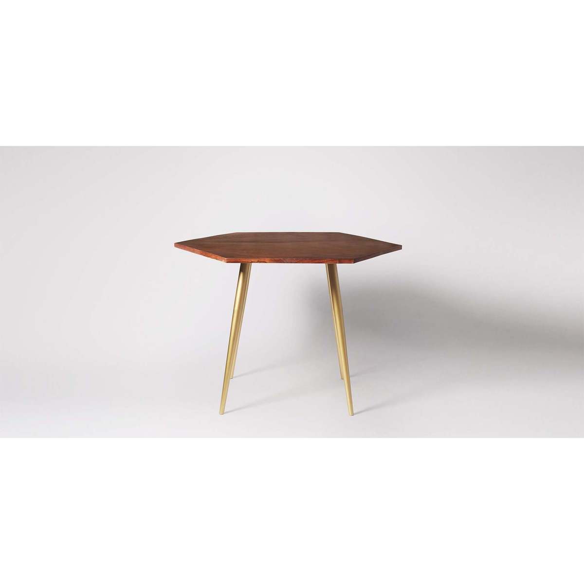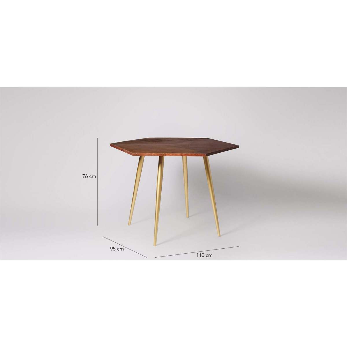 ?The most practical table you never knew you needed, masquerading only as a beautiful design. Because even original furniture can multitask.?Wave goodbye to the personal space invasions of the past – dining table territory is firmly established with the Harron. Its hexagonal shape borrows the social element from round tables, yet each edge marks your own spot – meaning it's great for groups of two, three, four and six (the common denominators – remember Year 8 Maths?).?Fine, tapered brassy legs light up a muted interior – while natural wood grain from a solid timber tabletop adds depth.
