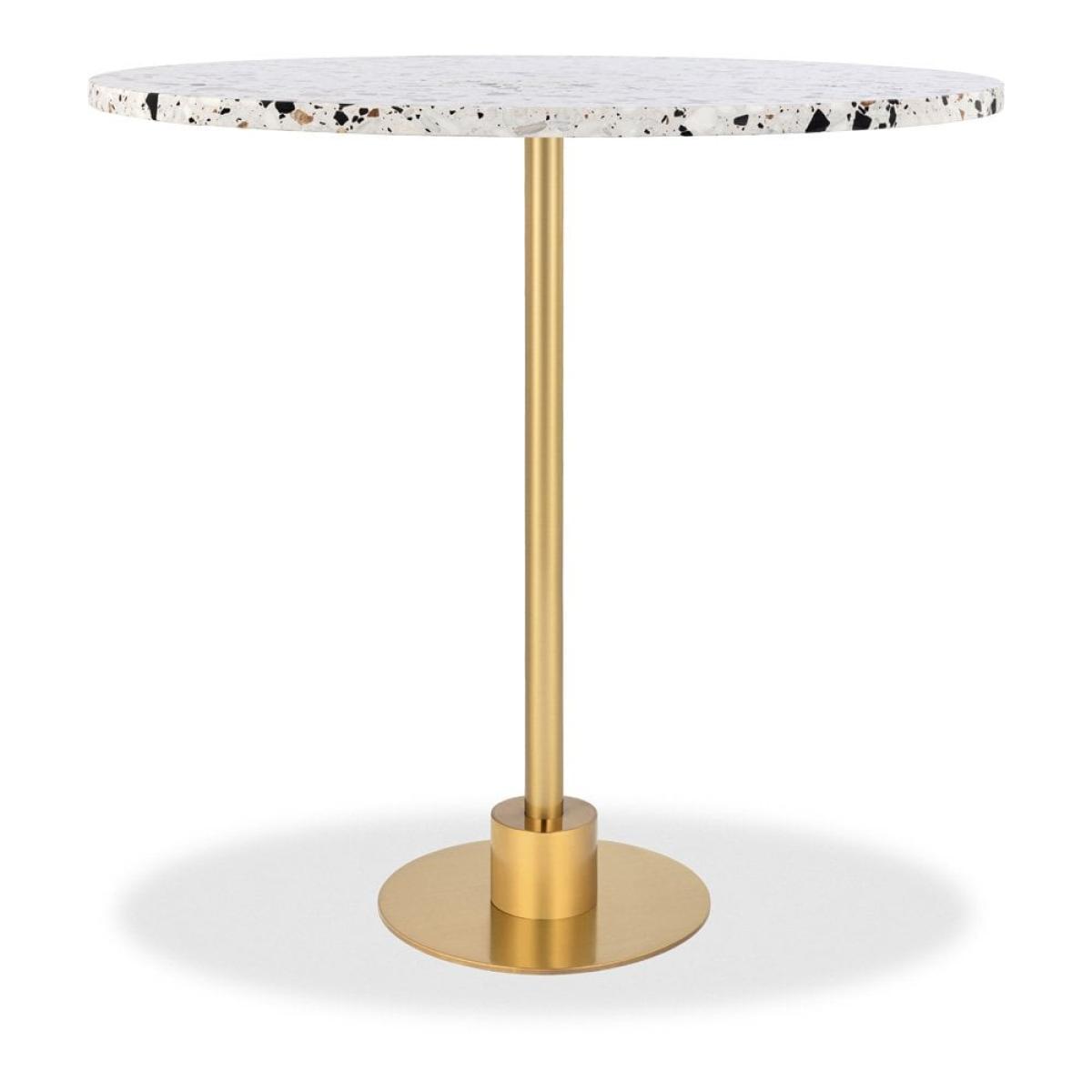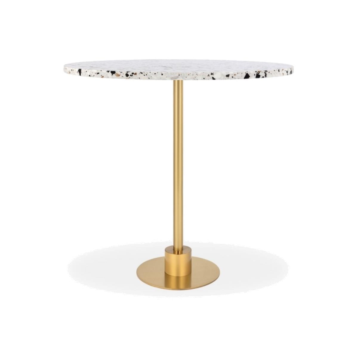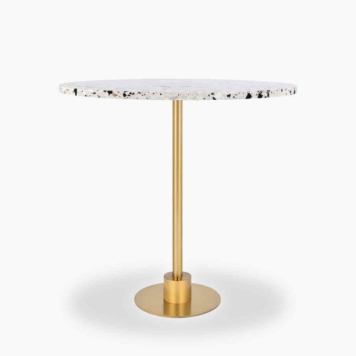 Meet the Harrow bar table. Accommodating 2 to 4 people, the Harrow blends the round white terrazzo tabletop with a brass pillar stand, attached to a round flat metal base - creating a contrast that will instantly elevate any contemporary dining space. Available in two tabletop sizes, our Harrow round bar table makes a stylish addition to any kitchen or bar while creating the ultimate dining experience when teamed with dining chairs and pendant lights of your choice. And if you buying for business? You can head to our Trade Team for more details. Please note: The table requires assembly, which includes drilling holes into the tabletop. Doing so is a simple process we have detailed below: The tabletop has a wooden underside that can be lined up with the base. Drill small guide holes into the wood and then drill in the inserts. Attach the tabletop to the base with the 10mm bolts we have provided. View The Harrow Range