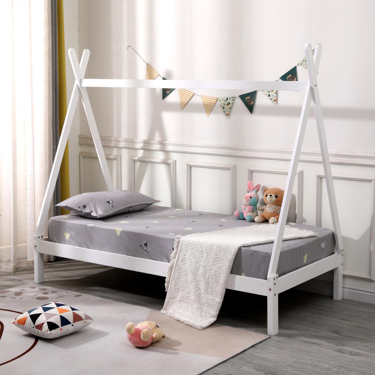 The Harry Kids Wooden Teepee Tent Bed is a fun hideaway for your childs bedroom. Featured in our Slumber. Worx® collection, this pine bed frame has solid wooden slats and features novelty crossover framework, inspired by Teepee style tents. Allow your child's imagination to take flight by draping fabric and attaching toys or fairy lights to create a cosy space inside. As the bed sits low to the ground, it can also be used as a play environment or a reading nook. Available in Grey or White, this wooden bed frame can be easily decorated to suit any theme. Includes a 'Dream. Eco' 10cm Deep Eco-Friendly Comfort Foam Mattress.