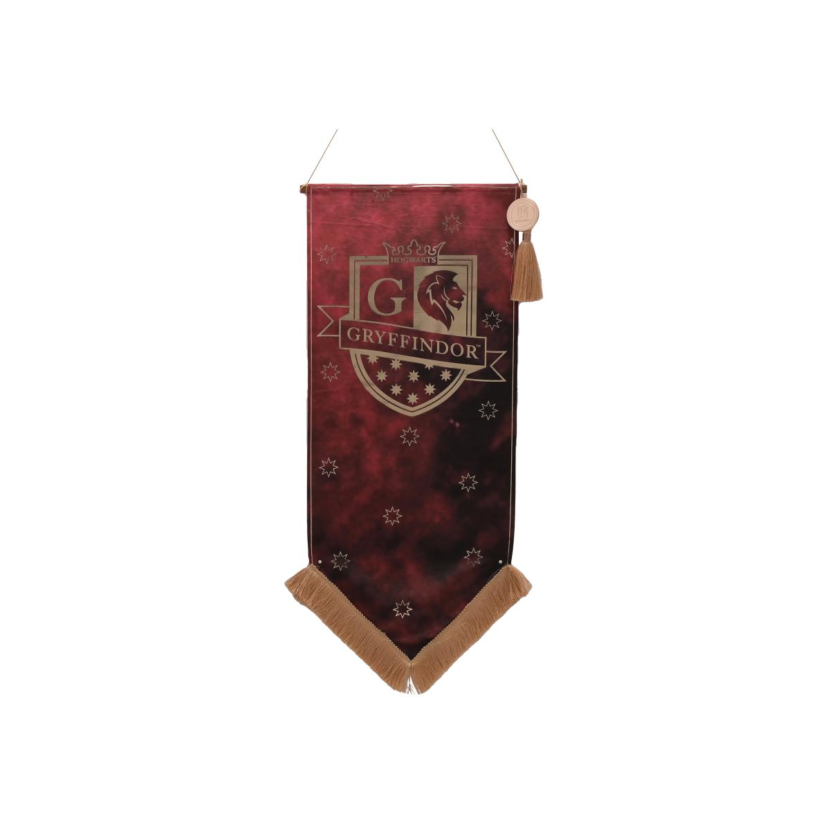 * " Gryffindor" Motif* Made from High-Quality Fabric* Features Gold Edging & Trim* Includes Attached Thread Hanger Show off your Gryffindor pride with this red fabric banner, adorned with gold edging and a bold “Gryffindor” logo. Featuring gold trim detailing and an iconic Hogwarts stamp, it’s a striking piece to hang with the attached thread hanger—perfect for any brave heart.