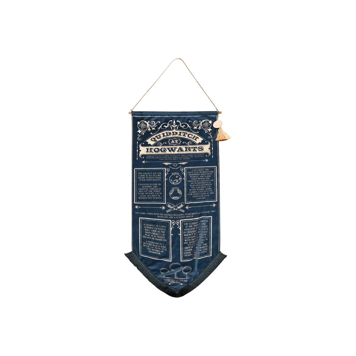 * Quidditch Inspired Design* High-Quality, Luxurious Fabric* Beautiful Gold Detailing* Stylish Gold Tassel Meet the Harry Potter Quidditch Hanging Banner, perfect for Harry Potter fans who are both enchanted and excited by the game of Quidditch. Featuring luxurious fabric, the blue banner showcases gold edging, gold lettering and illustrations explaining the rules of Quidditch, complete with a gold tassel and ‘Hogwarts stamp’ embellishment.