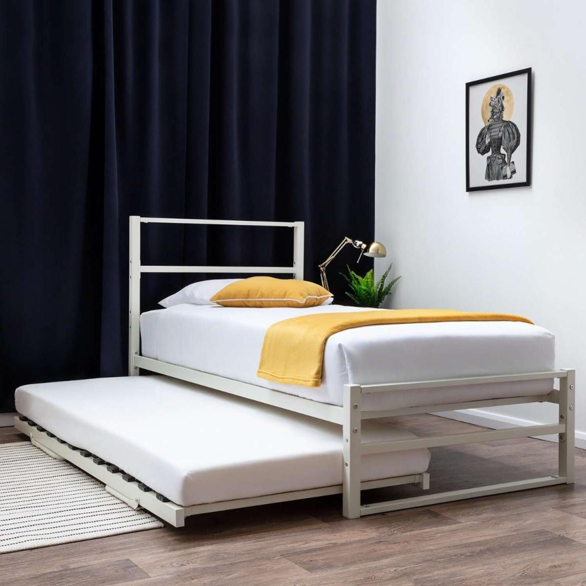 The Hartfield is a simple contemporary style white metal bed frame with a modern sleek design. The parallel metal bars create a square and sleek contemporary bed frame that is versatile enough to suit any bedroom decor. The trundle folds out into a single bed ready for use, then it simply folds back again, and rolls away under the bed when not in use making it a great space saver. Note Due to the nature of the trundle bed we recommend a mattress no greater than 15cm in depth. The trundle is intended to be used as a separate bed, and not put against the main bed.