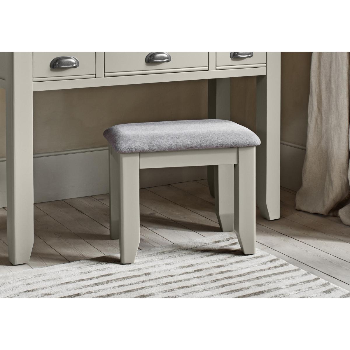 Stylish, beautifully crafted and with so many clever storage features, our painted wood Hartley collection is so easy to love. The range’s bed frame, available in three sizes, combines the beauty of wood, an on-trend soft grey painted finish and, unusually for a wooden bed frame, two deep drawers that make light work of keeping your bedroom free of clutter. Coordinating pieces include bedside cabinets, chests of drawers and a dressing table, all of which showcase the range’s signature grey painted look and metal cup handles. And with the addition of the Hartley wardrobe, you can create the perfect painted wood bedroom look. Part of our Furnitureland collection, the Hartley range is exclusively available at Furniture Village. With its soft grey finish, the Hartley dressing table stool is painted wood furniture done right. Superb quality, exceptional craftsmanship and a lovely look for any bedroom. Why you'll love it Love the painted wood look? You’ll love our Hartley collection. This dressing table stool has a soft grey painted finish. The cushioned seat is upholstered in a matching grey fabric. Designed to pair with the Hartley dressing table. Beautifully crafted – everything about this bedroom stool feels sturdy and substantial. Perfect for any style of bedroom, from modern country to coastal chic. Exclusively available at Furniture Village. This dressing table stool is part of the Furnitureland Hartley range. What you need to know Made of acacia wood. No two pieces of wood or veneer are the same. Variations in colour will occur. Avoid placing in direct sunlight or close to a heat source. We recommend using coasters and placemats at all times. Wipe clean with a damp cloth and then dry using a soft duster. Do not use silicon-based furniture polish or abrasive cleaners. Create your dream modern country bedroom with furniture from the Hartley range. Item code: HARTDSTL--001