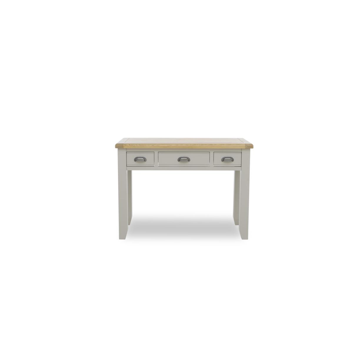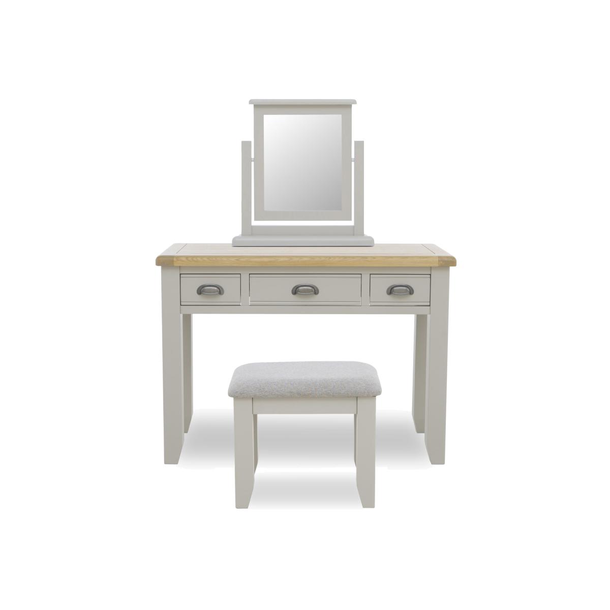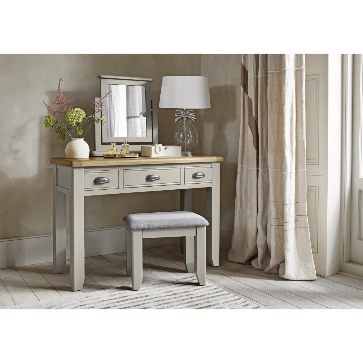 Stylish, beautifully crafted and with so many clever storage features, our painted wood Hartley collection is so easy to love. The range’s bed frame, available in three sizes, combines the beauty of wood, an on-trend soft grey painted finish and, unusually for a wooden bed frame, two deep drawers that make light work of keeping your bedroom free of clutter. Coordinating pieces include bedside cabinets, chests of drawers and a dressing table, all of which showcase the range’s signature grey painted look and metal cup handles. And with the addition of the Hartley wardrobe, you can create the perfect painted wood bedroom look. Part of our Furnitureland collection, the Hartley range is exclusively available at Furniture Village. With its soft grey finish, the Hartley dressing table, mirror and stool set is painted wood furniture done right. Superb quality, exceptional craftsmanship and a lovely look for any bedroom. Why you'll love it Love the painted wood look? You’ll love our Hartley collection. The pieces in this dressing table set have a soft grey painted finish. Set includes a dressing table, a mirror and a stool. The 3-drawer dressing table has a contrasting oak and oak veneer top. Drawers have metal cup handles. The mirror tilts within a frame. Attaches to the dressing table or can be freestanding. Dressing table stool has a cushioned seat upholstered in a grey fabric. Beautifully crafted – everything about this dressing table set feels sturdy and substantial. Perfect for any style of bedroom, from modern country to coastal chic. Exclusively available at Furniture Village. This dressing table set is part of the Furnitureland Hartley range. What you need to know Dressing table has an acacia wood frame, and an oak and oak veneer top. Mirror and stool are made of acacia wood. No two pieces of wood or veneer are the same. Variations in colour will occur. Avoid placing in direct sunlight or close to a heat source. We recommend using coasters and placemats at all times. Wipe clean with a damp cloth and then dry using a soft duster. Do not use silicon-based furniture polish or abrasive cleaners. Create your dream modern country bedroom with furniture from the Hartley range. WARNING! Item code: HARTDRSS--001