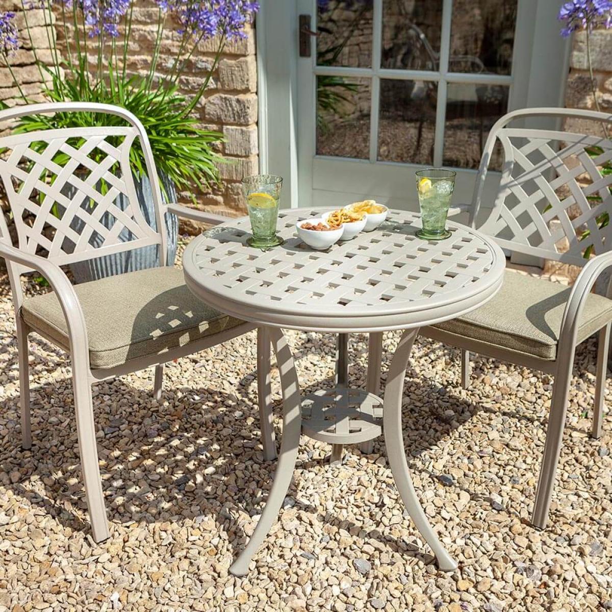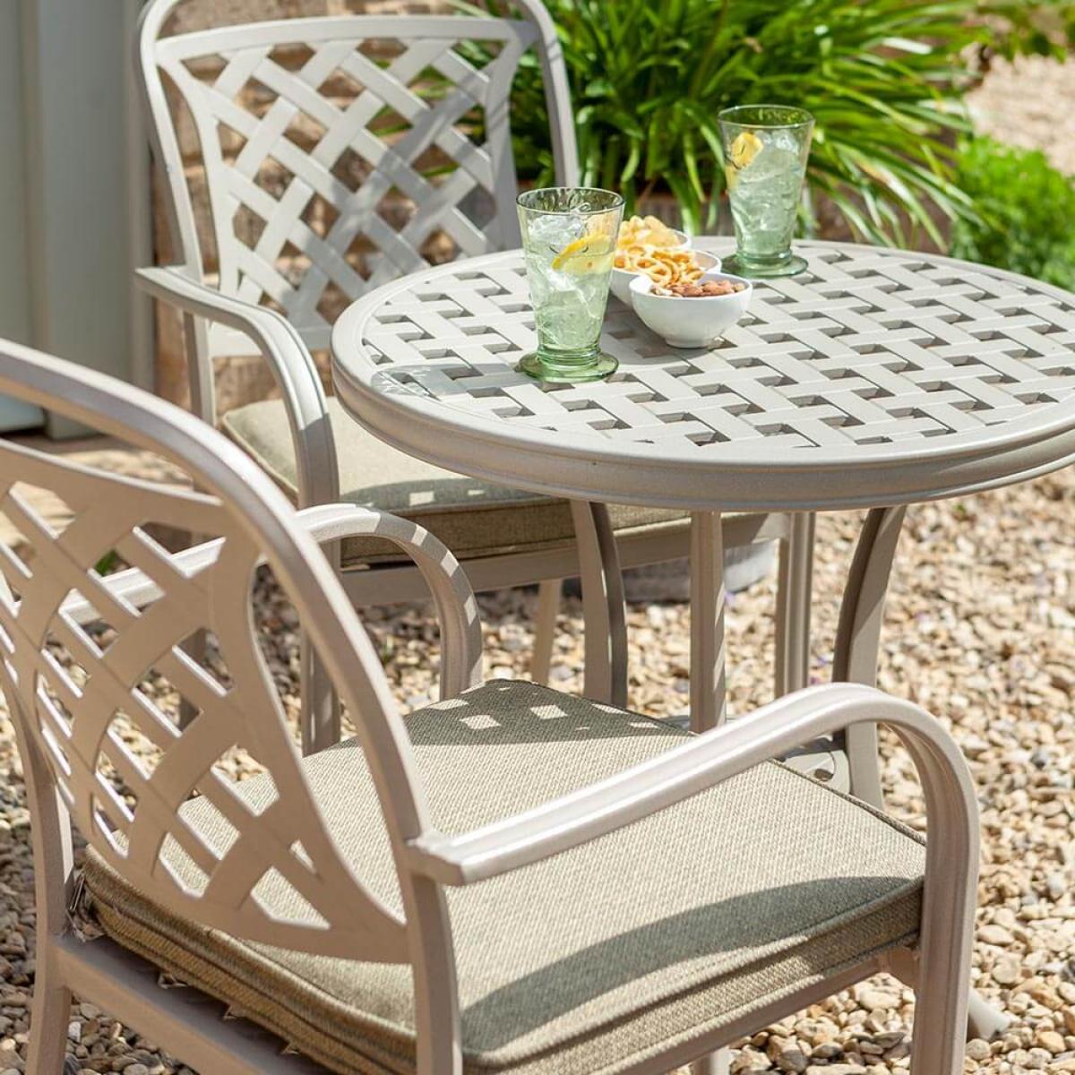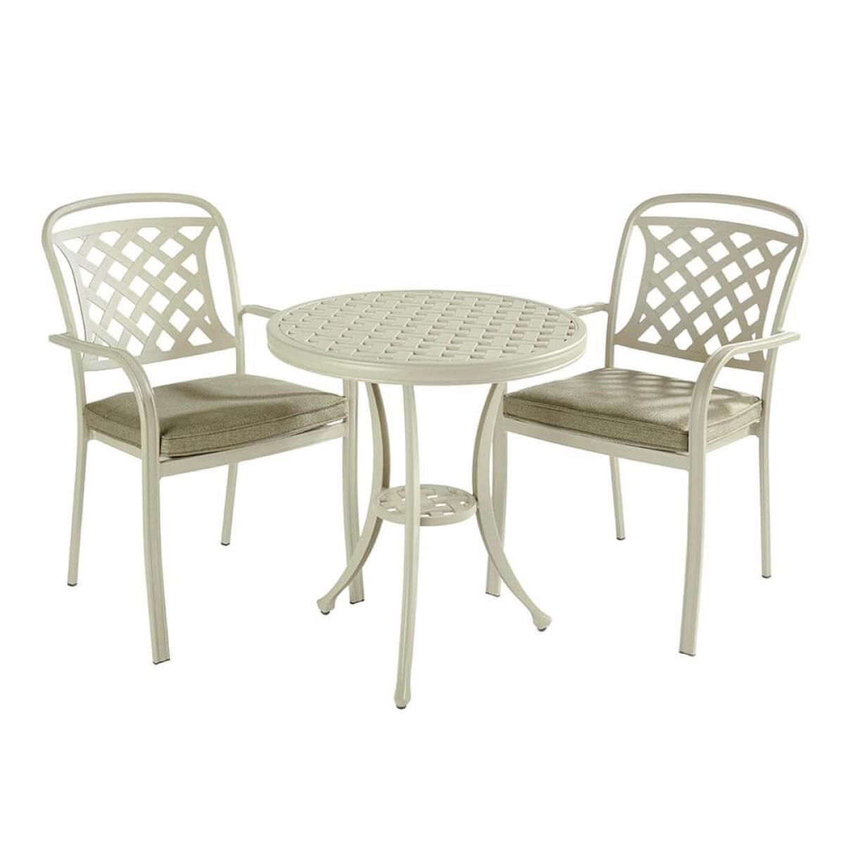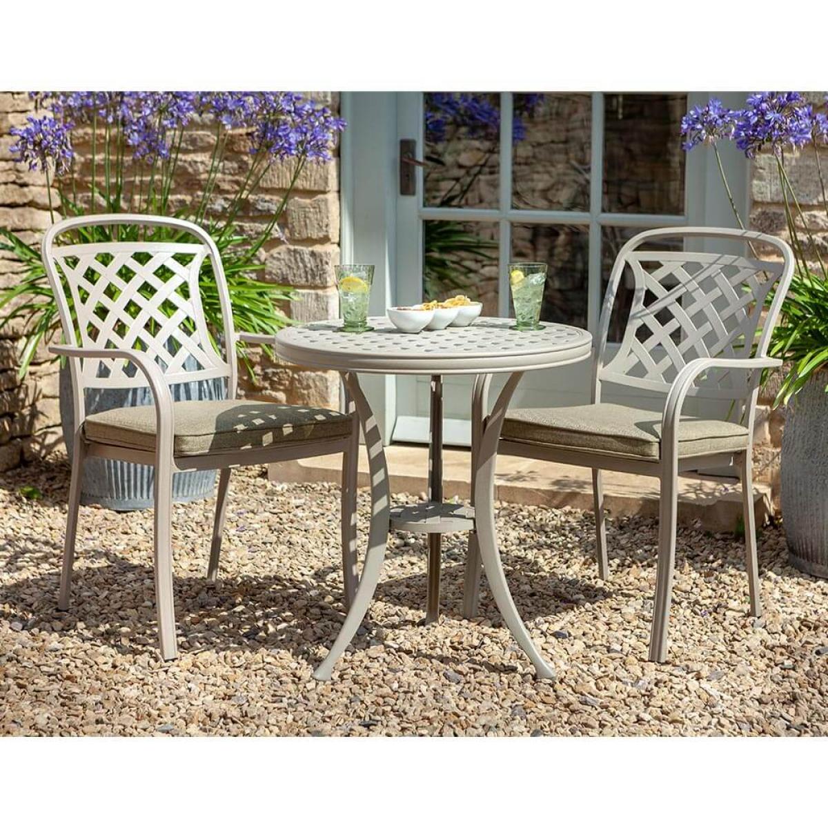 Set consists of:. About:. The Hartman Berkeley garden bistro set provides a fantastic casual seat pairing for smaller spaces, and balconies especially. Although it would also work just as nicely on lawns or wider expanses of decking and paving. This tasteful cast aluminium garden furniture set offers all the benefits of aluminium furniture with much of the appeal of the classic feeling material, but handsomely updated for modern gardens with a flat weave lattice design. The colour selected represents a new shade for Inside. Out Living, offering gardens a lovely pale grey maize to complement many homes. More practically speaking aluminium is hugely durable and climate resistant by nature. The Berkeley dining chairs are the same seen in a number of dining sets in the range, and therefore if owning any dining options from the collection they can easily supplement. This Hartman Berkeley bistro set comes with two plush deep fill cushions that give a comfortable seating experience. These cushions boast Weatherready® wheatgrass colour covers, the microfibre system repels lighter showers and flash downpours, and allowsanything heavier to simply pass through the permeable layers drying naturally over time – local conditions dependent. For best care store these cushions inside during the winter months. This set will be prime for elevenses or aperitifs with a partner. Key features:. Although cast aluminium furniture is by nature resistant and ready for the outdoors to best shield your furniture from tree debris, bird droppings or simply to keep it tidied away we recommend the use of a protective cover, below is a link to the specific fitting Hartman protective cover to be purchased separately:.