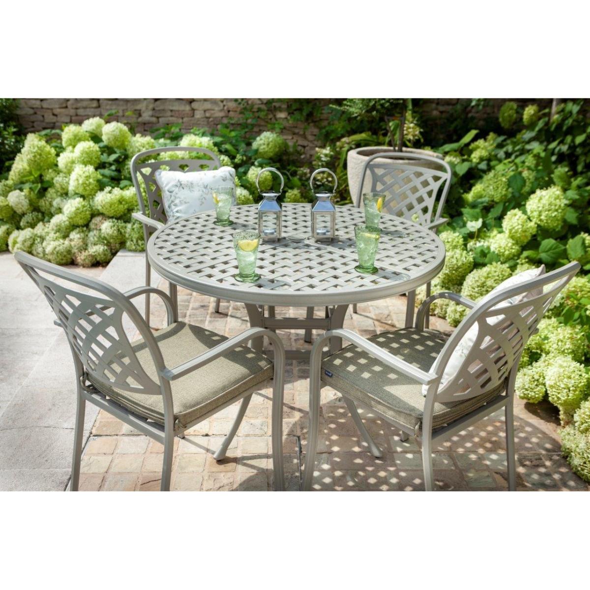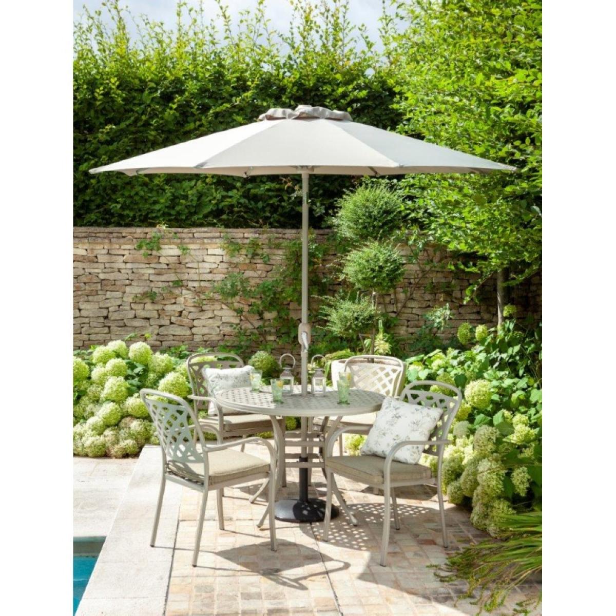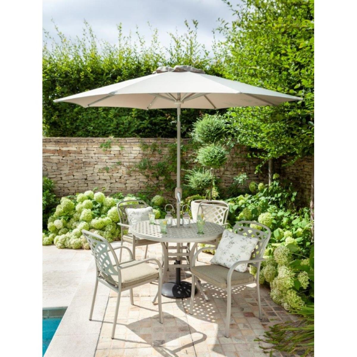 Alfresco dining couldn’t be more stylish with the smooth contemporary lattice of the Berkeley range from Hartman. Crafted from cast aluminium this furniture is durable, attractive and has great strength and value at its heart. The table and chairs can be left in the garden looking beautiful all year long, whilst the permeable Weatherready® cushions can be left outside in summer months - allowing you to make the most of the season. Set includes: 1 x Round Dining Table, 4 x Dining Chairs, 2.5m Round Traditional Parasol (UPF50+ Certified with free storage cover) and 15kg Concrete Base (not suitable on some composite decking - check with your manufacturer) KEY FEATURES: Weatherready® cushions are hardwearing & easy to clean, store away in Autumn & Winter Cushions have ties to secure into place Chairs are fully assembled and are stackable Table requires simple top and base assembly - all fittings supplied Adjustable table feet to ensure perfect positioning on uneven surfaces Crafted from coated cast aluminium; rust free, lightweight, strong, durable & low maintenance The furniture can be left outside all year round - except cushions Protect and extend the life of your furniture by using a cover - remove cushions if being covered for prolonged periods (to prevent mould and mildew build-up) Five years limited manufacturer warranty Frame Colour:Maize Cushion Colour: Wheatgrass DIMENSIONS: Table:H 75cm x Diameter 107cm Chair: H 90cm x W 54cm x D 63cm. Seat Height: 48cm, Arm Height: 64cm Base: H 35cm x W 45cm x D 45cm Please note, all screens vary in colour reproduction and whilst every effort has been made to display the colour as accurately as possible it is for guidance only.