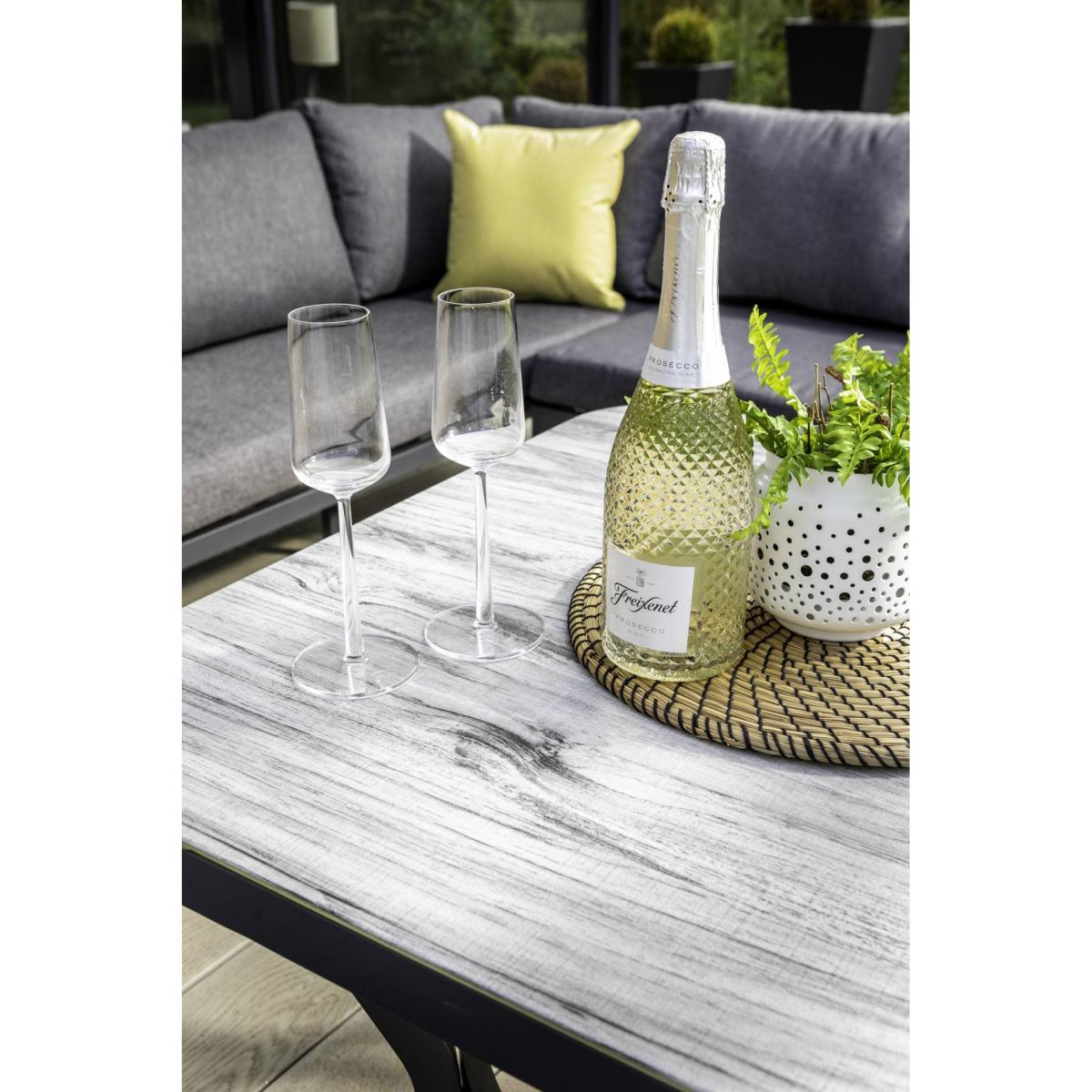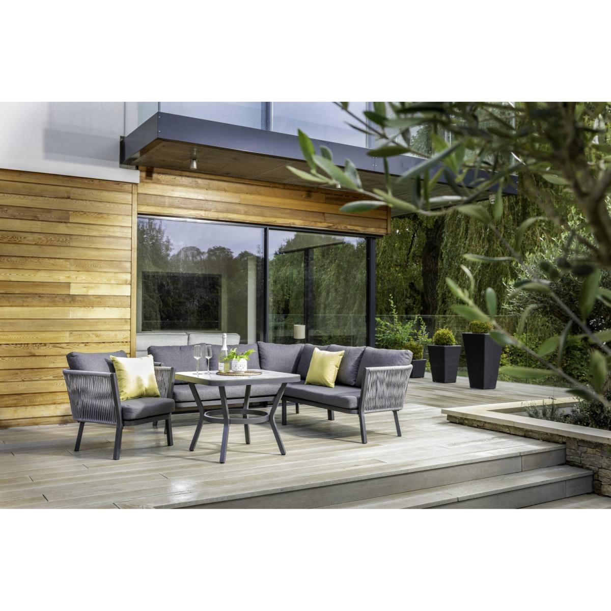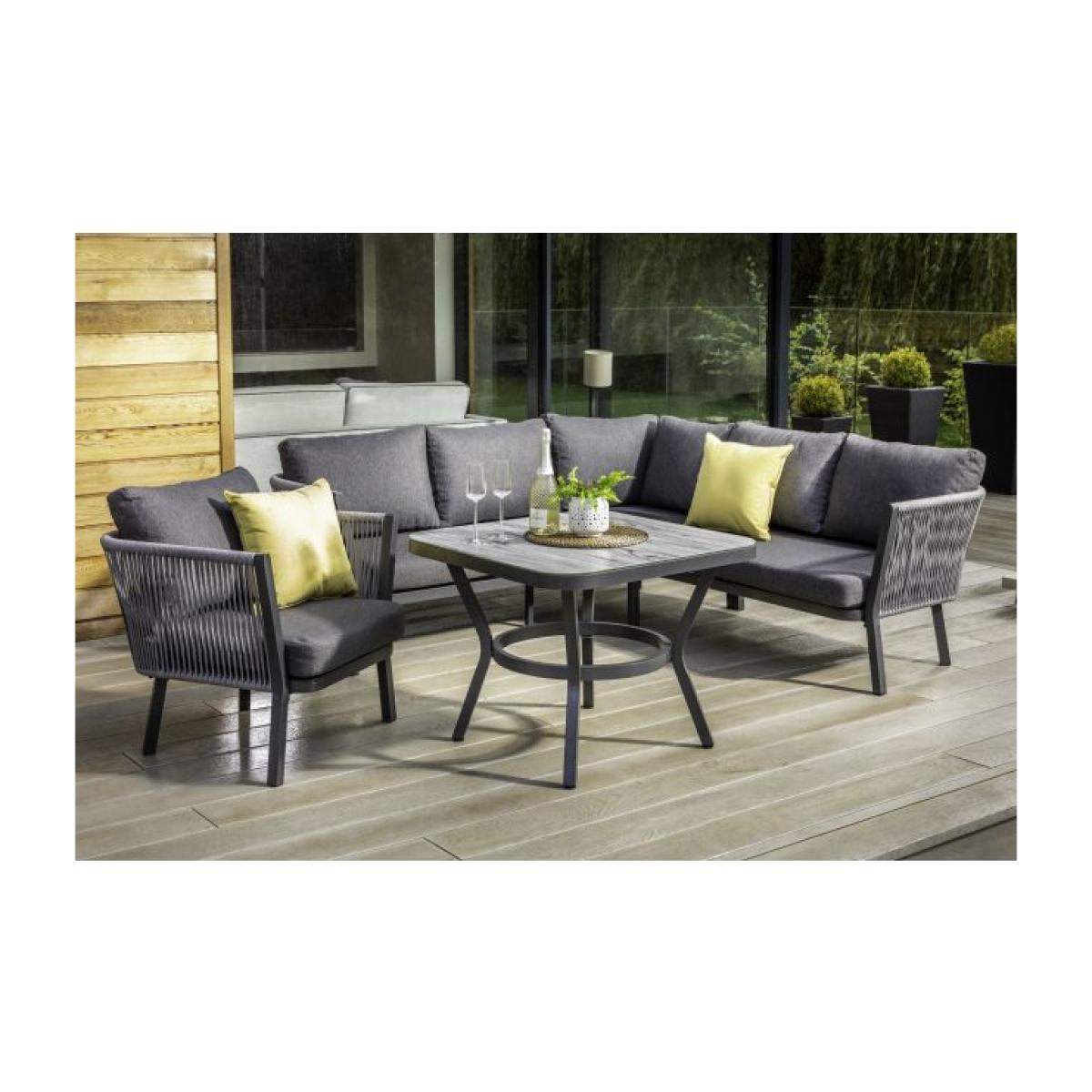 The Dubai Square Corner Dining Set from Hartman oozes opulence with design conscious fashionable garden furniture that will make a statement in any garden setting. Fashioning a modern rope design, coupled with Hartman's stunningly unique Weathered Teak effect Tuscan Ceramic glass tabletop that is both practical and beautiful, tempered for safety reassurance, easy to clean and scratch resistant for durability. This statement set sits up a minimum of 5 people with its corner sofa and lounge chair that come with luxurious padded cushions that are all finished with permeable Weatherready technology that offers reassurance during the unpredictable British weather. Be prepared for the unpredictable British summer with Hartman's Weatherready slate-coloured permeable cushions. During the summer showers, the water-resistant fabric simply allows water to bead and run off the cushion. During heavier persistent rain the Weatherready technology allows water to penetrate through the cushions sewing seams. Any water that penetrates the surface will flow through the permeable fibres, fully exiting through the mesh base beneath. Drying time will vary depending on local conditions. Come rain or shine, Hartman Weatherready cushions can be left outside all summer long. We do recommend they are stored away in a clean, dry garage or outbuilding during autumn and winter. Cushions should also be removed if being covered for prolonged periods (to prevent mould and mildew build-up). The Dubai's frame is crafted from aluminium, which is rust free, lightweight, strong and durable, requiring little maintenance. The arms and seat backs are finished in a modern all-weather rope design. Protect and extend the life of your furniture by using a Hartman cover designed specifically for this set. Set includes: 1 x Square Casual Dining Table, 1 x Right-Hand Sofa, 1 x Left-Hand Sofa, 1 x Lounge Chair Table Dimensions: Height 67cm x Width 80cm x Length 80cm Corner Sofa Unit: Height 67cm x Width 192cm x Depth 192cm Lounge Chair: Height 67cm x Width 77cm x Depth 71cm, Seat Height: 43cm, Arm Height: 67cm This set has a footprint of 2m x 2.7m Simple assembly is required, and all fittings are supplied This product has a three-year limited manufacturer's warranty All screens vary in colour reproduction and whilst every effort has been made to display the colour as accurately as possible it is for guidance only.