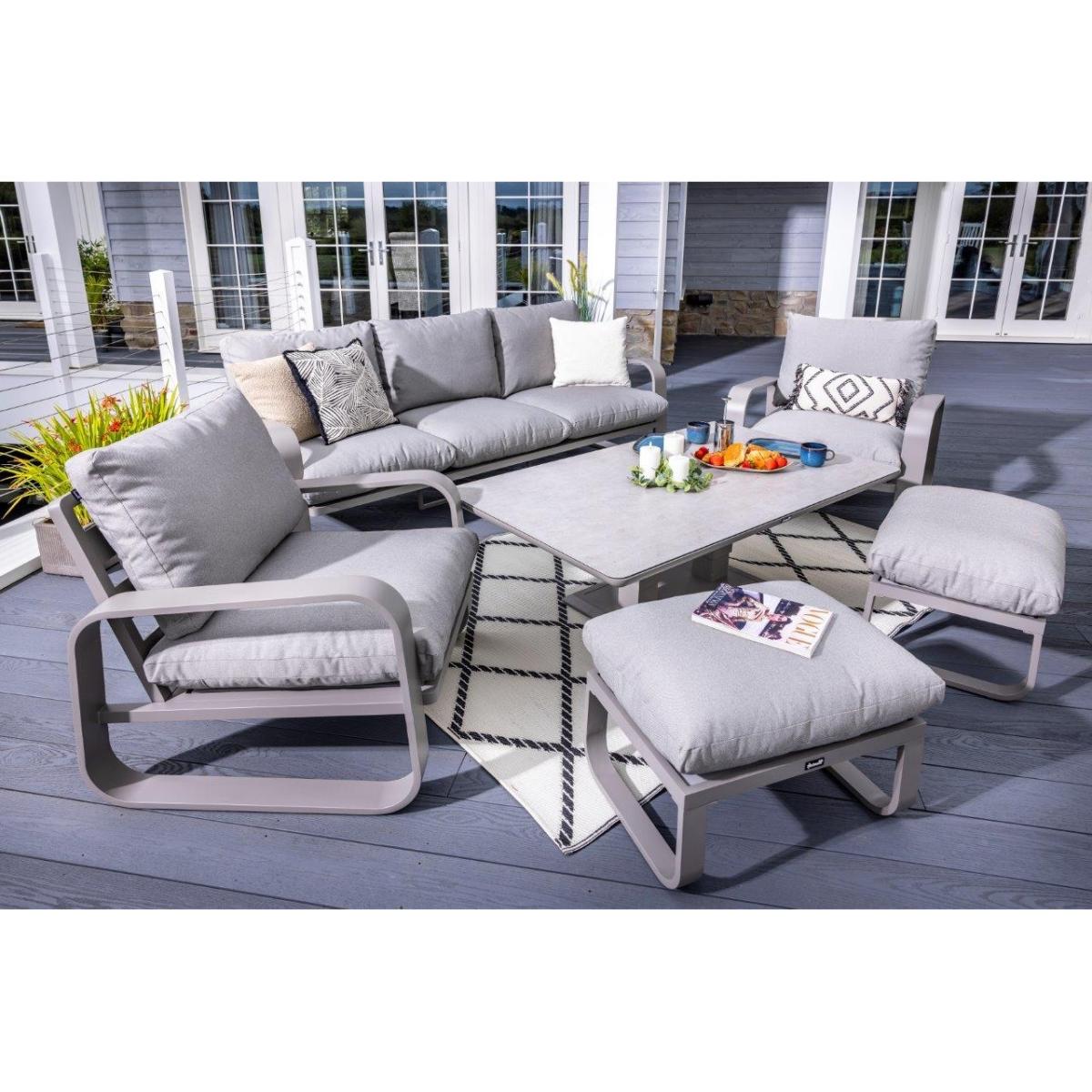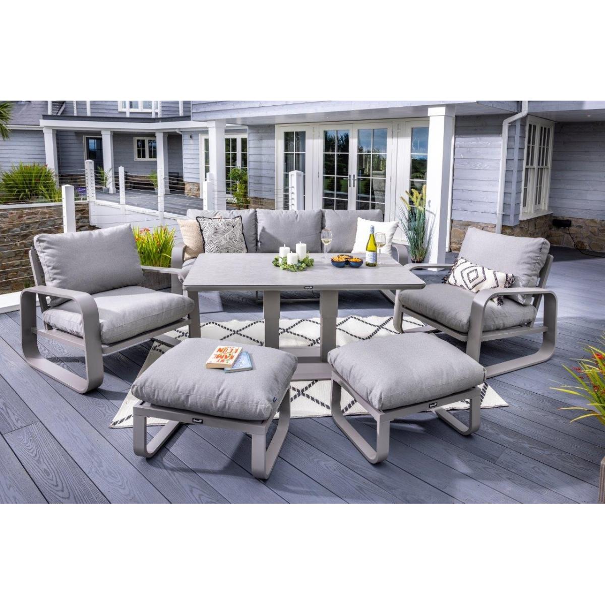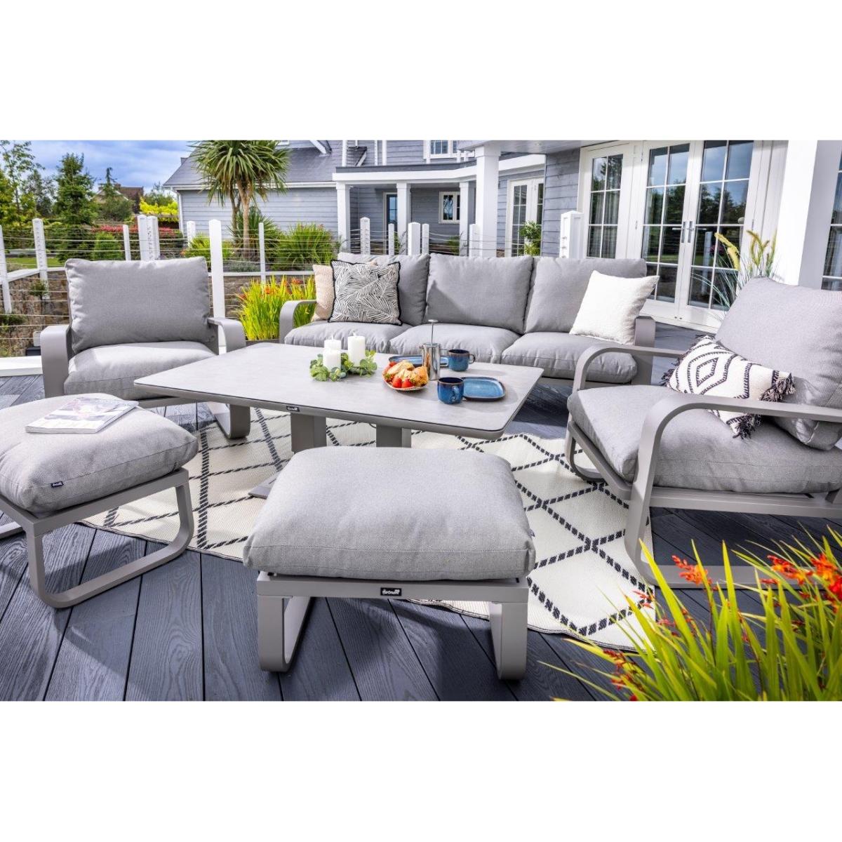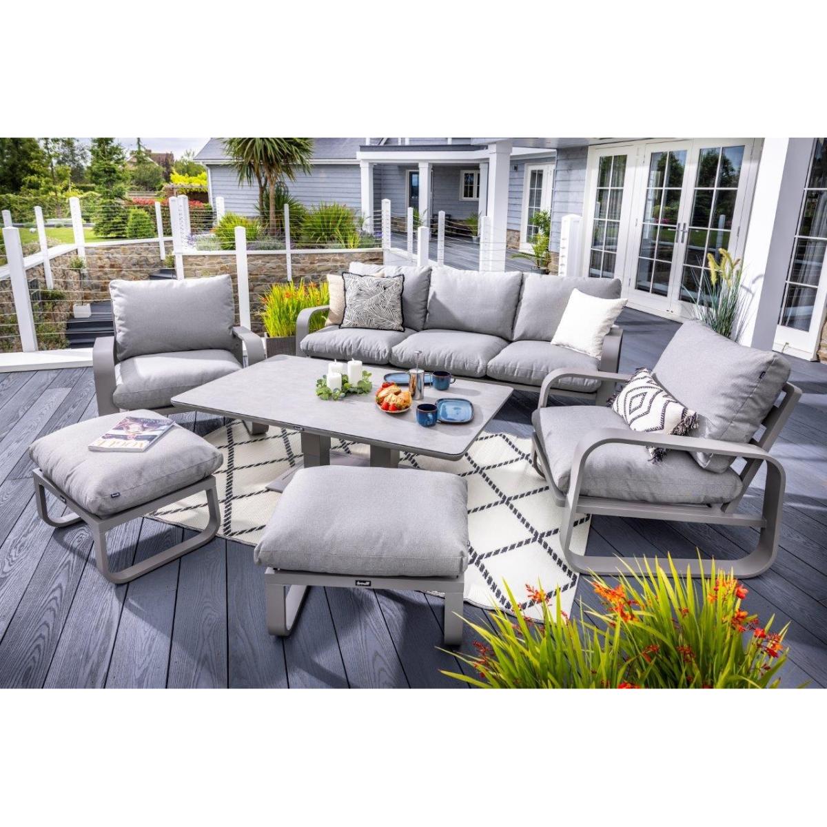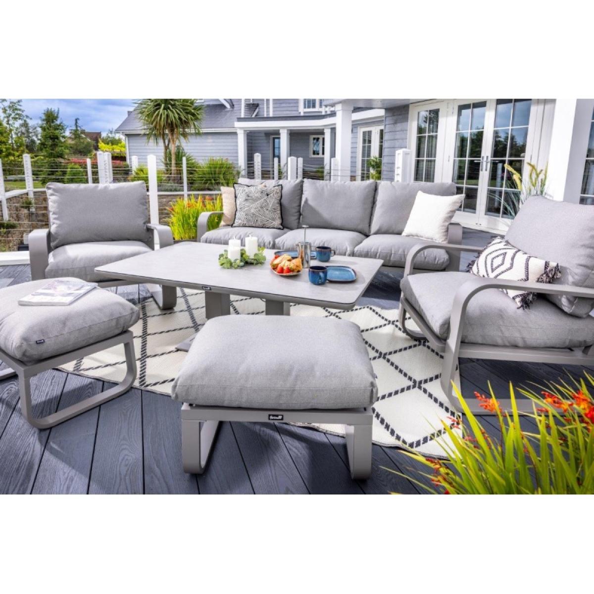 Reimagine your outdoor space as a tranquil and sophisticated haven with the stunning Halo 3 Seat Lounge Set. This stylish set includes a spacious and comfortable three seat sofa, two lounge chairs designed for the ultimate relaxation, and two versatile stools that can be used for additional seating or used as footrests, all featuring pewter ultra-comfy Weatherready® Cloud. Cushions® for maximum relaxation and durability in all weather conditions. The cushions are designed to be water resistant and quick drying, making them perfect for outdoor use. The sets curved taupe frame adds a sophisticated touch that seamlessly blends with any decor, enhancing the aesthetic appeal of your outdoor space. Additionally, the set includes an adjustable table with a taupe powder coated aluminium frame and patina Tuscan ceramic glass tabletop. This combination ensures the table is both lightweight and durable, making it easy to move and weather resistant for the unpredictable British weather. Assembly is required: This set requires self-assembly, all fittings are supplied. KEY FEATURES: Set includes: 1x 3 Seat Sofa, 1 x Rectangular Adjustable Table, 2 x Lounge Chairs, 2x Stools Tuscan Ceramic Glass is both practical and beautiful, tempered for safety, easy to clean, heat and scratch resistant Weatherready® Cloud. Cushions® are hardwearing & easy to clean, store away in Autumn & Winter Adjustable table feet to ensure perfect positioning on uneven surfaces Crafted from aluminium; rust free, lightweight, strong, durable & low maintenance Requires simple self-assembly - all fittings supplied The furniture can be left outside all year round - except cushions Protect and extend the life of your furniture by using a cover - remove cushions if being covered for prolonged periods (to prevent mould and mildew build-up) 3 years limited manufacturer warranty - register your warranty to extend to a 5 year warranty Frame Finish: Taupe Cushion Colour: Pewter Table Top Colour: Patina DIMENSIONS: Overall Footprint: 2.8m x 4m Adjustable Table: Height: 51cm or 74cm Width: 90cm Depth: 150cm 3 Seat Lounge Sofa: Height: 83cm Width: 93cm Depth: 230cm Lounge Chair: Height: 83m Width: 93cm Depth: 90cm Stool: Height: 30.5m Width: 48cm Depth: 65cm Please note, all screens vary in colour reproduction and whilst every effort has been made to display the colour as accurately as possible it is for guidance only. Scatter cushions and accessories pictured are for demonstration purposes only and are not included.