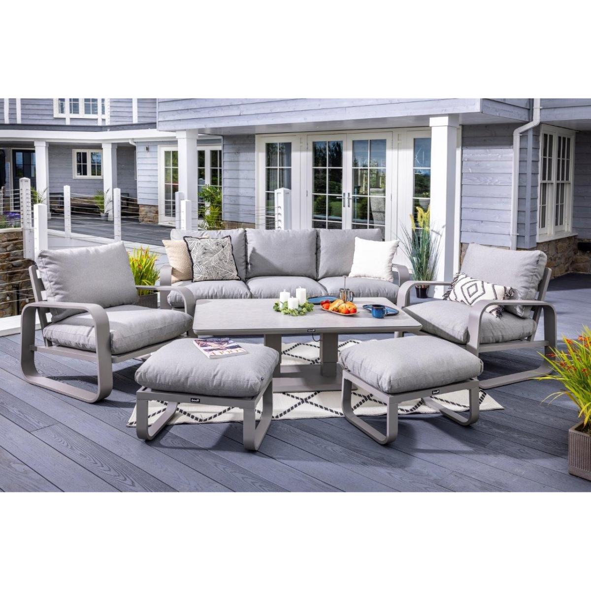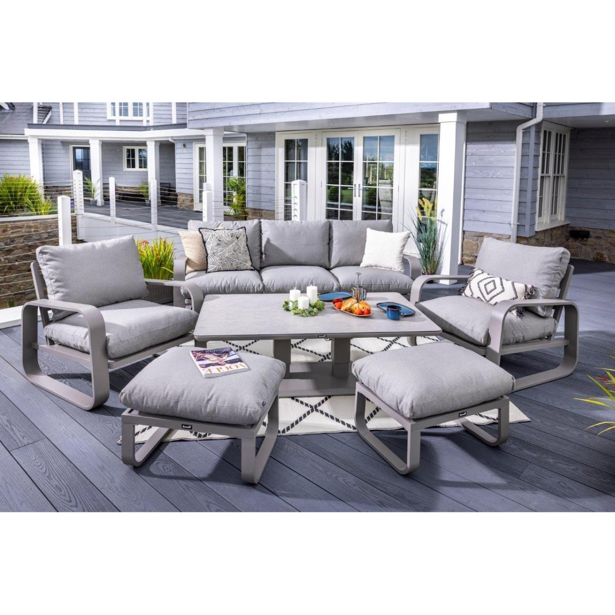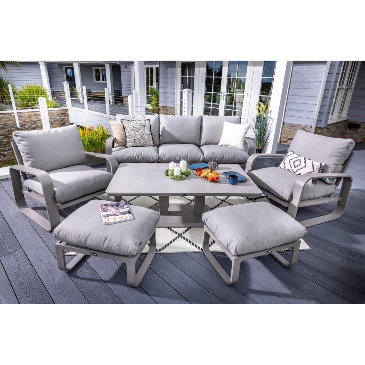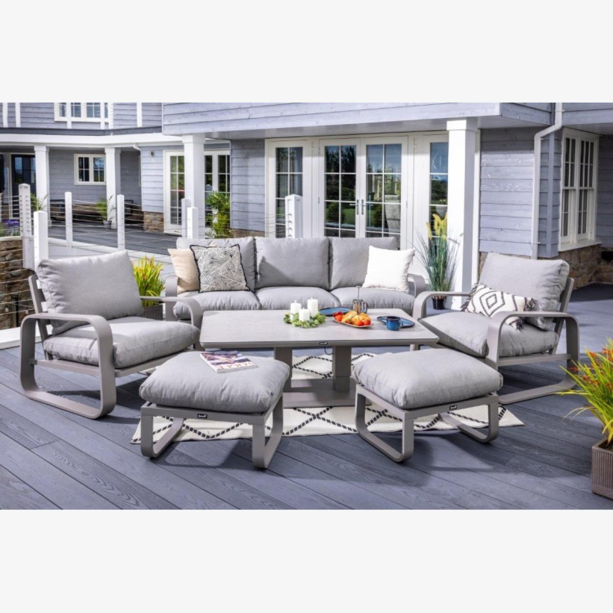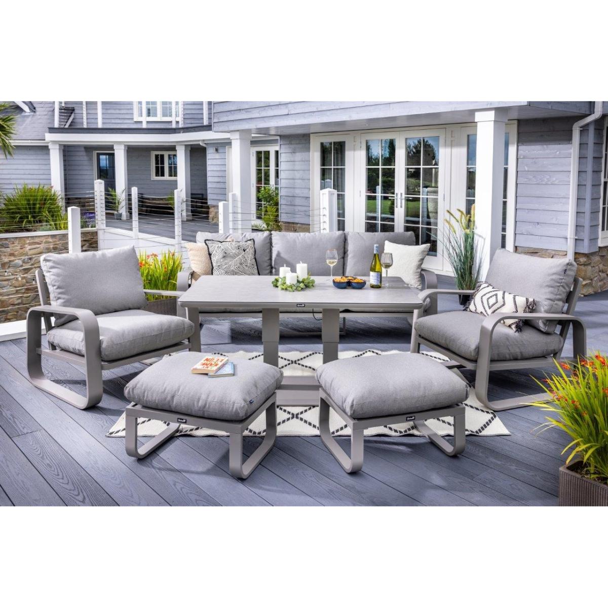 Reimagine your outdoor space as a tranquil and sophisticated haven with the stunning Halo 3 Seat Lounge Set. This stylish set includes a spacious and comfortable three seat sofa, two lounge chairs designed for the ultimate relaxation, and two versatile stools that can be used for additional seating or used as footrests, all featuring pewter ultra-comfy Weatherready® Cloud. Cushions® for maximum relaxation and durability in all weather conditions. The cushions are designed to be water resistant and quick drying, making them perfect for outdoor use. The sets curved taupe frame adds a sophisticated touch that seamlessly blends with any decor, enhancing the aesthetic appeal of your outdoor space. Additionally, the set includes an adjustable table with a taupe powder coated aluminium frame and patina Tuscan ceramic glass tabletop. This combination ensures the table is both lightweight and durable, making it easy to move and weather resistant for the unpredictable British weather. Assembly is required: This set requires self-assembly, all fittings are supplied. KEY FEATURES: Set includes: 1x 3 Seat Sofa, 1 x Rectangular Adjustable Table, 2 x Lounge Chairs, 2x Stools Tuscan Ceramic Glass is both practical and beautiful, tempered for safety, easy to clean, heat and scratch resistant Weatherready® Cloud. Cushions® are hardwearing & easy to clean, store away in Autumn & Winter Adjustable table feet to ensure perfect positioning on uneven surfaces Crafted from aluminium; rust free, lightweight, strong, durable & low maintenance Requires simple self-assembly - all fittings supplied The furniture can be left outside all year round - except cushions Protect and extend the life of your furniture by using a cover - remove cushions if being covered for prolonged periods (to prevent mould and mildew build-up) 3 years limited manufacturer warranty - register your warranty to extend to a 5 year warranty Frame Finish: Taupe Cushion Colour: Pewter Table Top Colour: Patina DIMENSIONS: Overall Footprint: 2.8m x 4m Adjustable Table: Height: 51cm or 74cm Width: 90cm Depth: 150cm 3 Seat Lounge Sofa: Height: 83cm Width: 93cm Depth: 230cm Lounge Chair: Height: 83m Width: 93cm Depth: 90cm Stool: Height: 30.5m Width: 48cm Depth: 65cm Please note, all screens vary in colour reproduction and whilst every effort has been made to display the colour as accurately as possible it is for guidance only. Scatter cushions and accessories pictured are for demonstration purposes only and are not included.